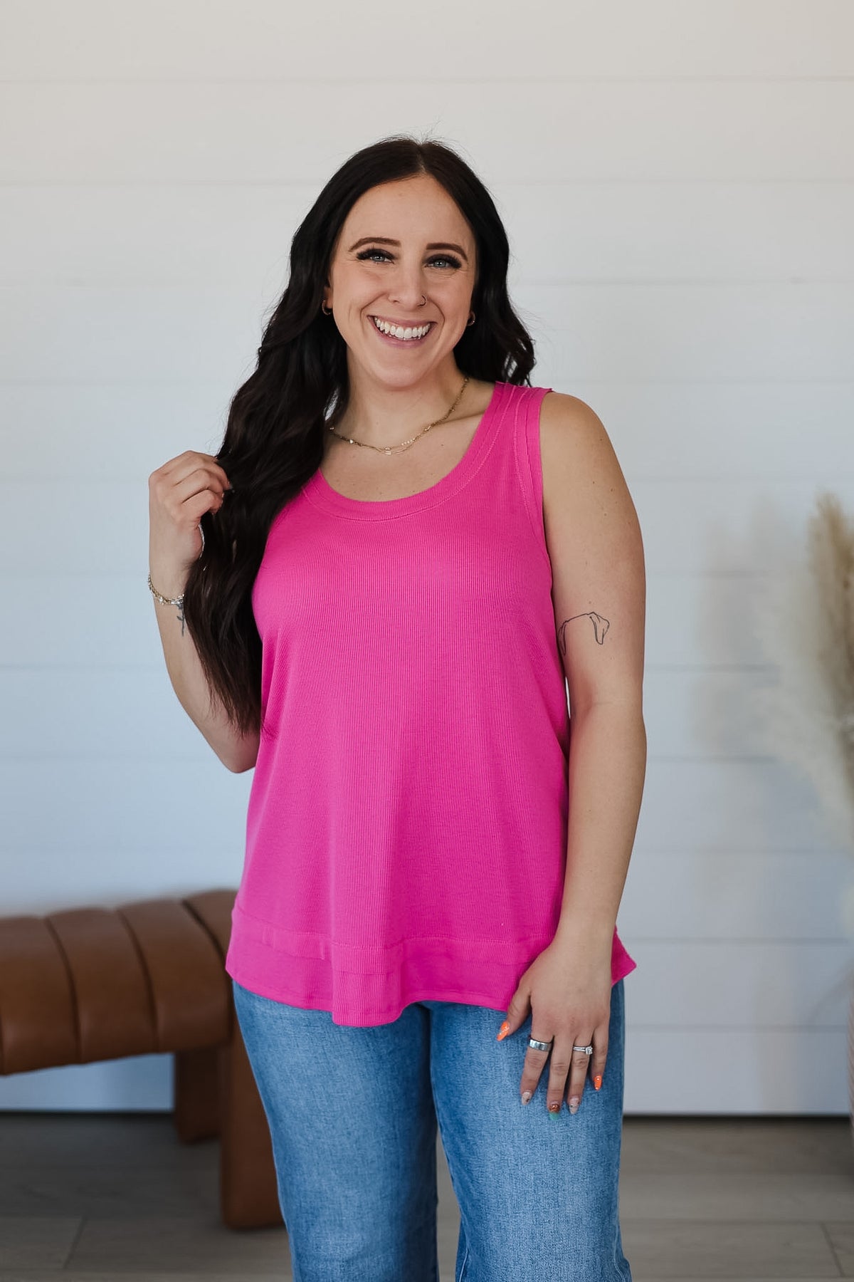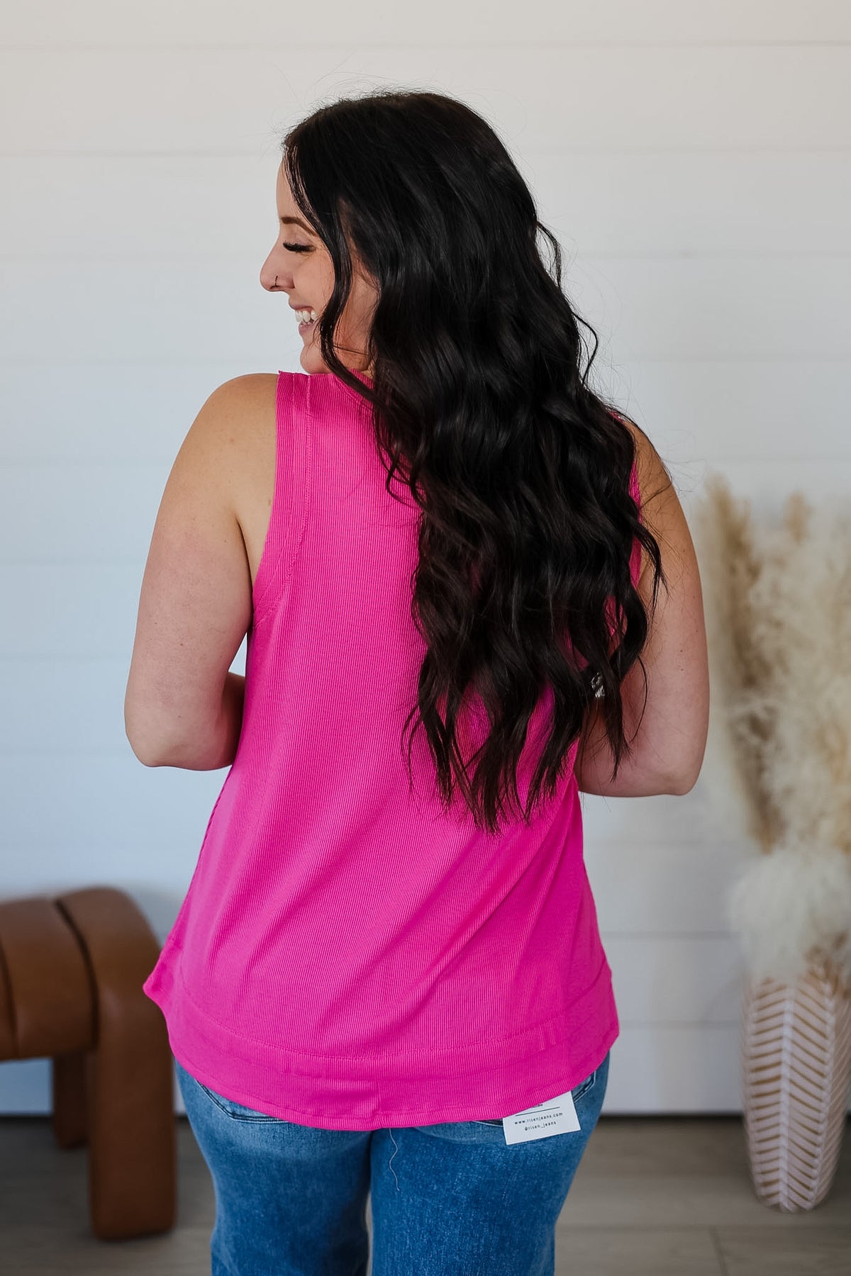 Baby ribbed tank top featuring a raw edge details for a subtle, edgy touch. The flattering fit on this top is so comfortable with a modern vibe to it! Perfect for layering or wearing on its own. Knit, stretchy.