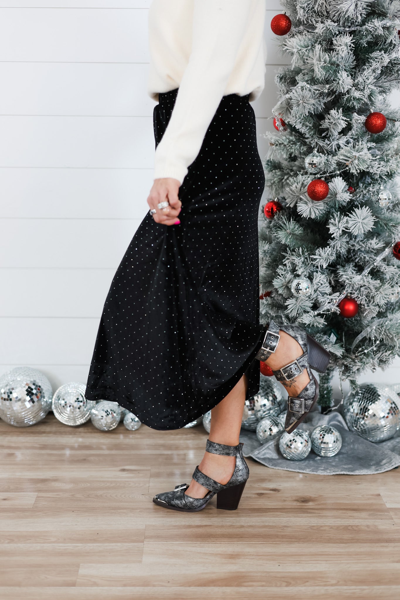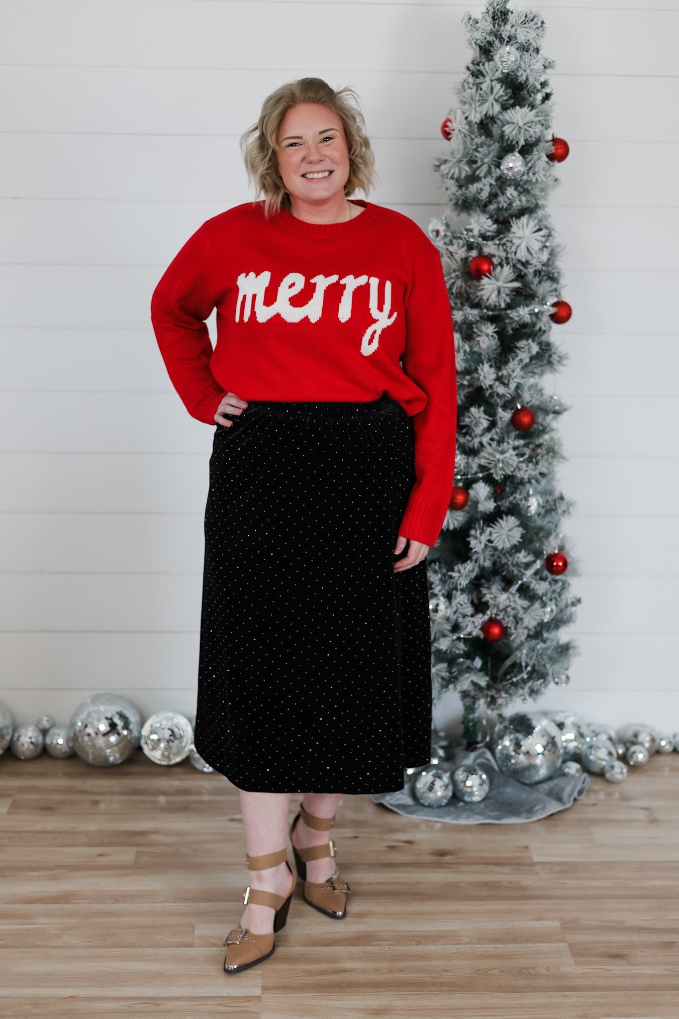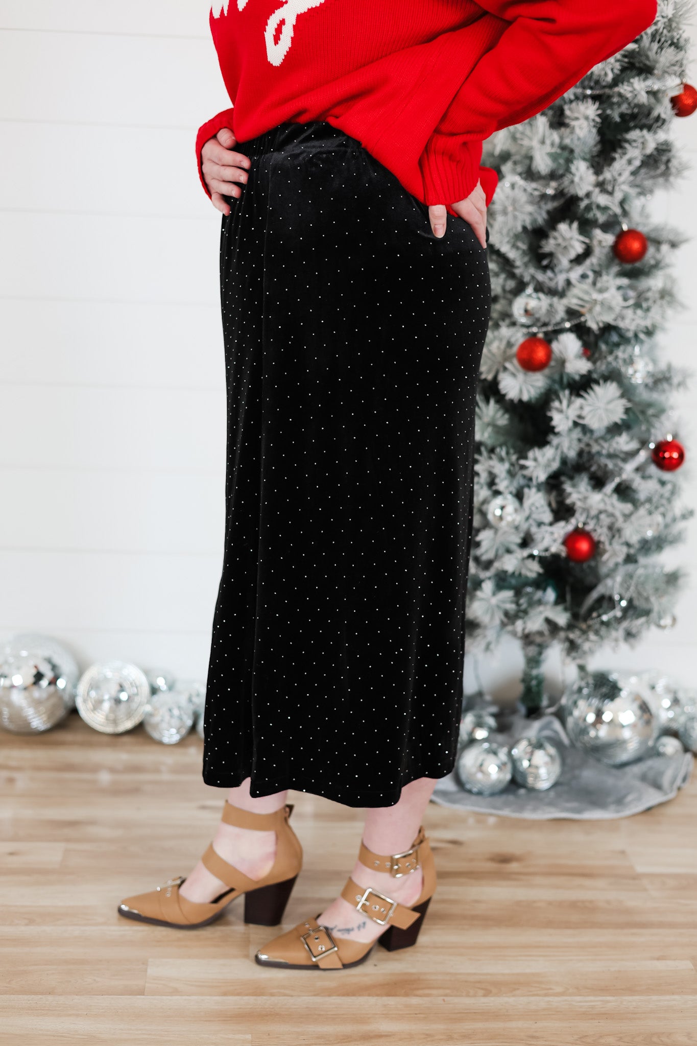 Slip into effortless elegance with the All Good Things Skirt. This luxe velvet pull-on features a comfortable elastic waist and stretchy fabric that moves with you all day long. Adorned with shimmering rhinestones for that extra sparkle, it's the perfect piece for dressing up or keeping it casual. No zippers, no fuss—just pure comfort and style wrapped in sumptuous velvet.