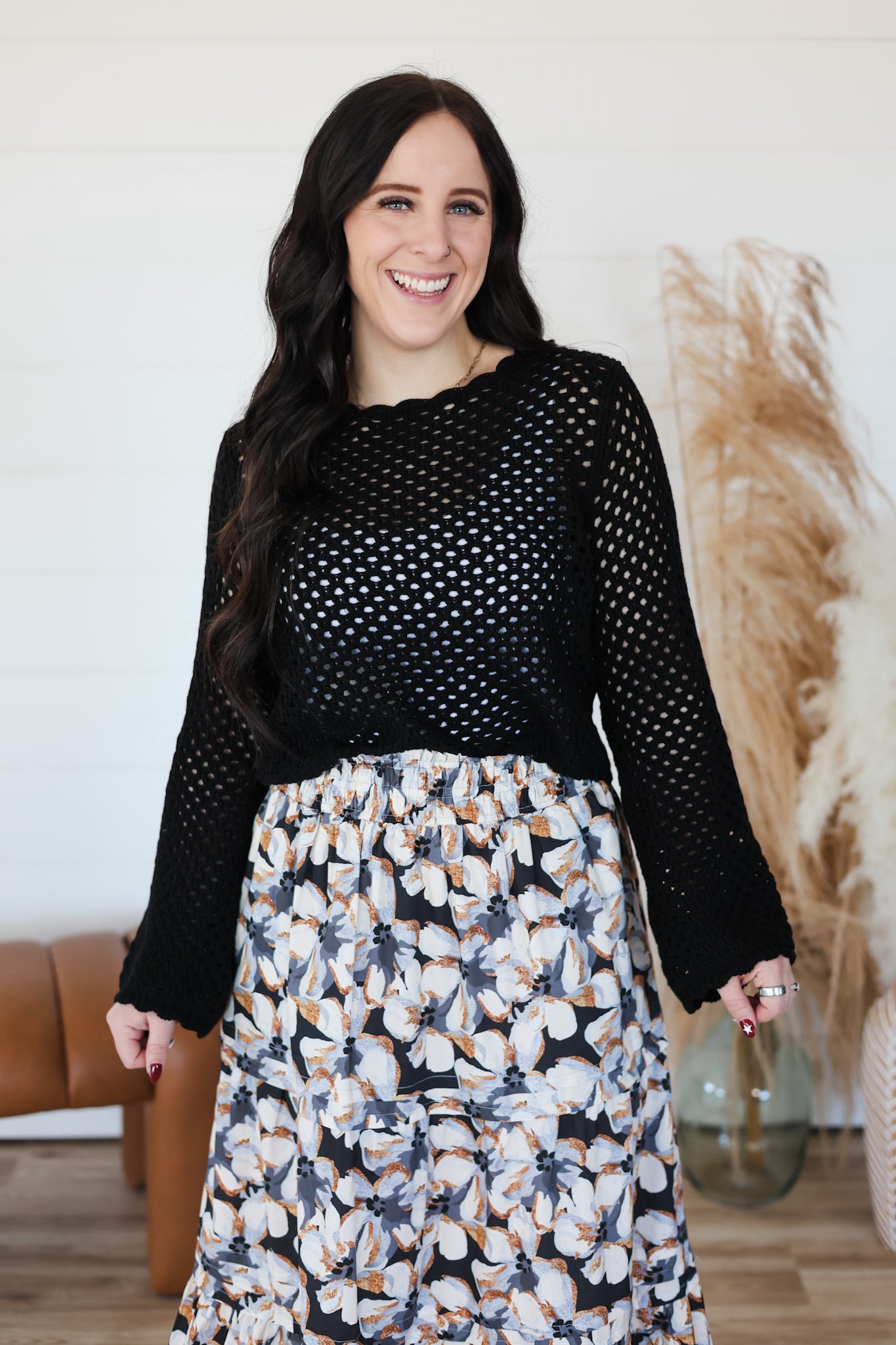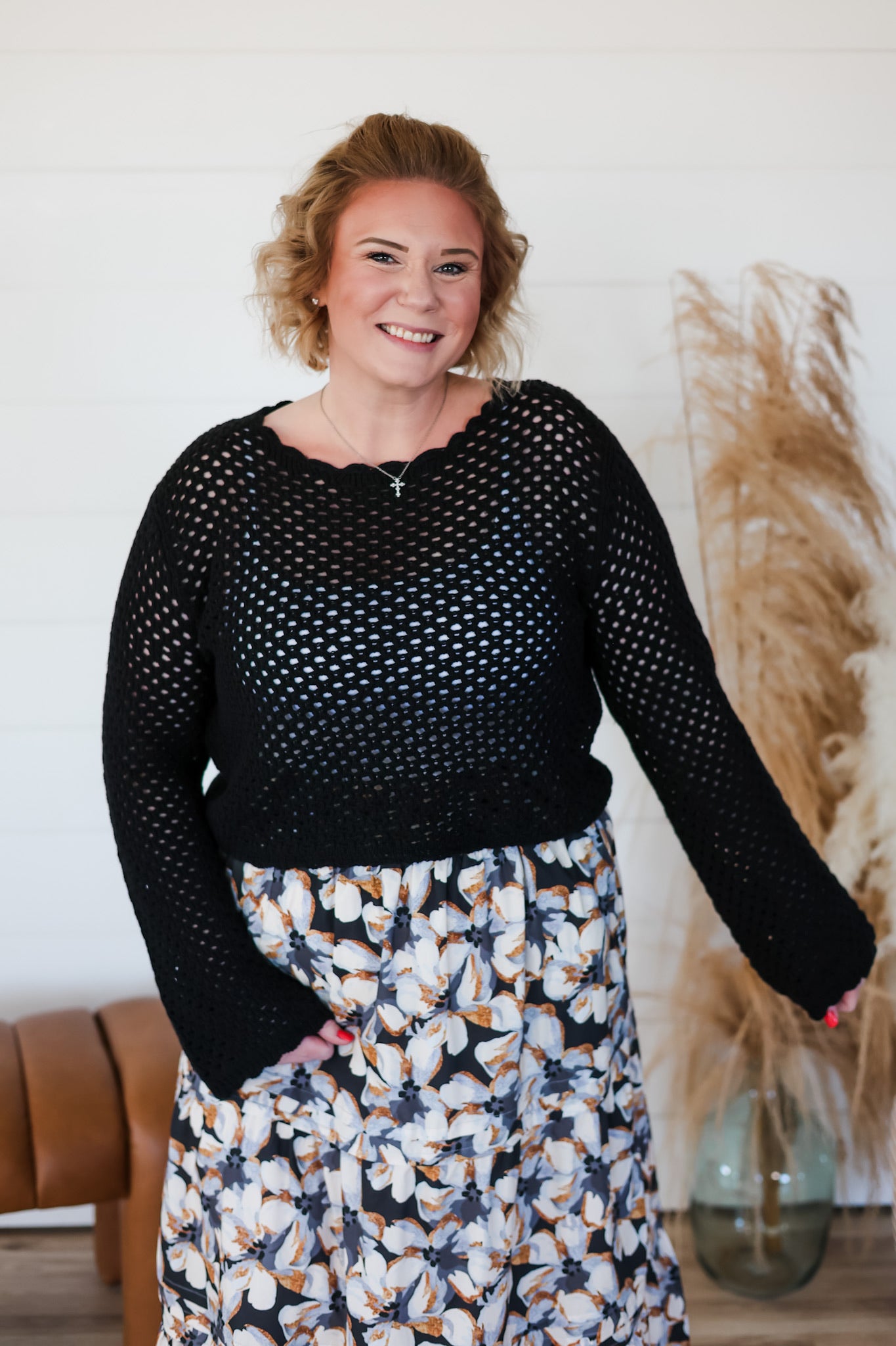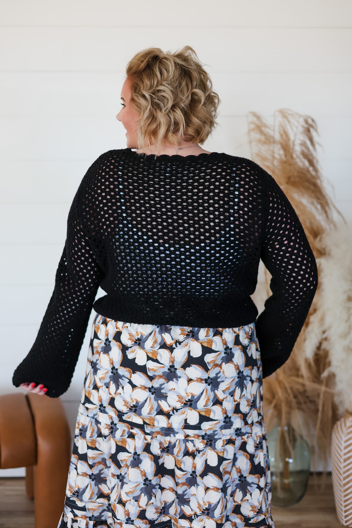 Cozy up in this charming crochet sweater, where delicate open knit meets playful scallop trim for a look that's effortlessly chic. The airy construction keeps things light and breezy, while the textured details add visual interest and dimension. Perfect for layering over your favorite tee or wearing solo on mild days, this top brings a touch of handcrafted warmth to your everyday rotation. A versatile piece that feels as good as it looks.