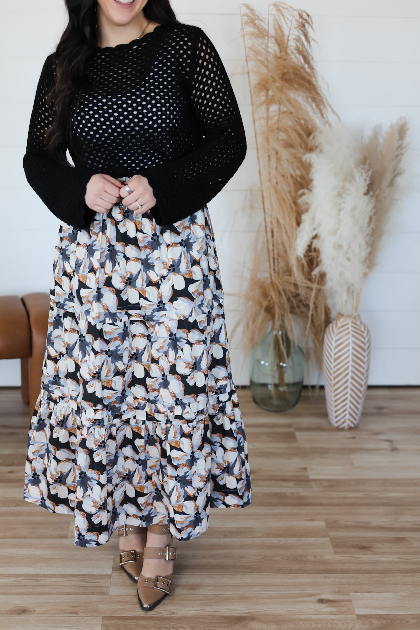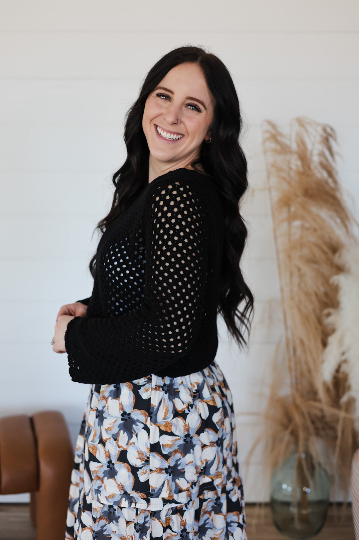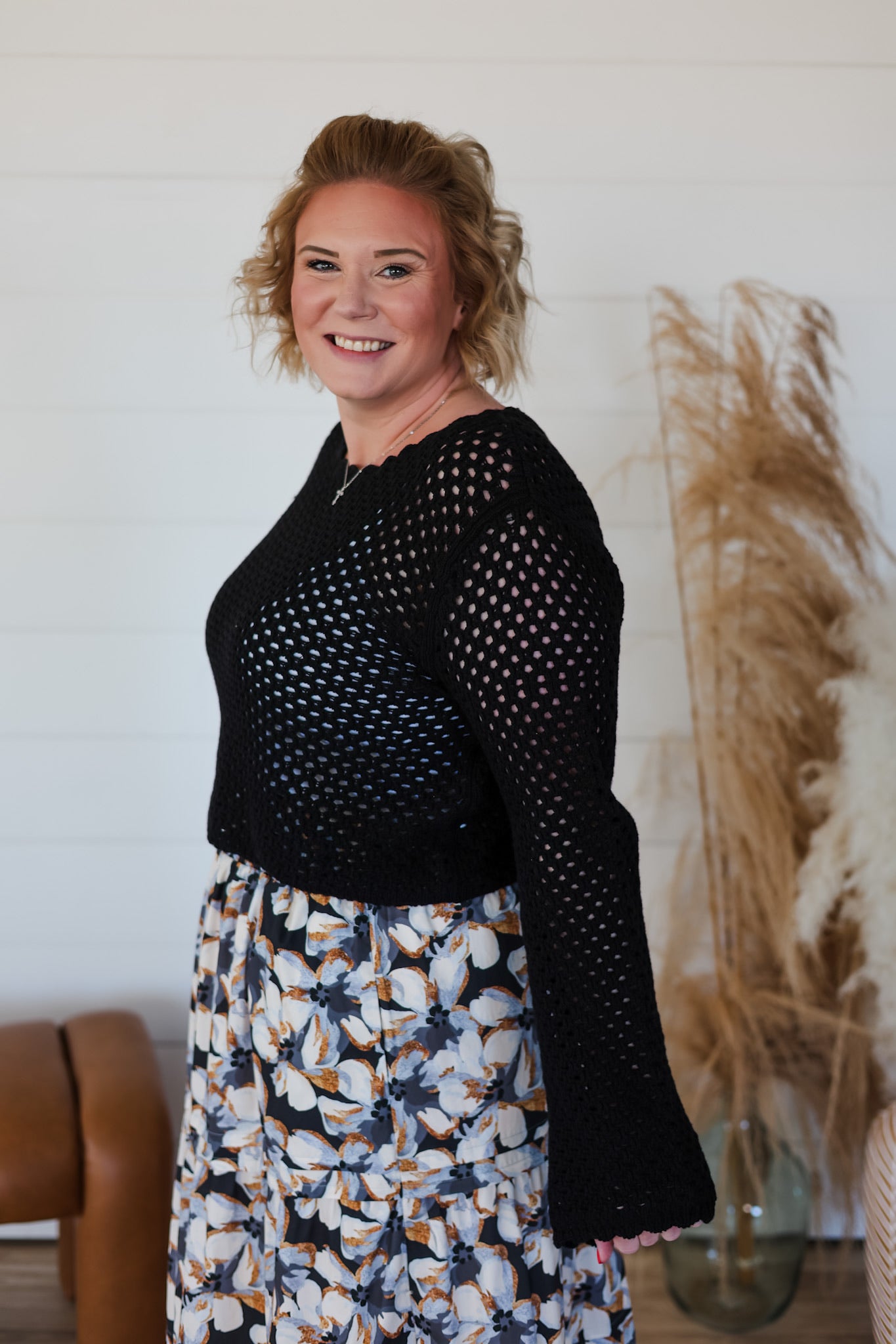 Cozy up in this charming crochet sweater, where delicate open knit meets playful scallop trim for a look that's effortlessly chic. The airy construction keeps things light and breezy, while the textured details add visual interest and dimension. Perfect for layering over your favorite tee or wearing solo on mild days, this top brings a touch of handcrafted warmth to your everyday rotation. A versatile piece that feels as good as it looks.