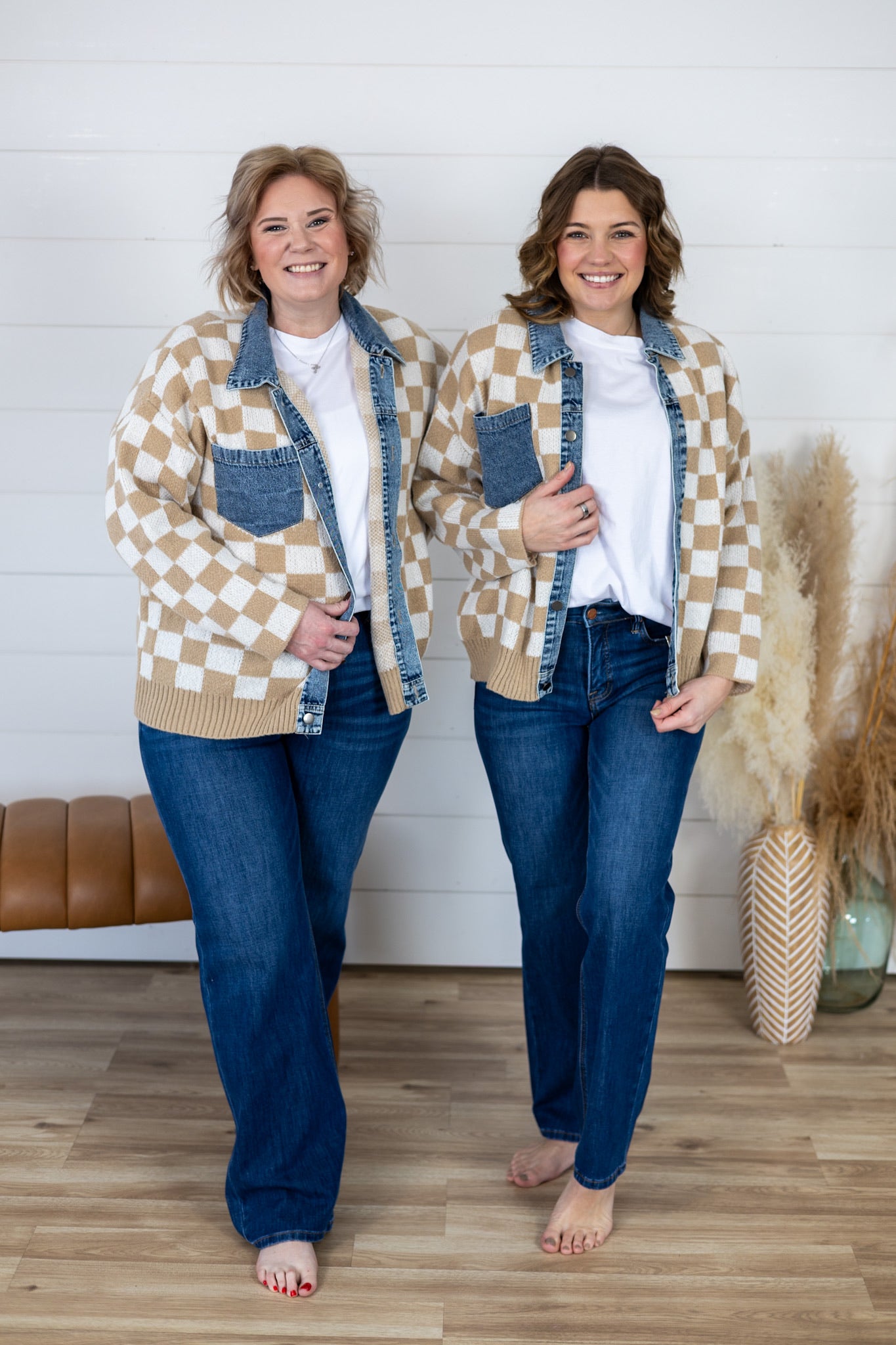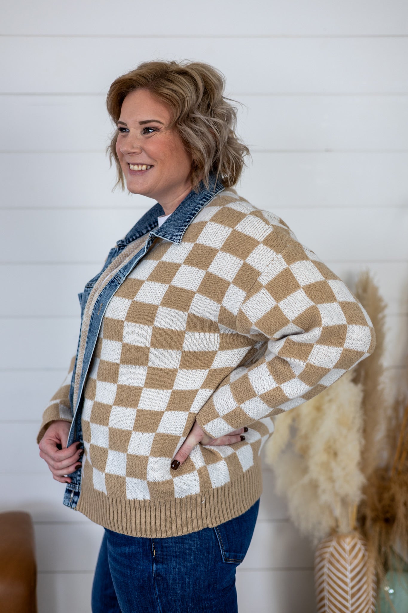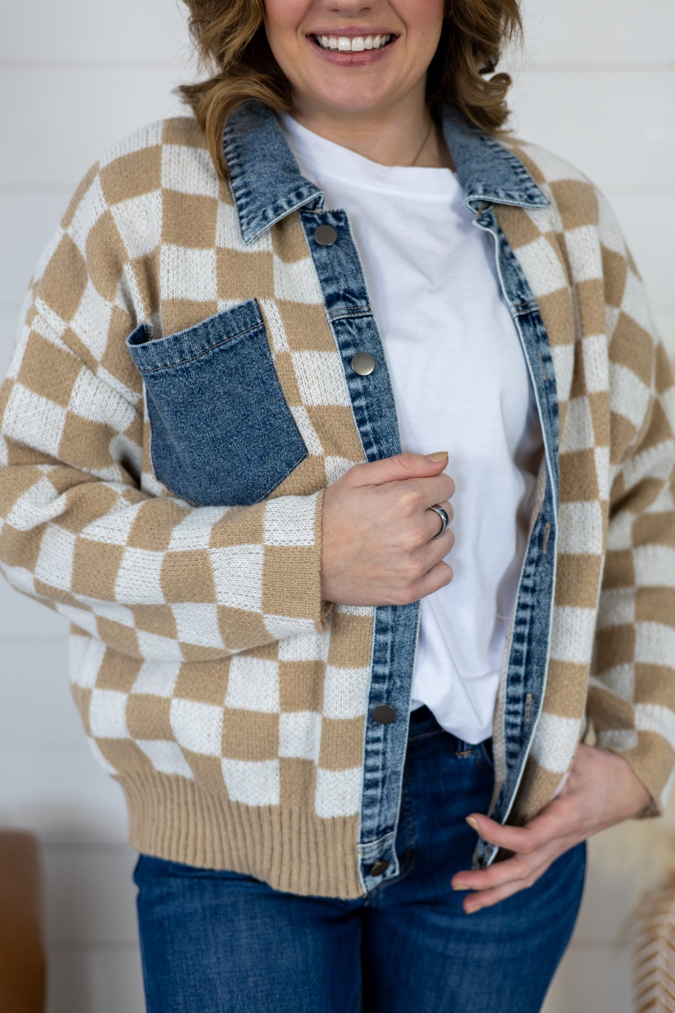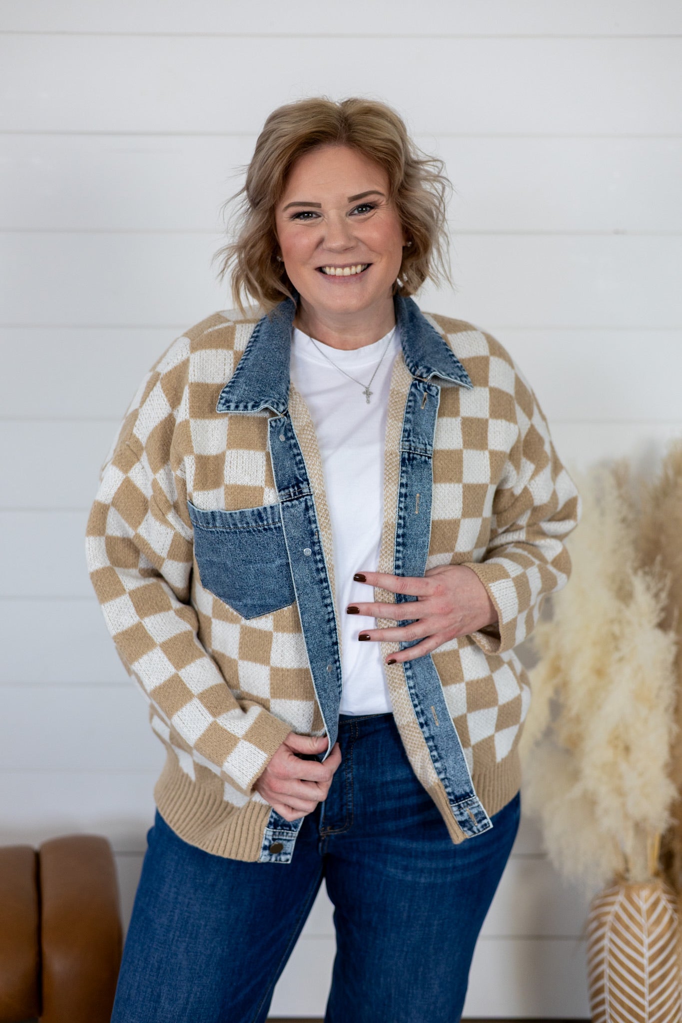 Layer up with our Always Fun Top, a playful take on classic style. This washed denim and checker sweater blend features a charming buttoned front and mix-and-match design that lets you express your personality. Perfect for casual days when you want to look put-together without trying too hard. Pair it with your favorite jeans or dress it up for weekend adventures. A versatile wardrobe essential that's anything but boring.