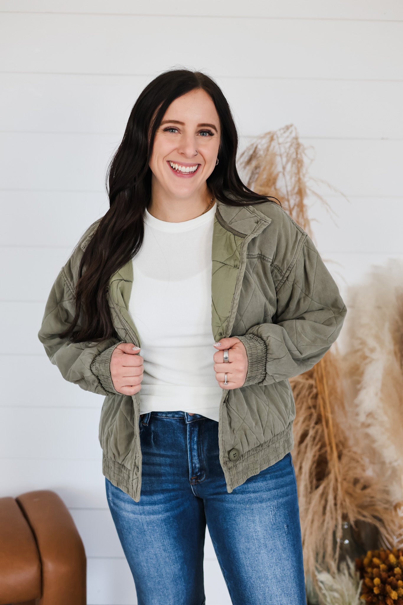 Step back into comfort with the Back In Time Jacket—a washed quilted button-down that's equal parts cozy and cool. Featuring practical pockets for all your essentials and crafted from irresistibly soft fabric, this jacket layers effortlessly over your favorite pieces. Whether you're channeling vintage vibes or just want a reliable layer that feels as good as it looks, this timeless piece has got you covered.