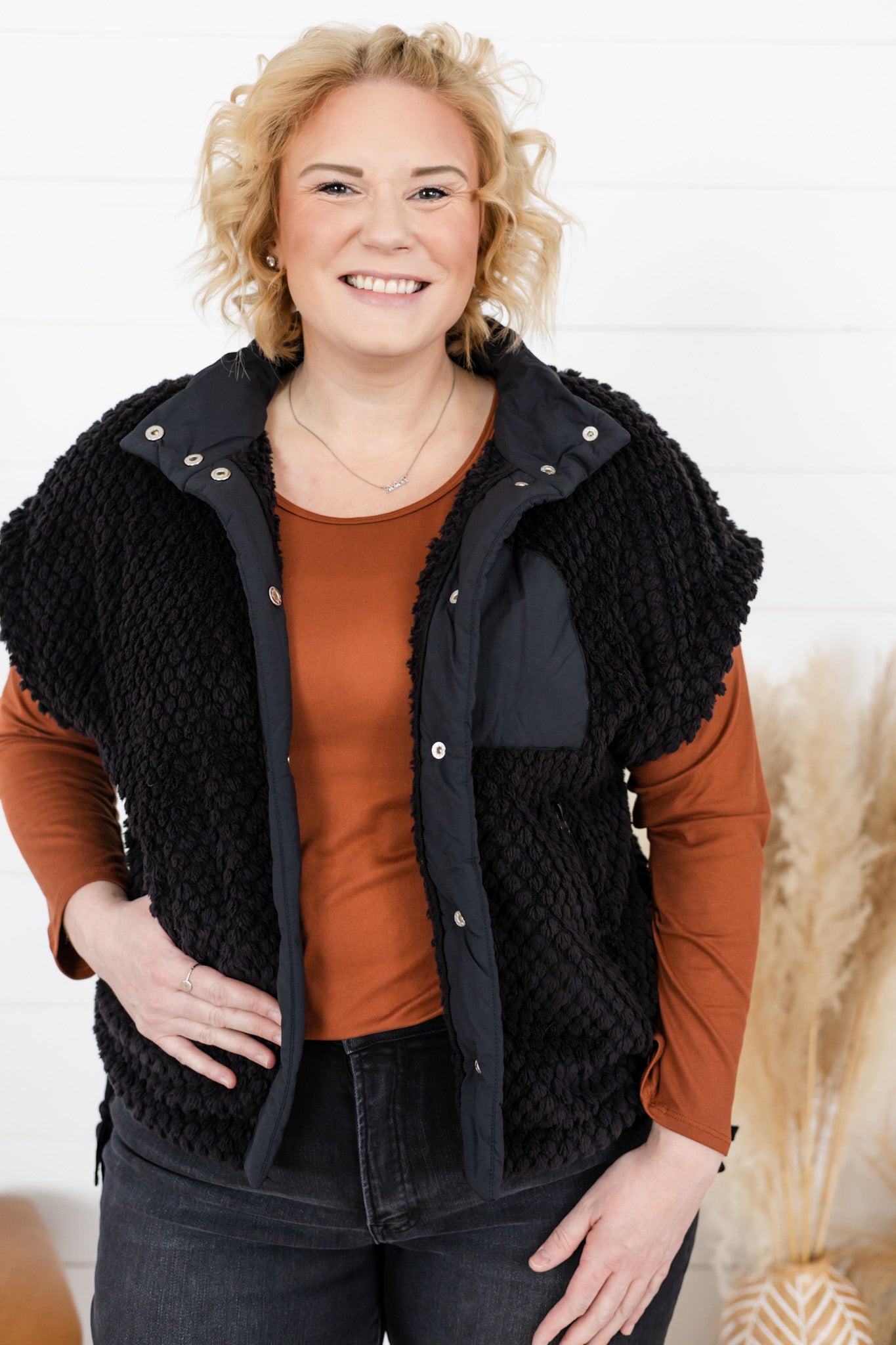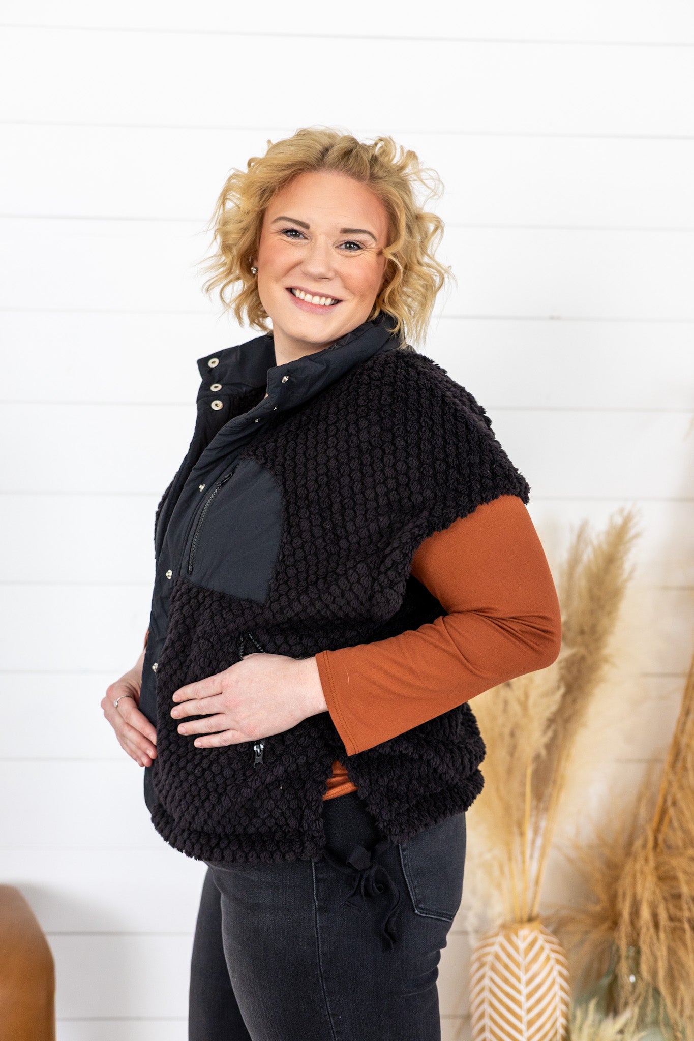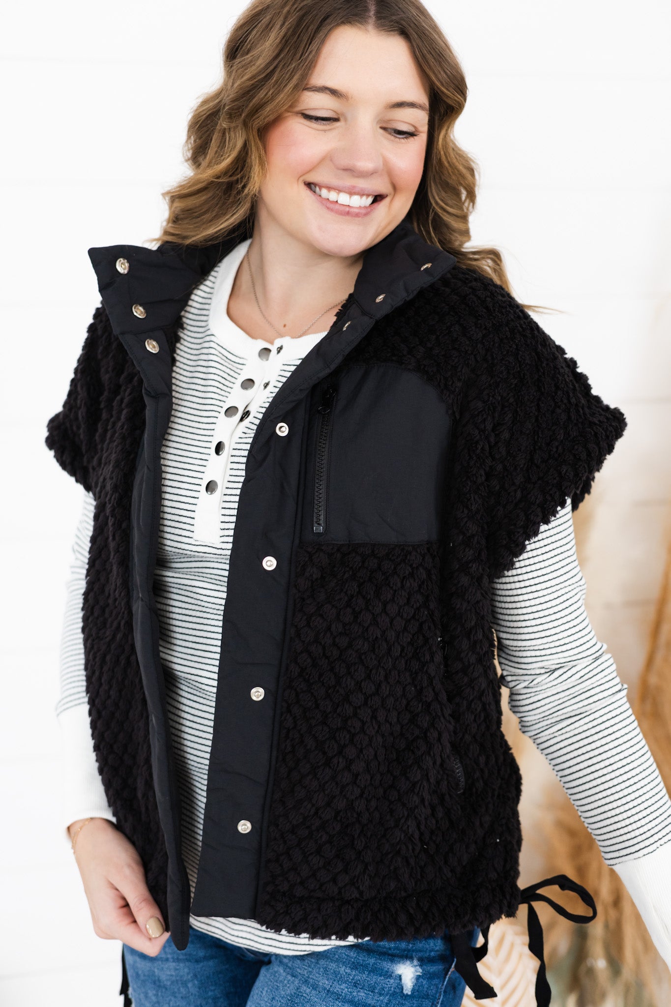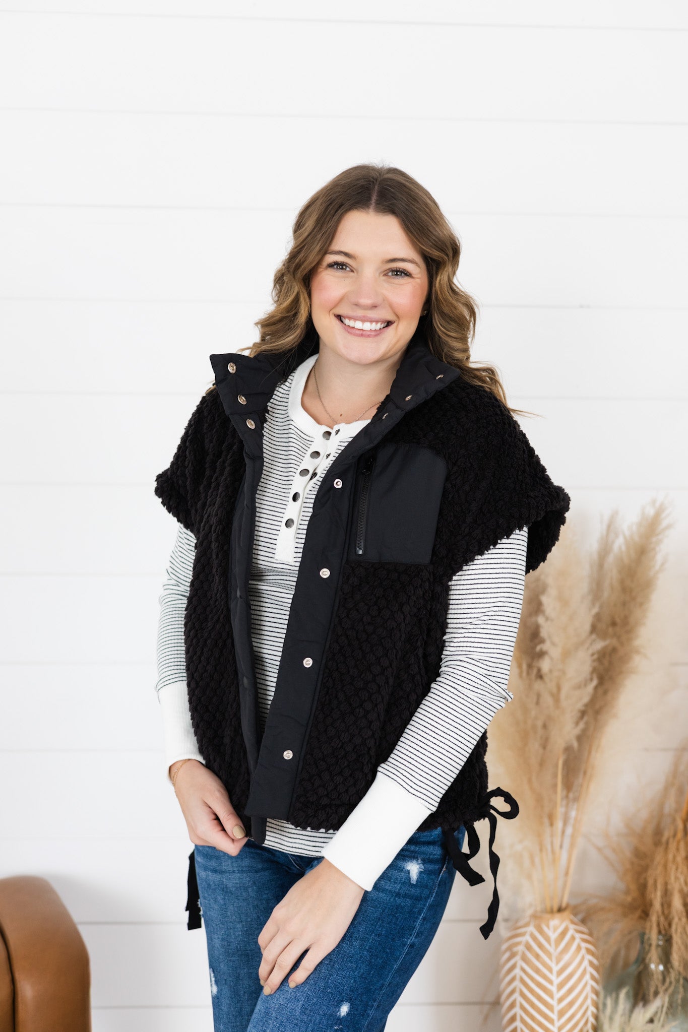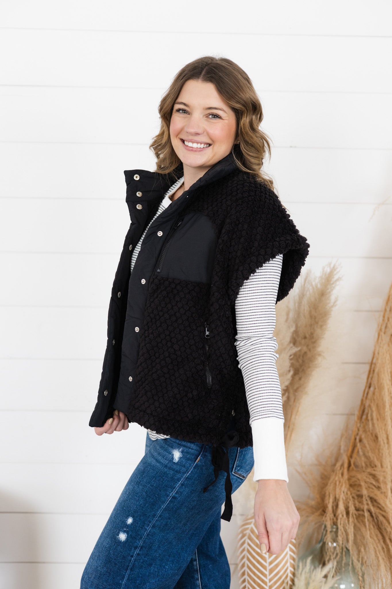 Layer up with effortless charm in this textured woven vest that's ready for anything. The high neckline keeps things polished while the button-down front and practical patch pockets add everyday functionality. Cinch the side tie for a custom fit that flatters your silhouette. Perfect for throwing over your favorite tee or dress, this versatile piece brings cozy sophistication to your rotation.