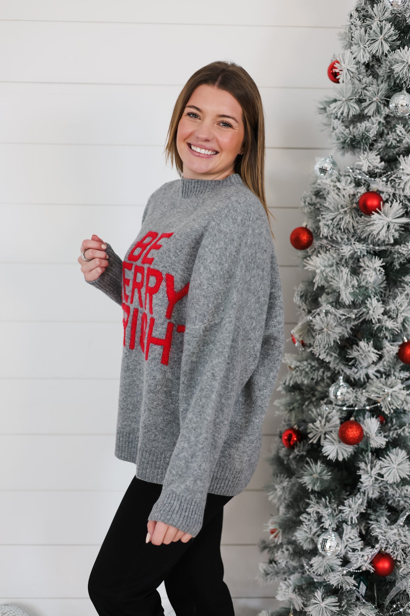 Spread holiday cheer in this cozy crewneck pullover, featuring a soft knit construction perfect for layering through the season. The vibrant red detail adds a festive pop that captures the spirit of celebration. Whether you're gathering with loved ones or enjoying quiet moments at home, this cheerful top brings warmth and style to your everyday rotation. A versatile piece that's ready to make you smile.