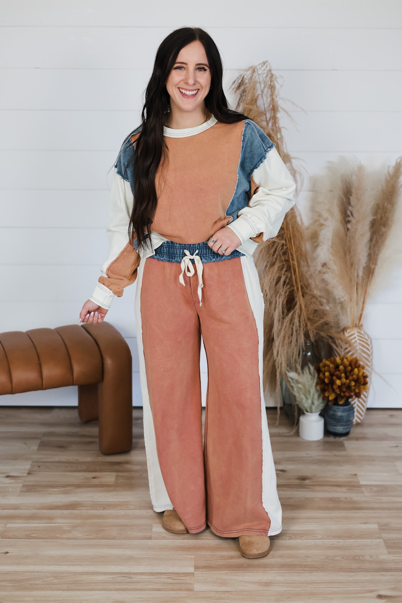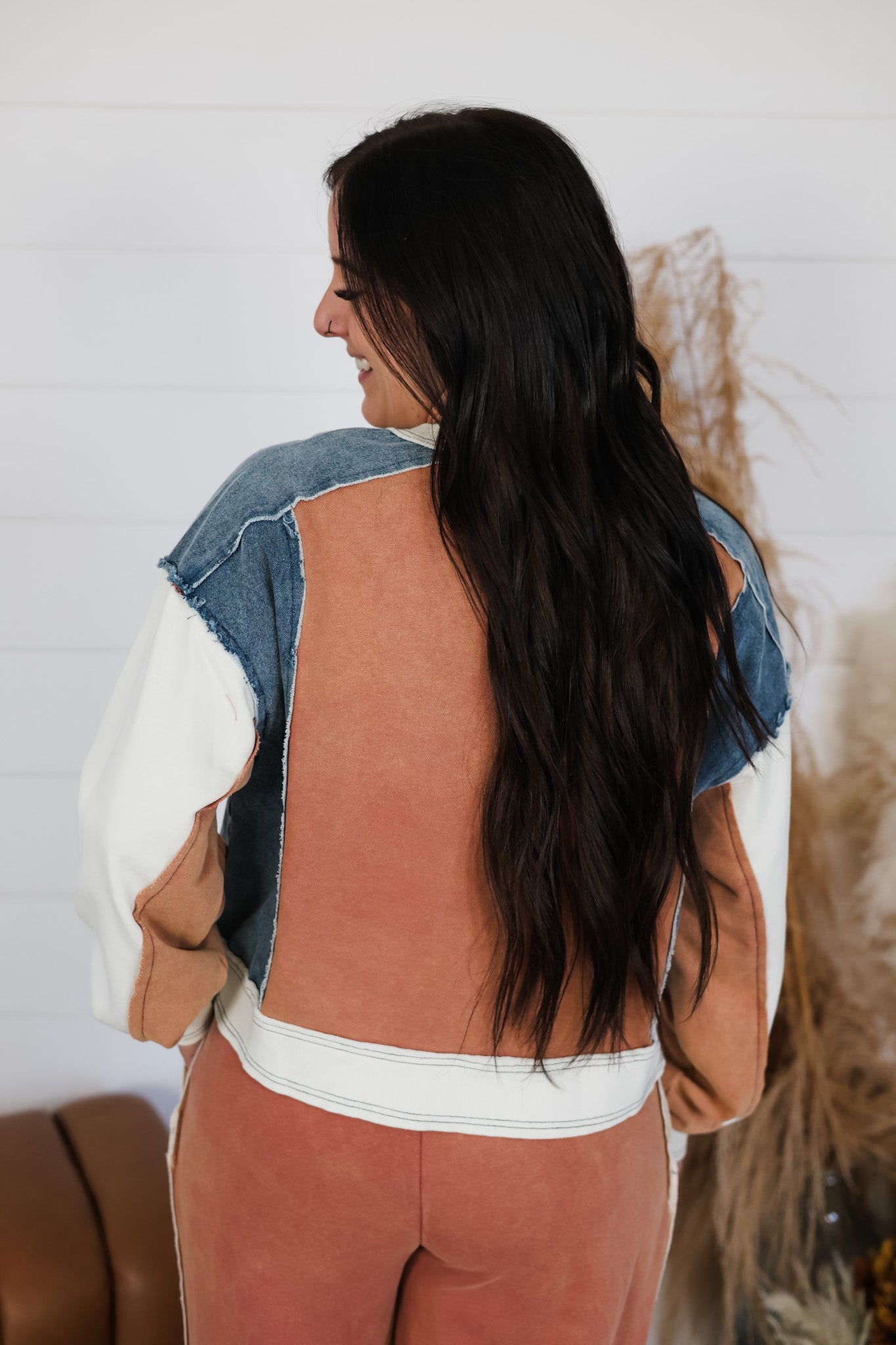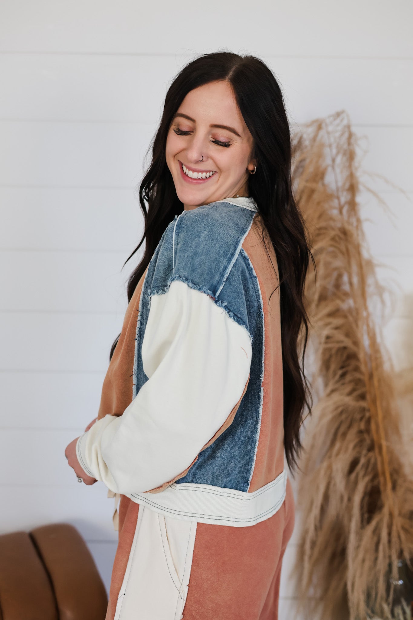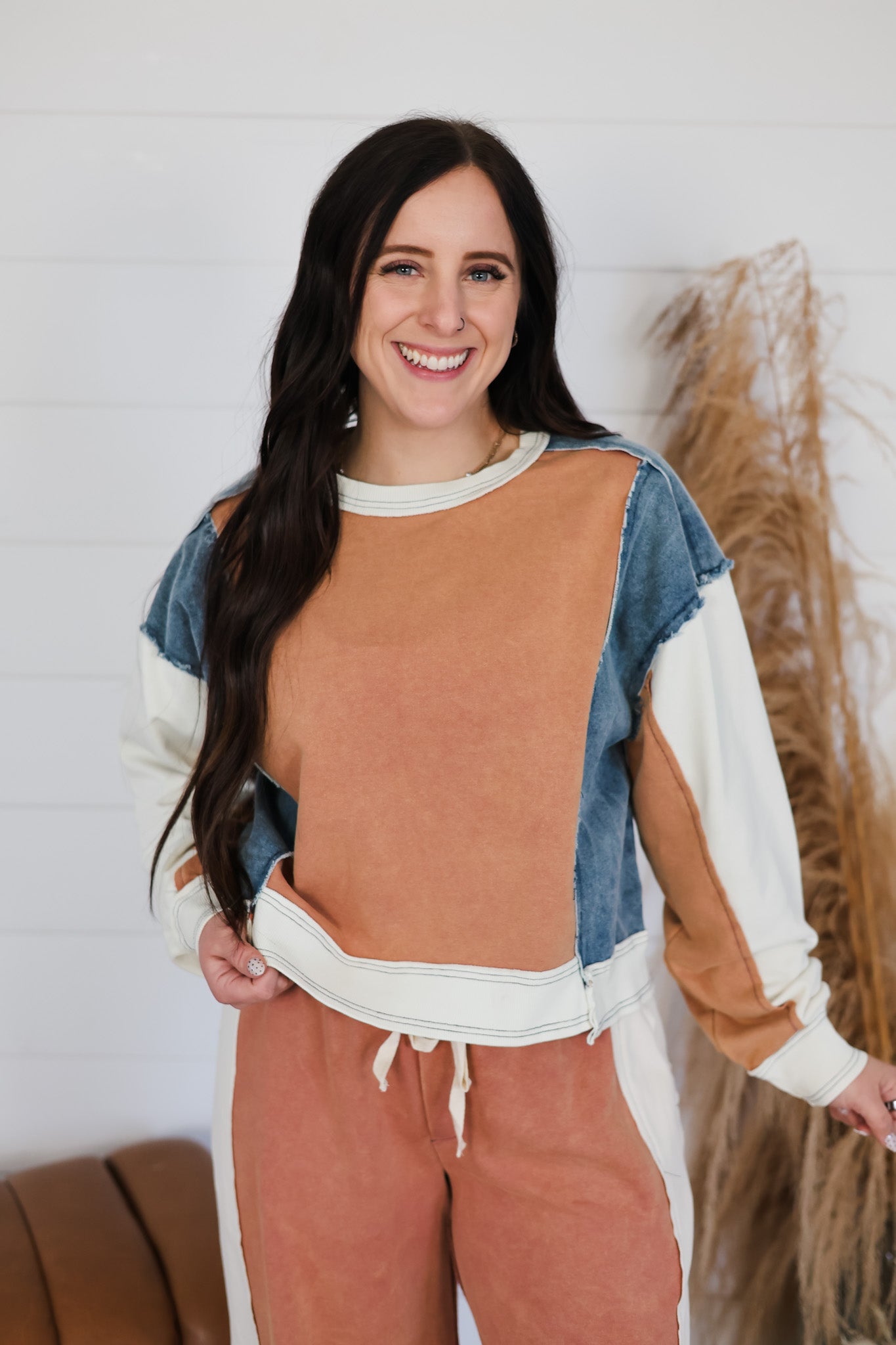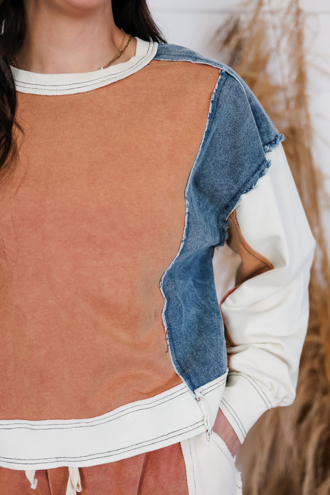 Embrace your bold side in this playful color-block pullover that mixes textures and attitude. Featuring a cozy long-sleeve design with frayed edges for that effortlessly cool vibe, plus unexpected denim detailing that adds serious character. Perfect for layering or wearing solo, this top brings fun contrast to your everyday rotation. A statement piece that says you don't do boring.