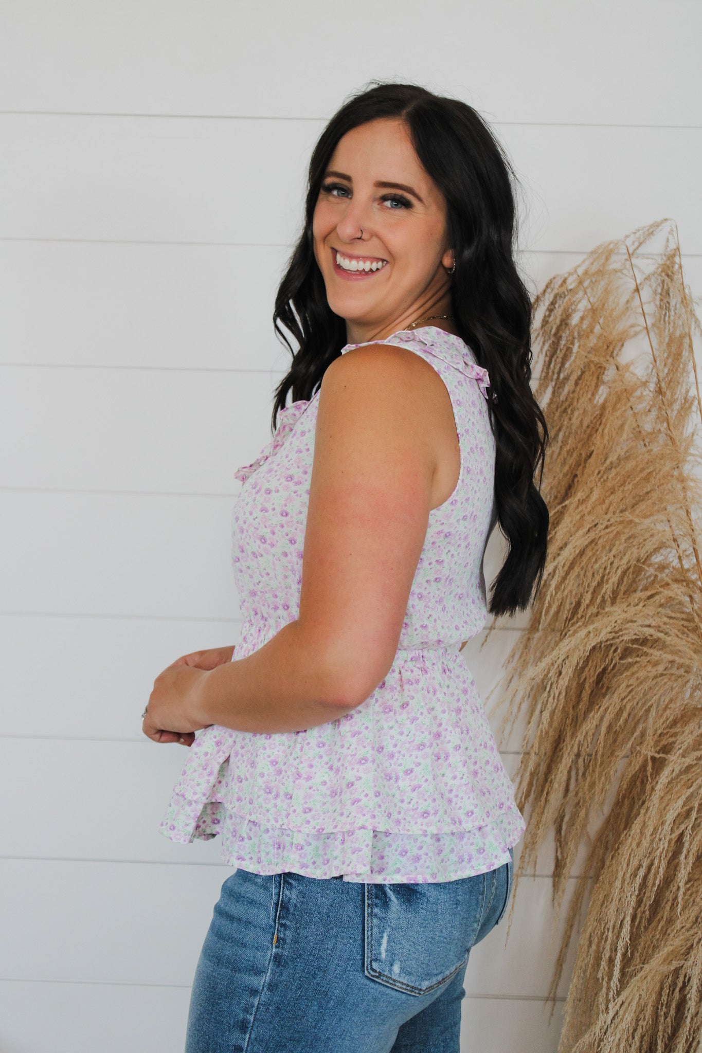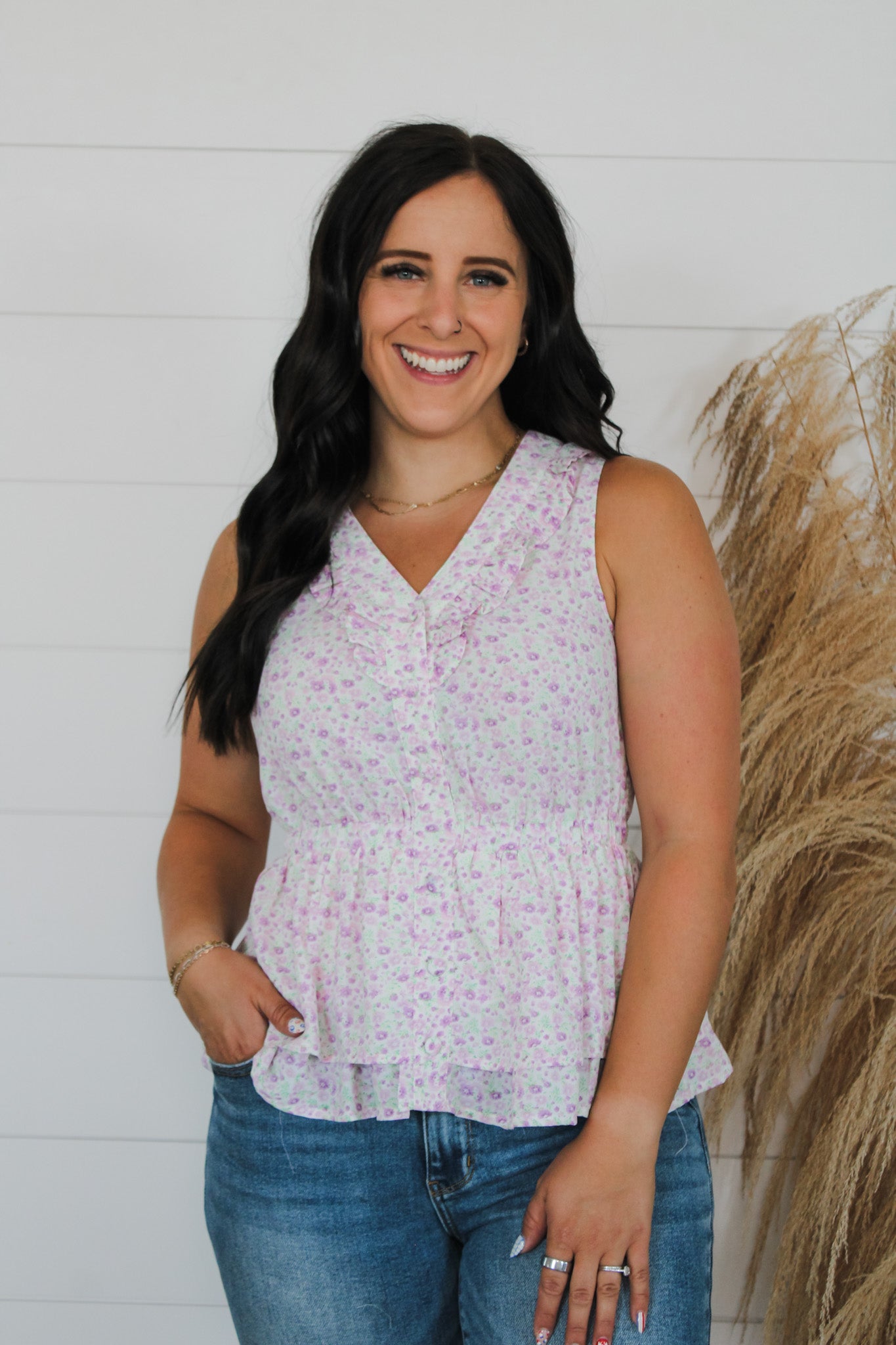 This playful sleeveless top features a flattering V-neckline and front button-down design for easy style. The elastic waist creates a comfortable fit, while the peplum hem adds a fun, flirty flair to your look. Perfect for sunny days or layering under your favorite jacket!