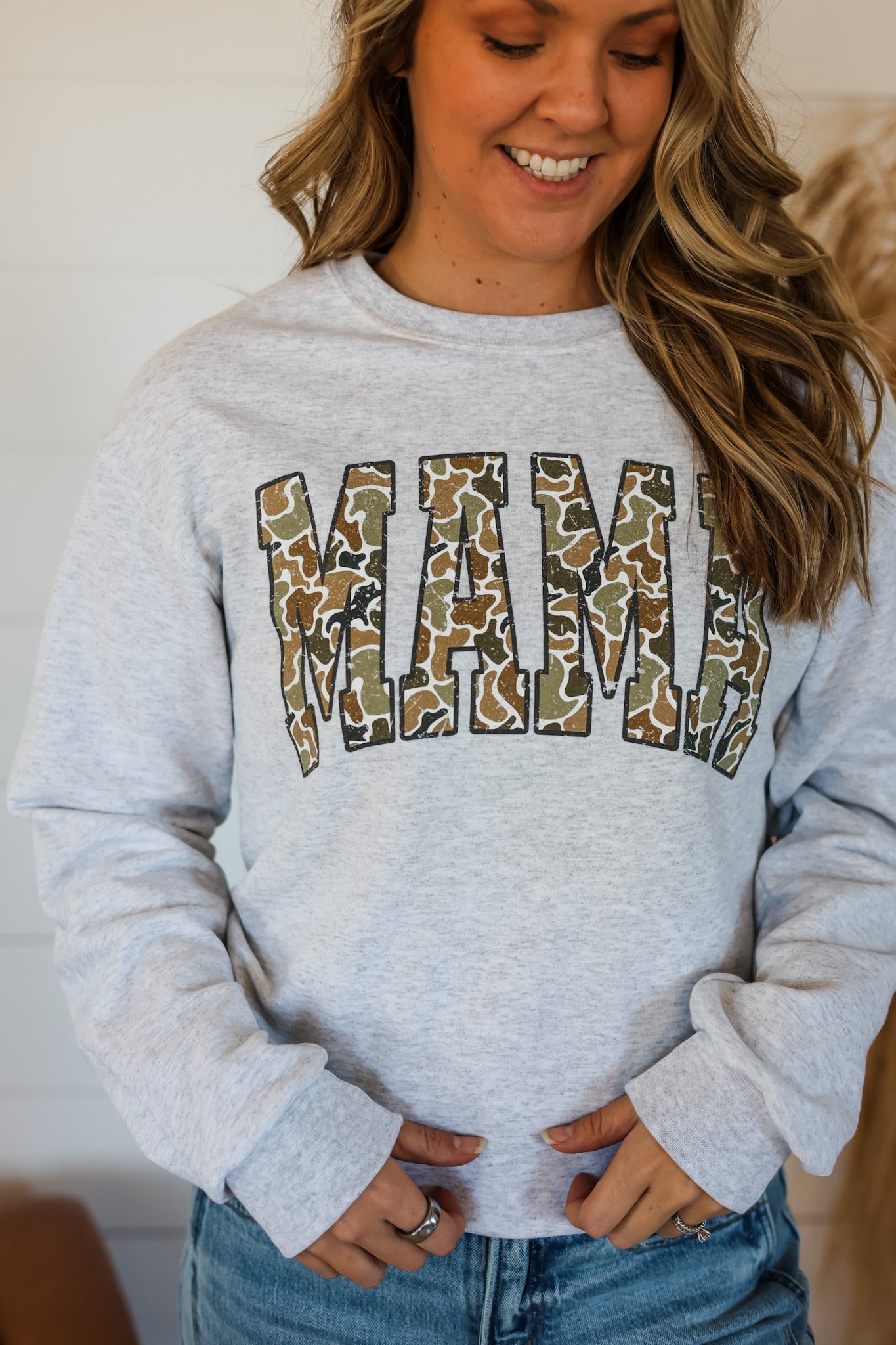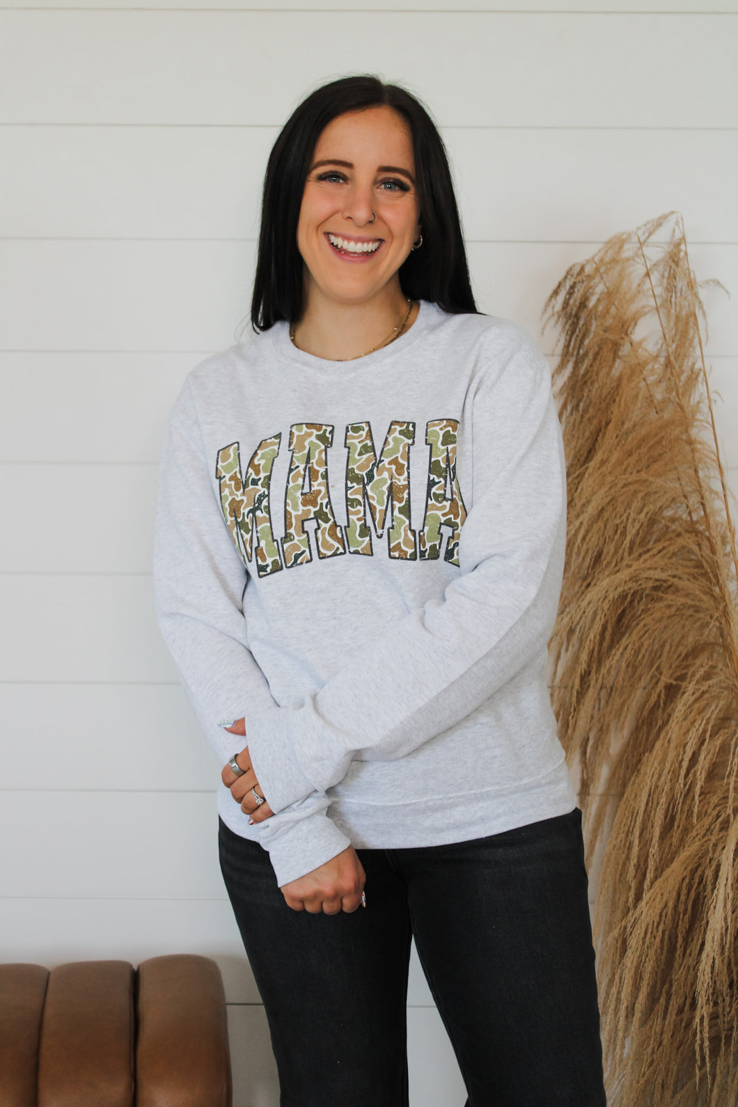 Introducing the Camo MAMA Crewneck. Stay cozy in this super soft, oversized crewneck. Perfect for those chilly mornings (with a cup of coffee, of course). Say goodbye to uncomfortable clothes and hello to ultimate comfort.