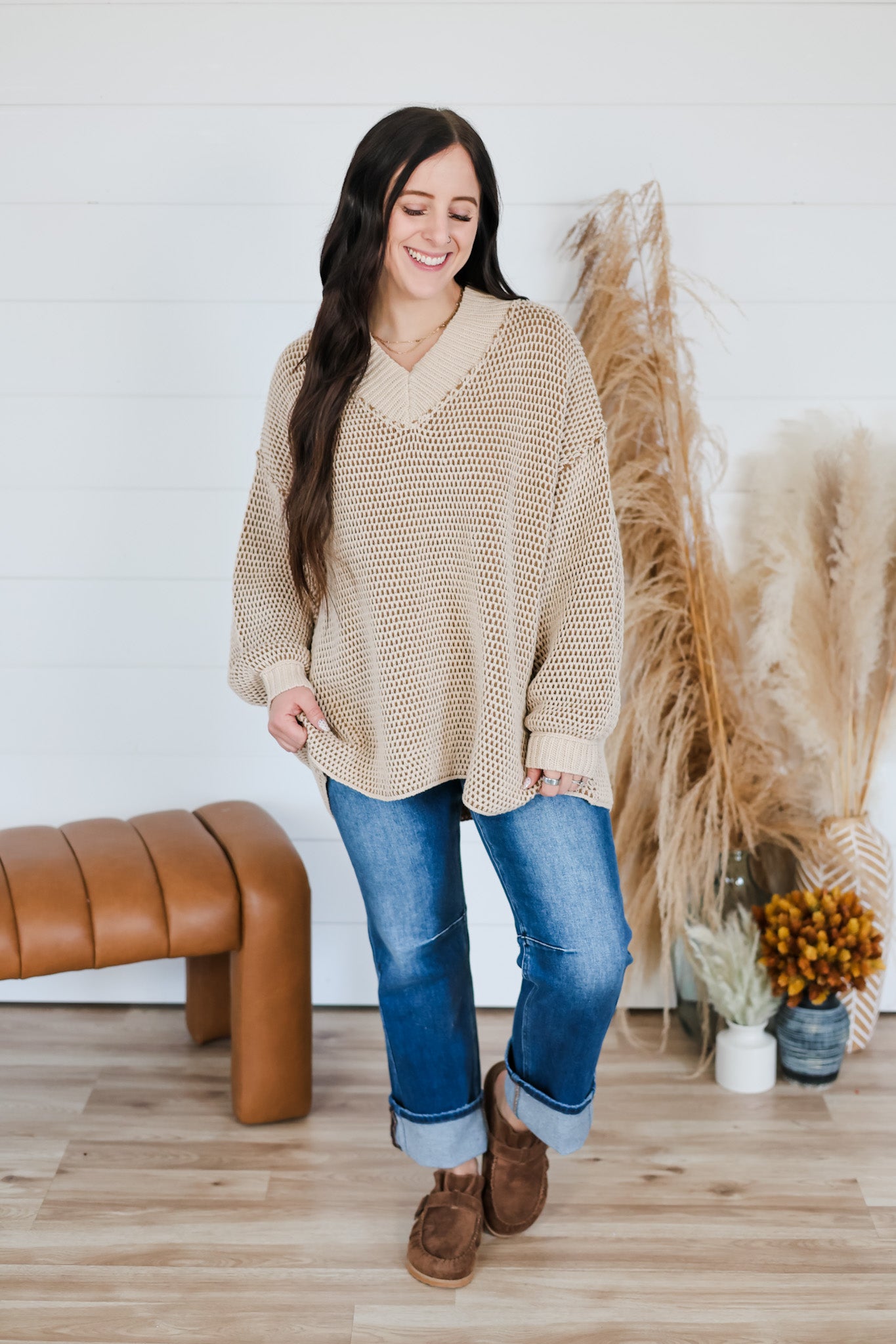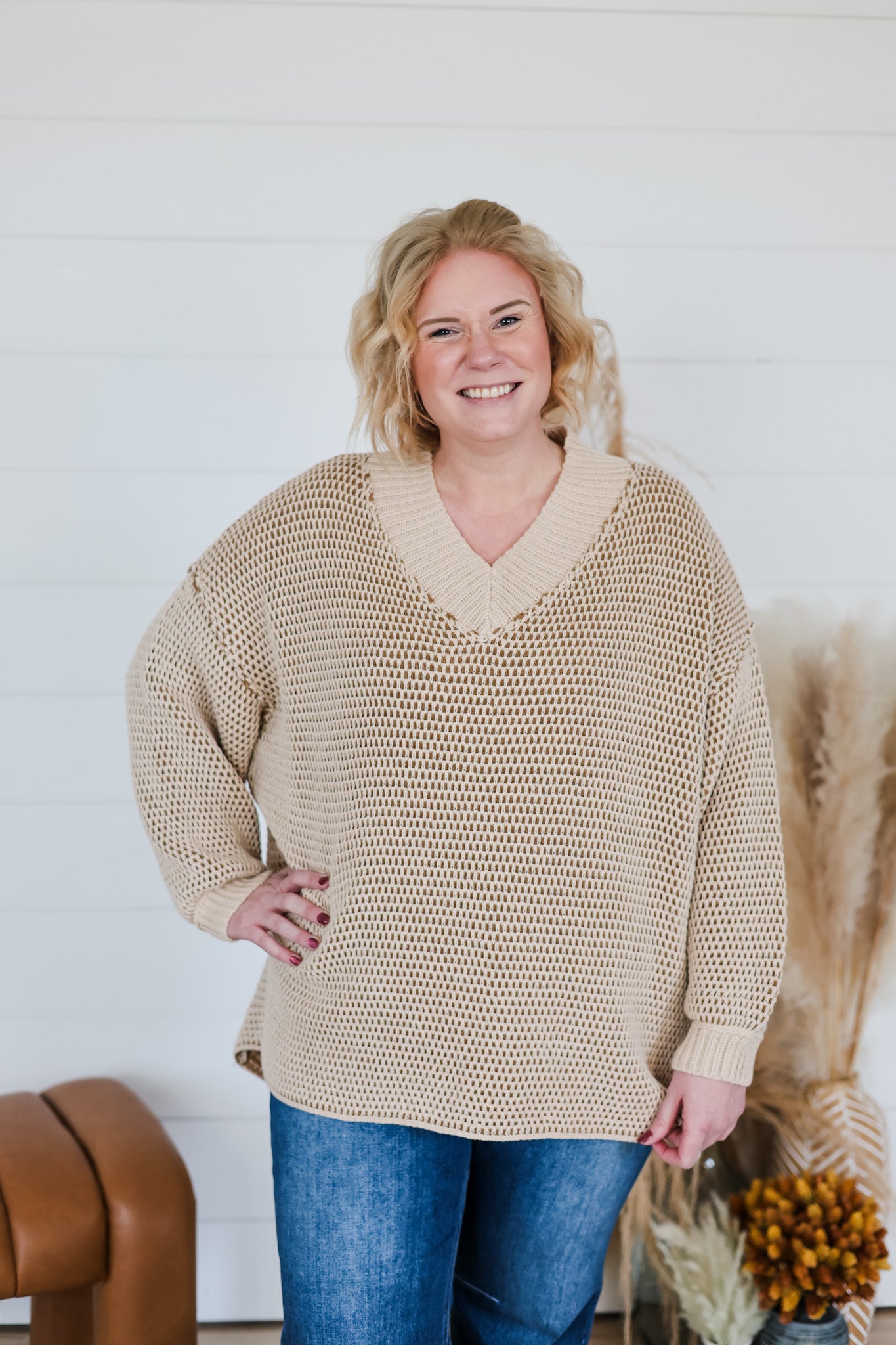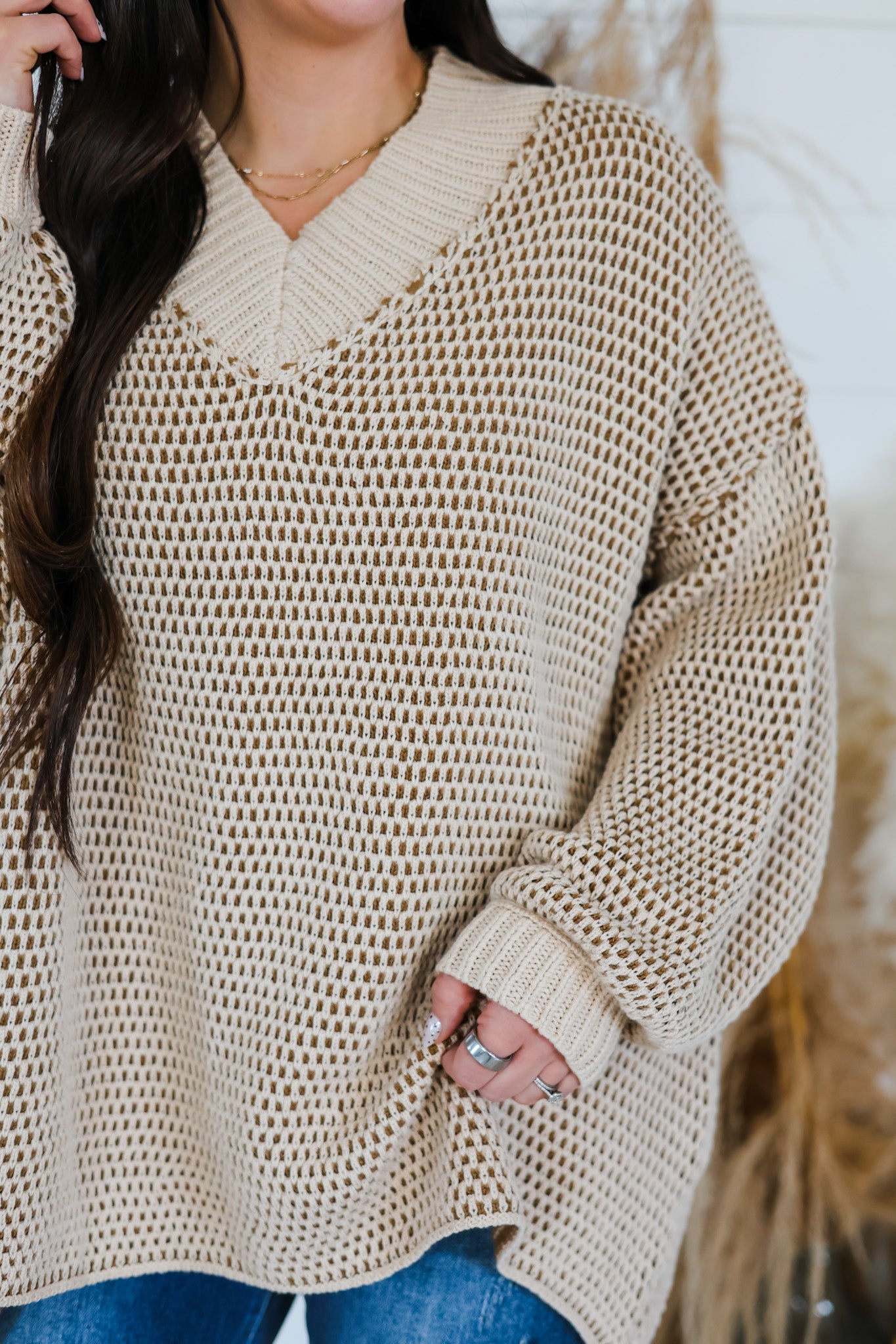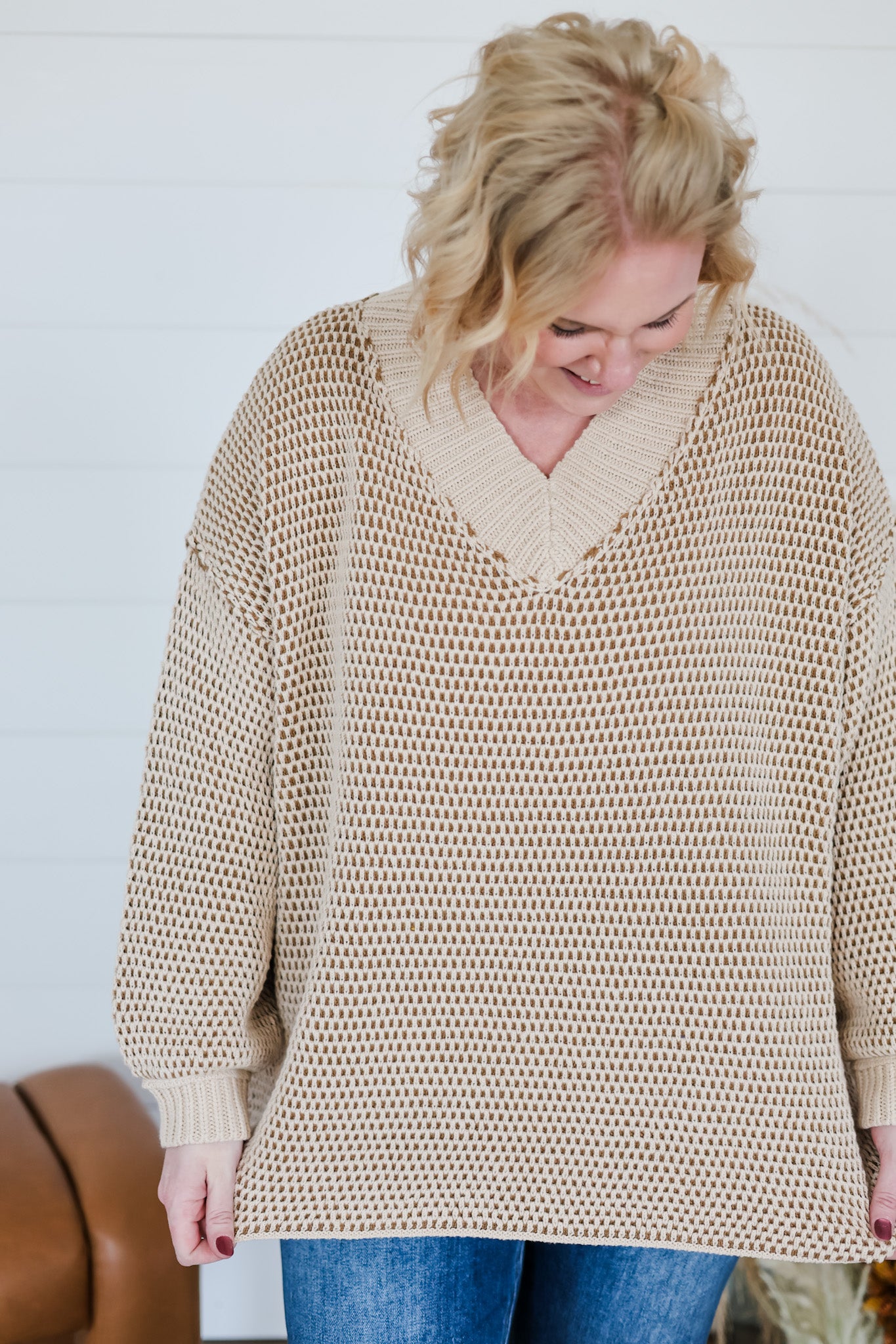 Effortlessly chic meets cozy comfort with this oversized two-tone textured v-neck sweater top. The relaxed silhouette drapes beautifully while the contrasting color blocking adds visual interest to your everyday rotation. Soft, textured knit fabric keeps things tactile and inviting—perfect for layering or wearing solo. Whether you're catching coffee with friends or settling in for a casual day, this versatile piece does the heavy lifting in your wardrobe.