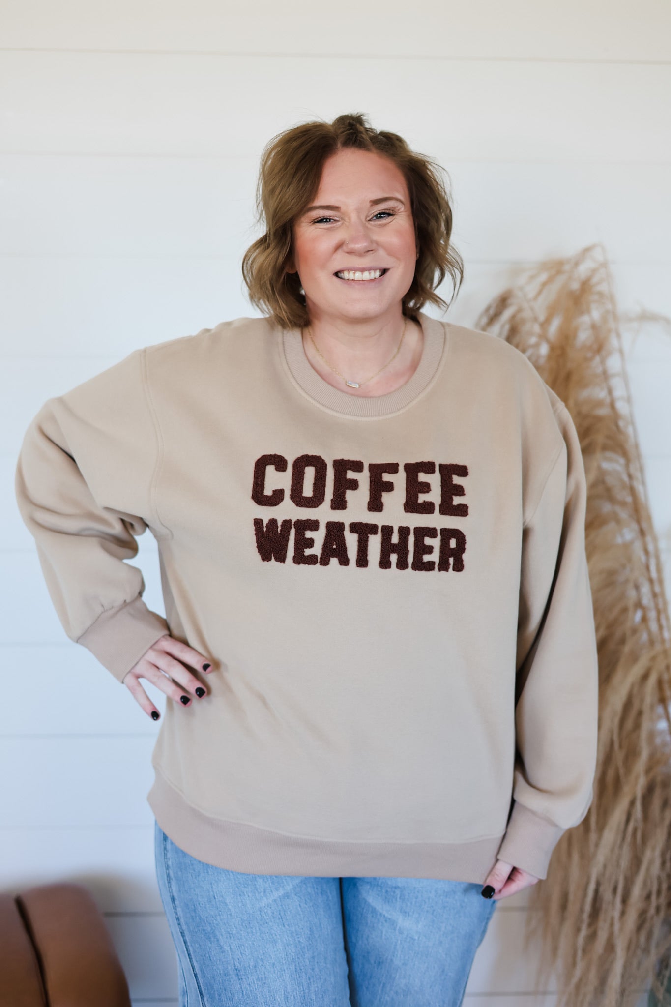 The Coffee Weather Crewneck Top is the perfect combination of style and comfort. Made with super soft material, it features a cute teddy bear detail writing. The medium weight design adds extra warmth, making it a must-have for colder fall days. Elevate your wardrobe with this cozy and stylish crewneck.