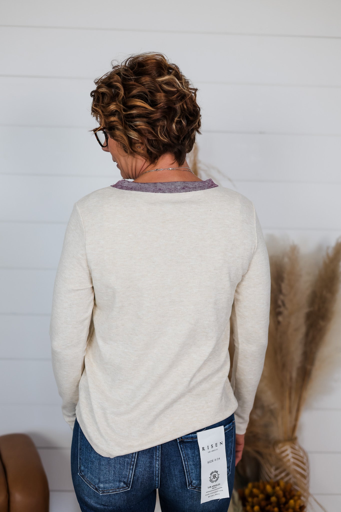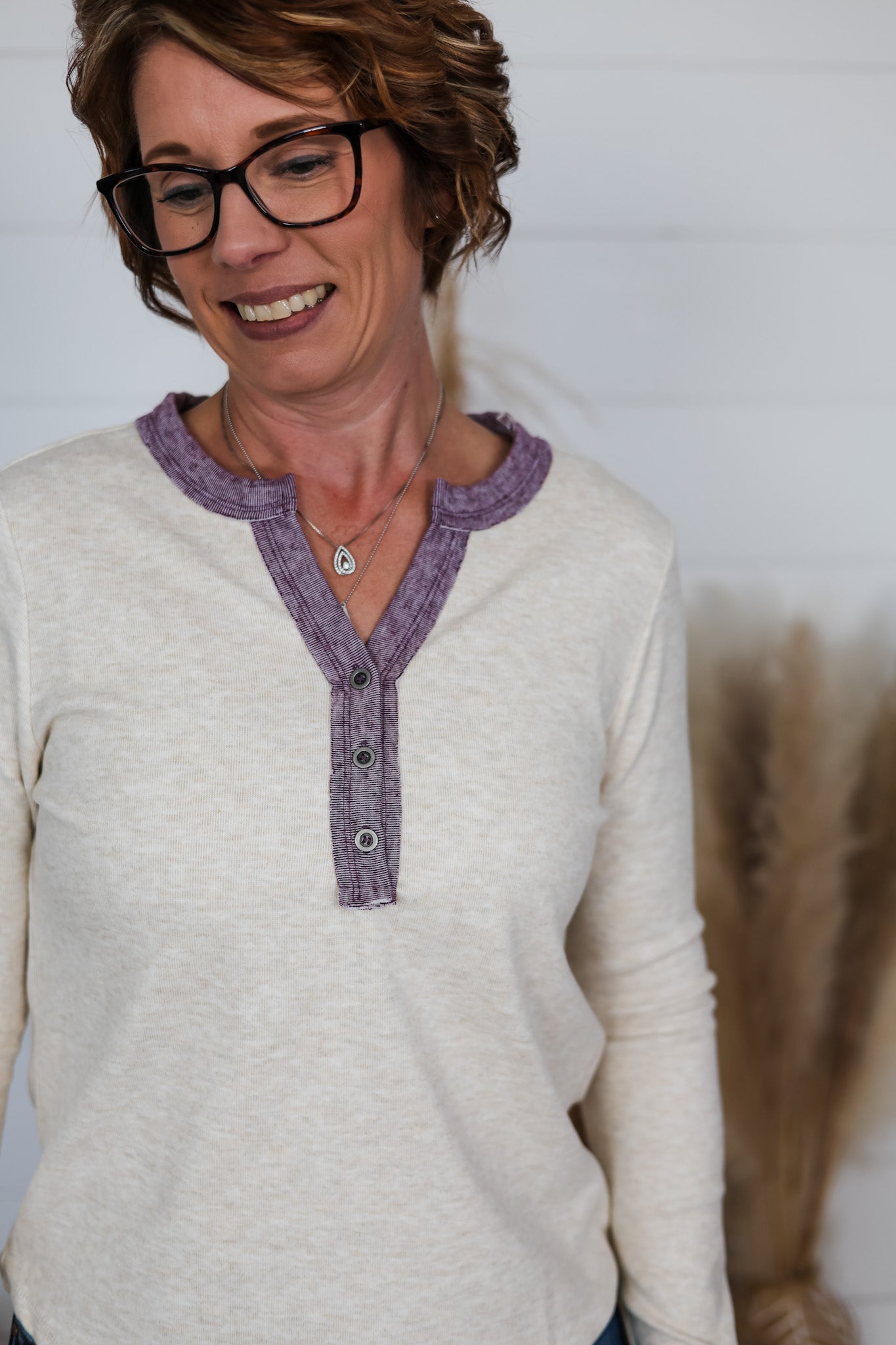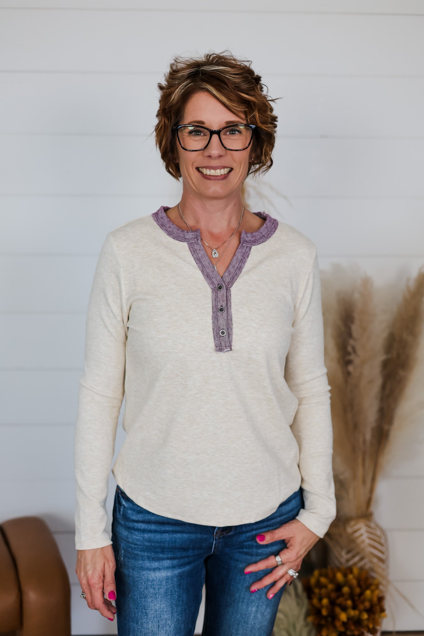 Brighten your wardrobe with this cheerful color-trimmed button henley! Crafted from stretchy, soft fabric with delicate micro ribbed detailing, it's the perfect blend of comfort and style. The long sleeves and playful color accents make it ideal for layering or wearing solo. Whether you're dressing up or keeping it casual, this versatile top brings a pop of personality to any outfit.