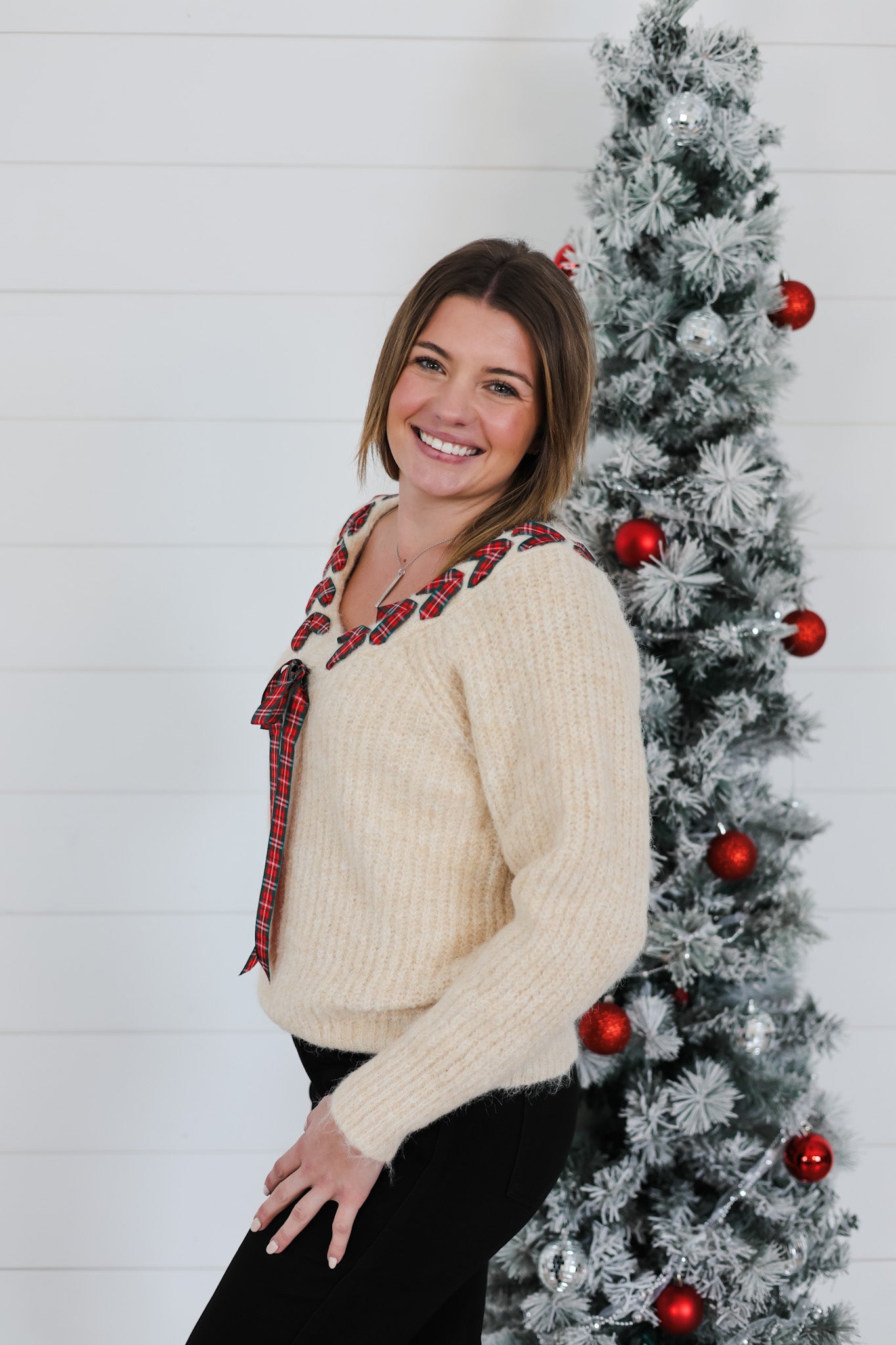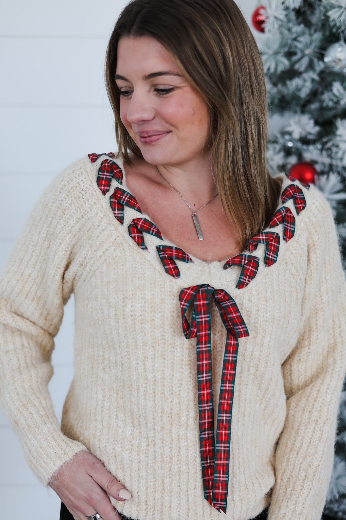 Celebrate the season in style with this charming Deck The Halls Top, featuring a festive plaid pattern that brings holiday cheer to your everyday wardrobe. The flattering V-neckline offers a classic silhouette, while delicate braided ribbon detailing adds a whimsical touch that catches the eye. Perfect for holiday gatherings, casual outings, or cozy nights in, this playful piece combines traditional plaid with modern flair. Mix and match with your favorite bottoms for endless seasonal styling possibilities.