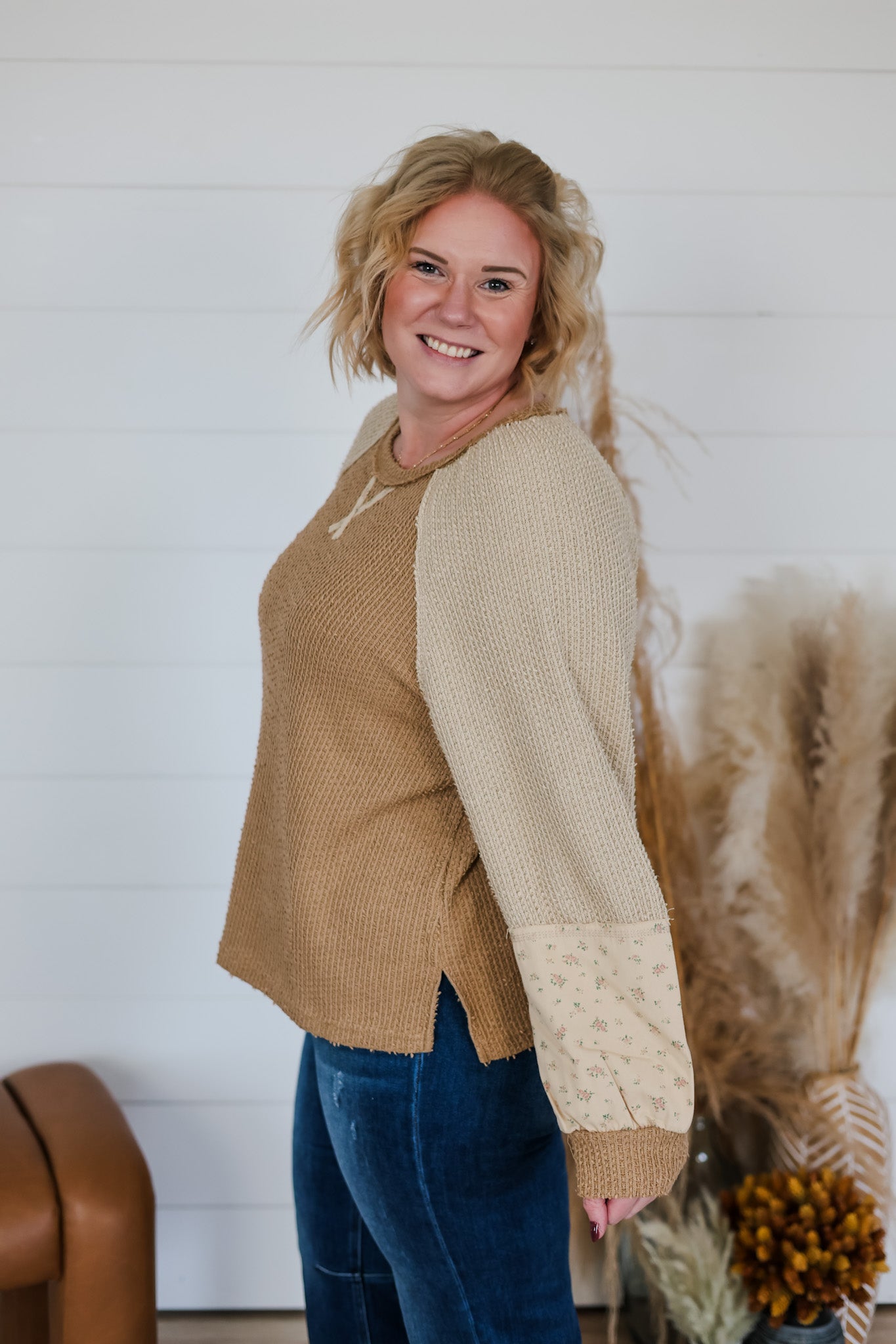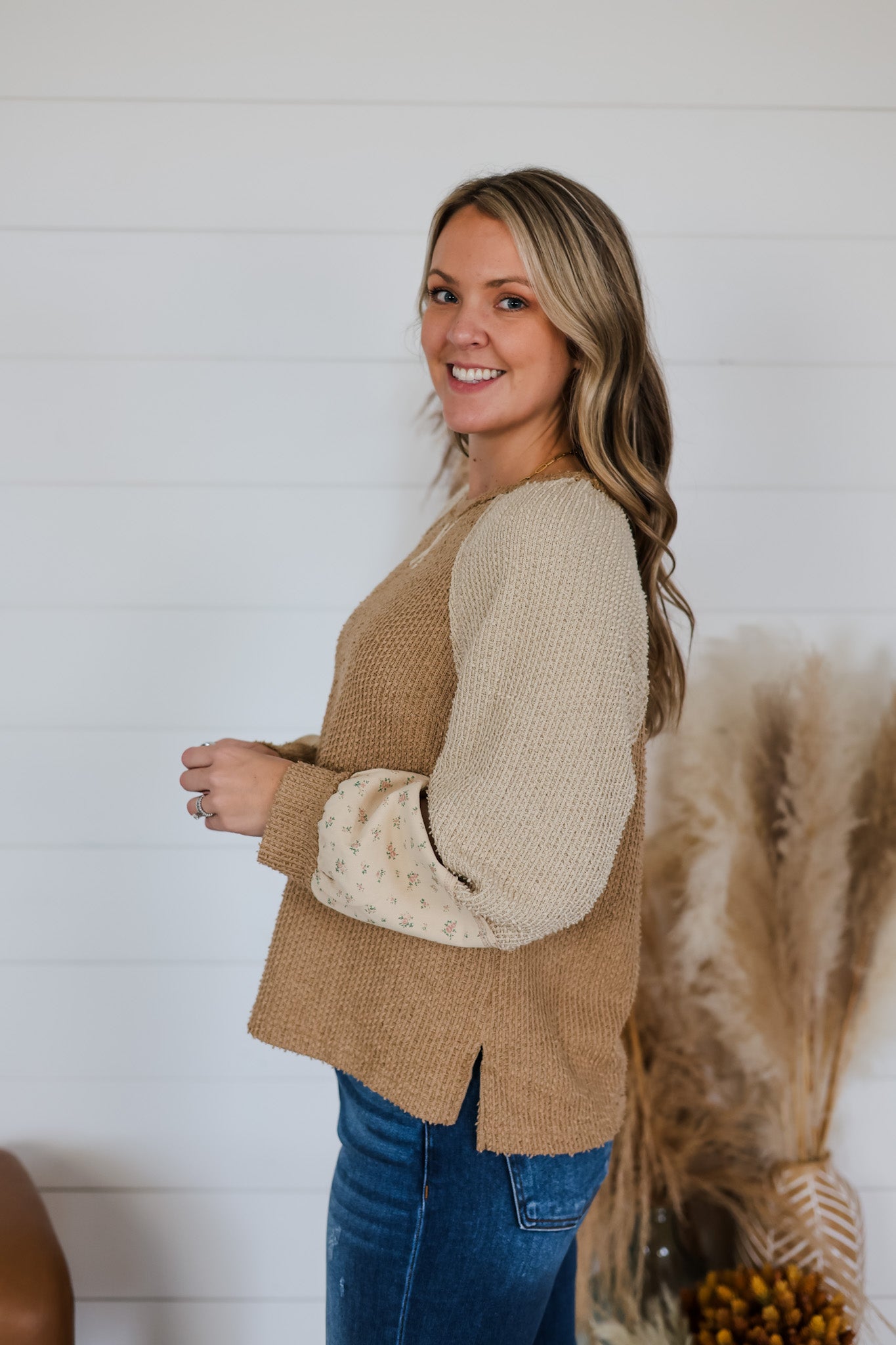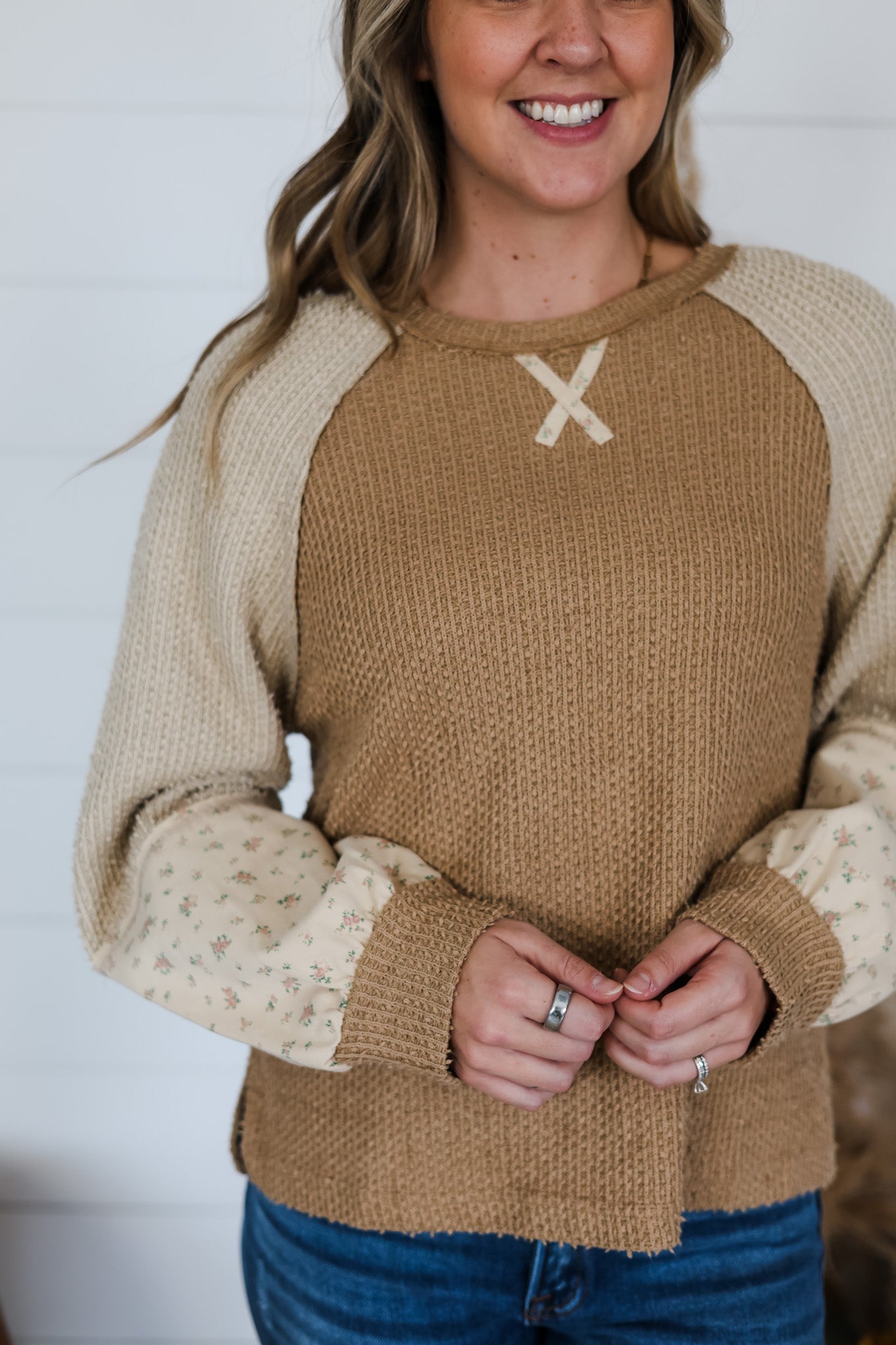 Throw on this playful raglan sleeve top and let the color-blocked design do the talking. Featuring a charming floral print, cozy textured knit fabric, and those effortlessly cool raw edge details, it's got personality for days. The long sleeves and round neckline keep things classic, while the side slits add just the right amount of sass. Perfect for casual days when you want to look put-together without trying too hard.