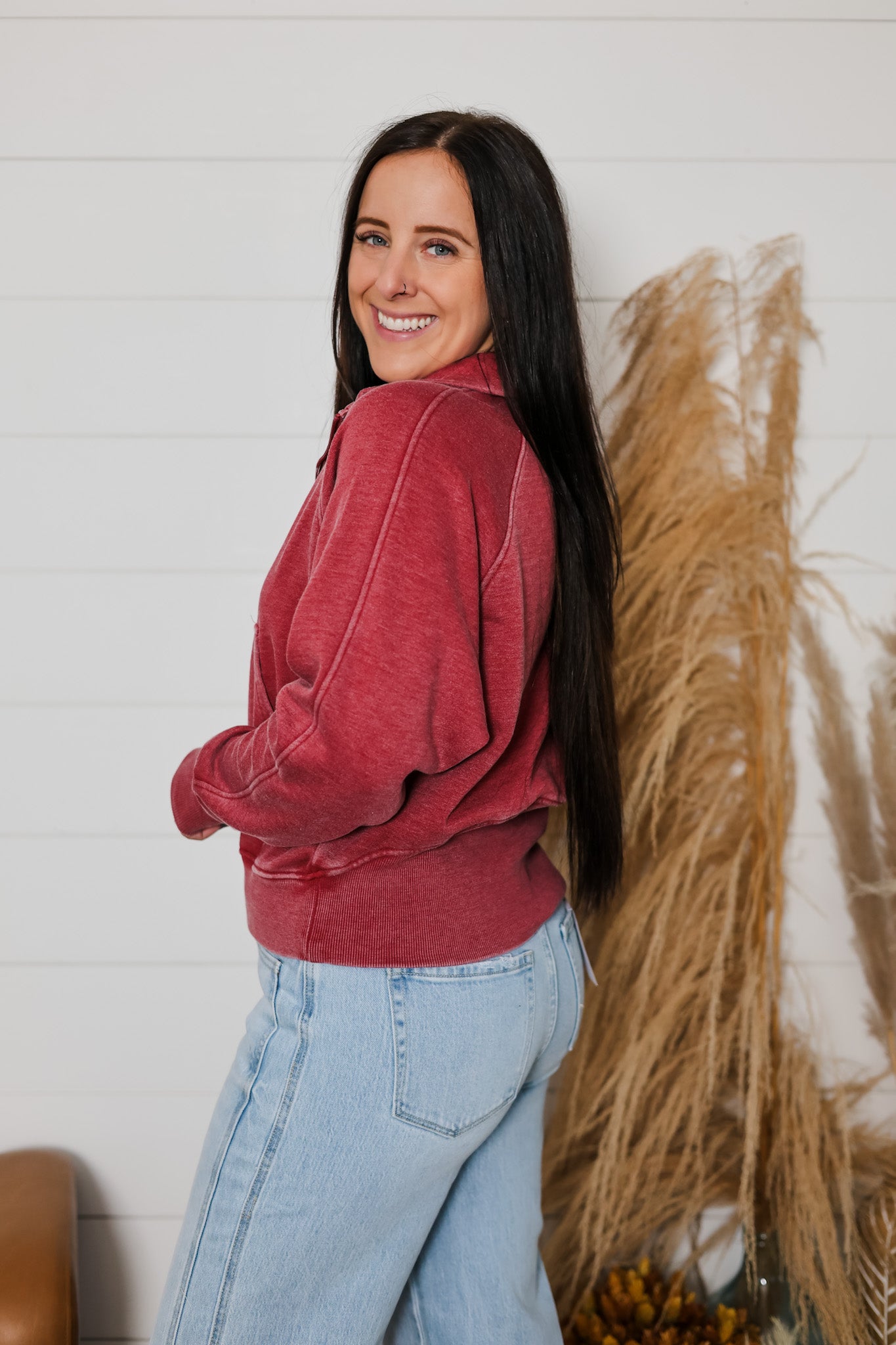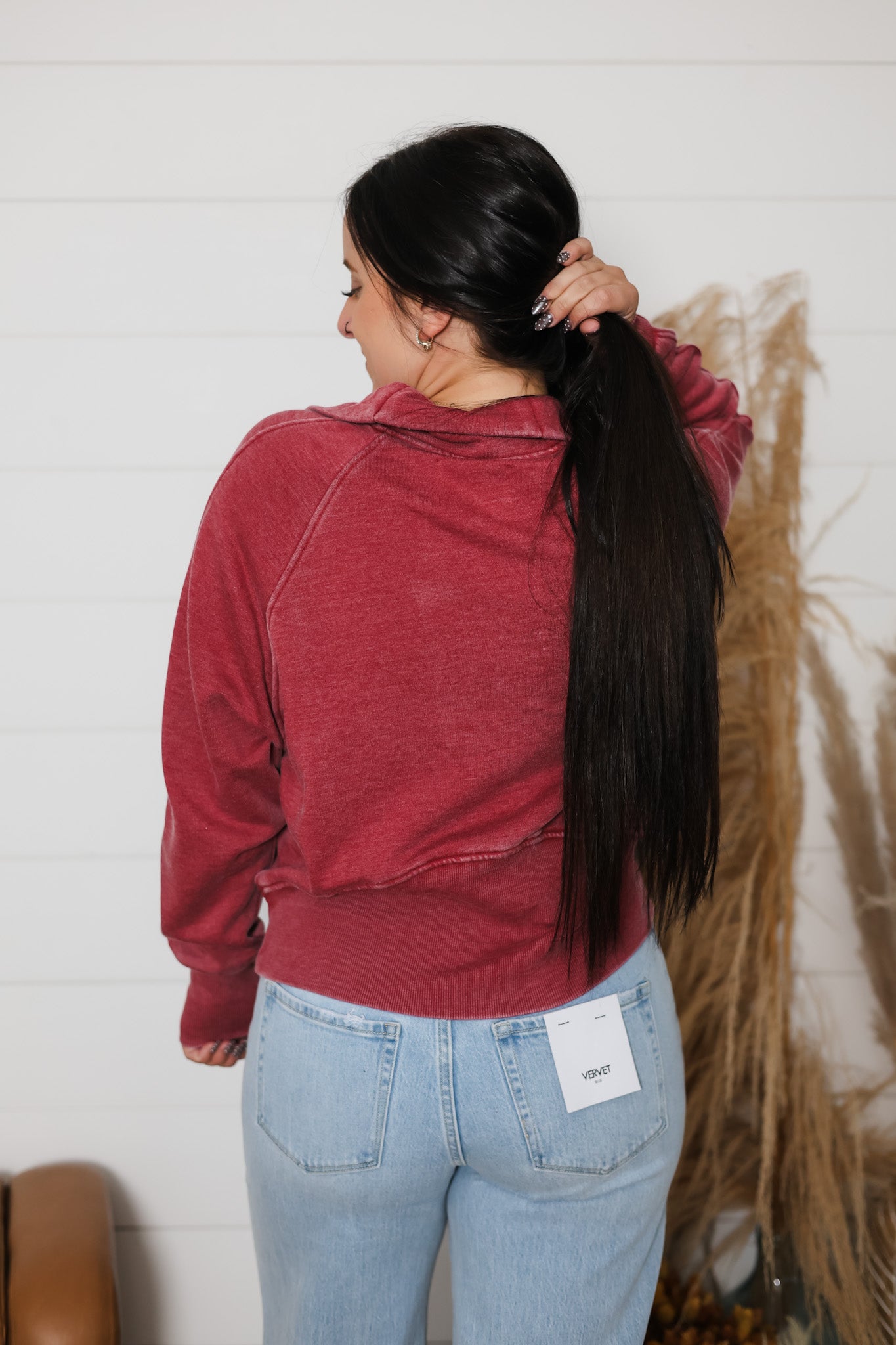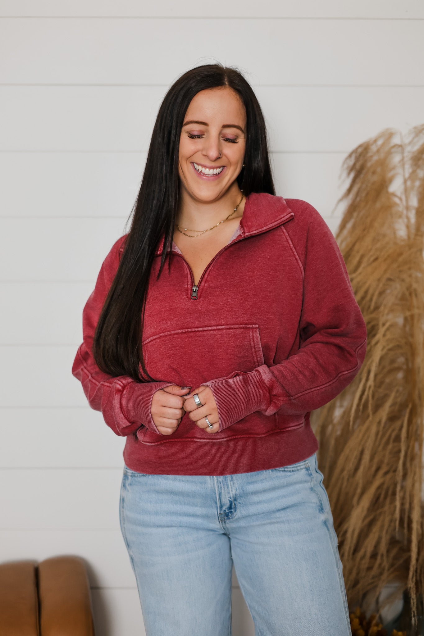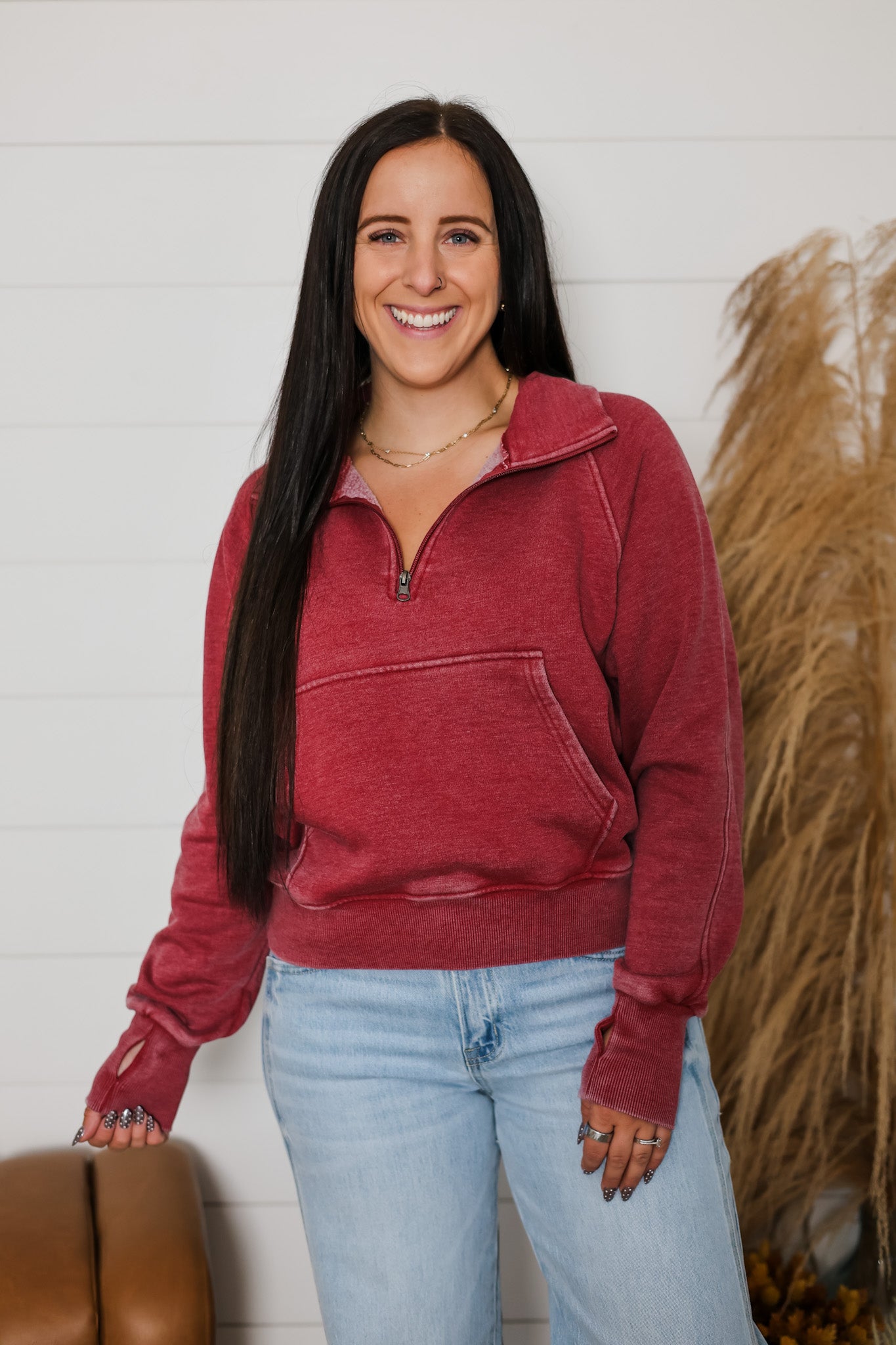 Don't Let It Go Top is a bright-colored cropped funnel neck sweatshirt imported garment. This top features a quarter zipper closure, long sleeves with thumbholes, and a front kangaroo pocket for added convenience. Its slightly cropped hemline adds a touch of style while keeping you comfortable.