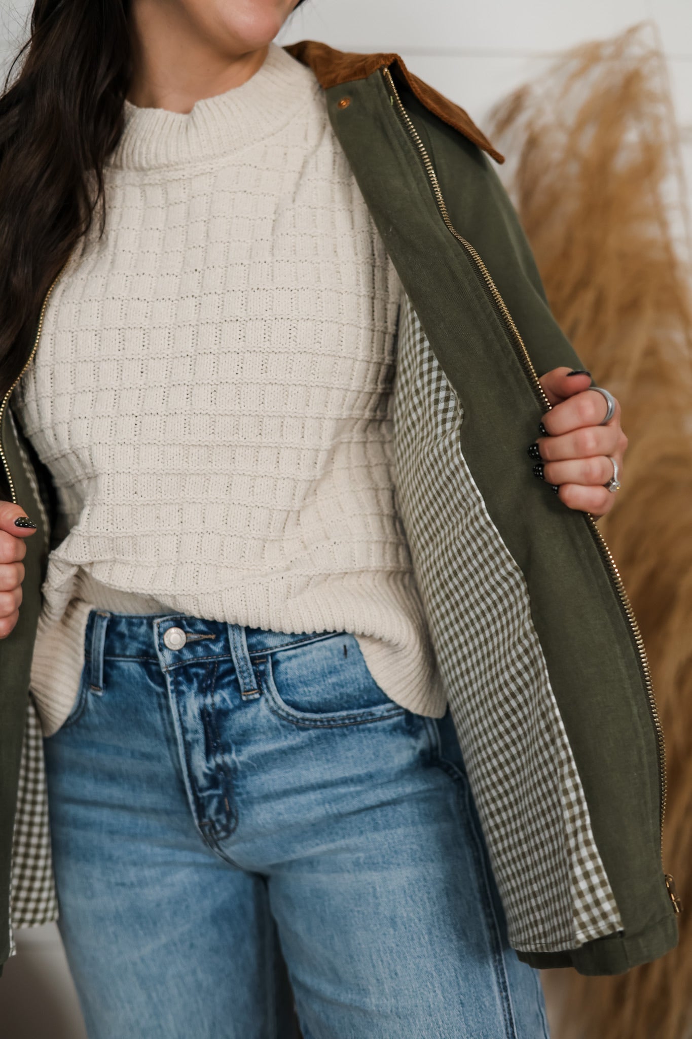Effortlessly cool meets timeless charm with the Down The List Jacket. Crafted from sturdy cotton with zero stretch, this barn jacket features a standout corduroy neck collar and gleaming gold zipper that catches the light just right. The flowy bottom fit skims your silhouette without clinging, while the cheerful gingham liner peeks out for an unexpected pop of personality. A trending piece that proves the best style moments happen when you stop overthinking it.