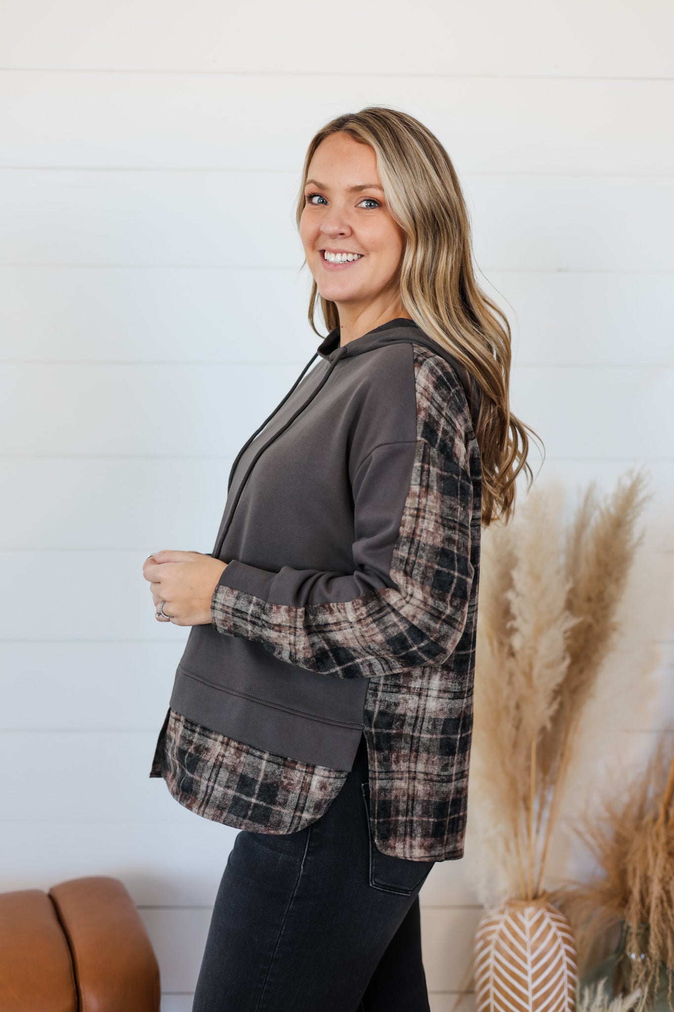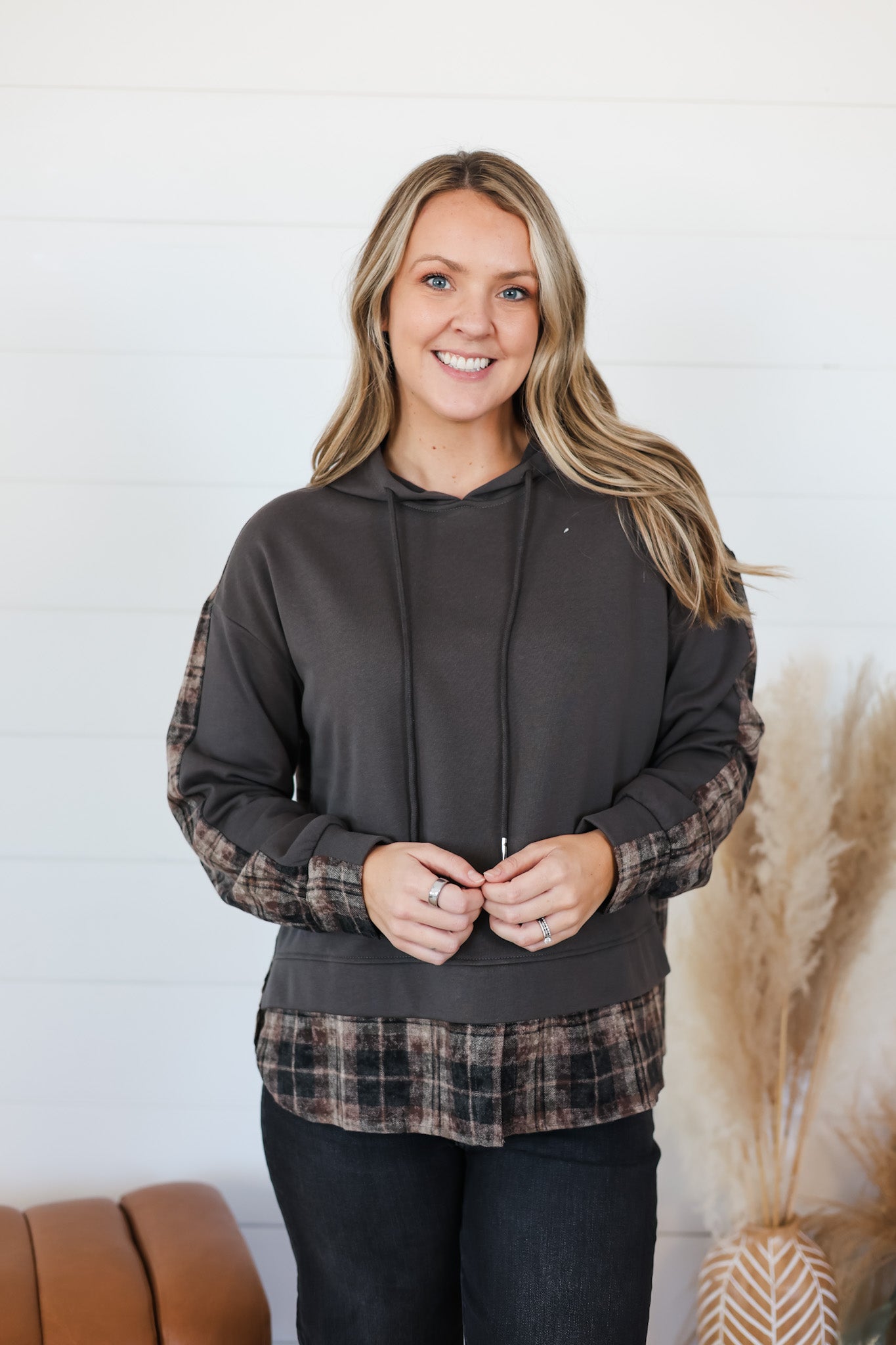 Cozy meets cool with the Eyes On You Top, a playful pullover hoodie that blends the best of both worlds. Crafted from soft french terry paired with classic flannel plaid, this mixed-fabric design keeps things interesting while wrapping you in comfort. Perfect for layering on chilly days or throwing on for effortless weekend vibes. The relaxed fit and hoodie silhouette make it your new go-to for casual style that actually feels as good as it looks.