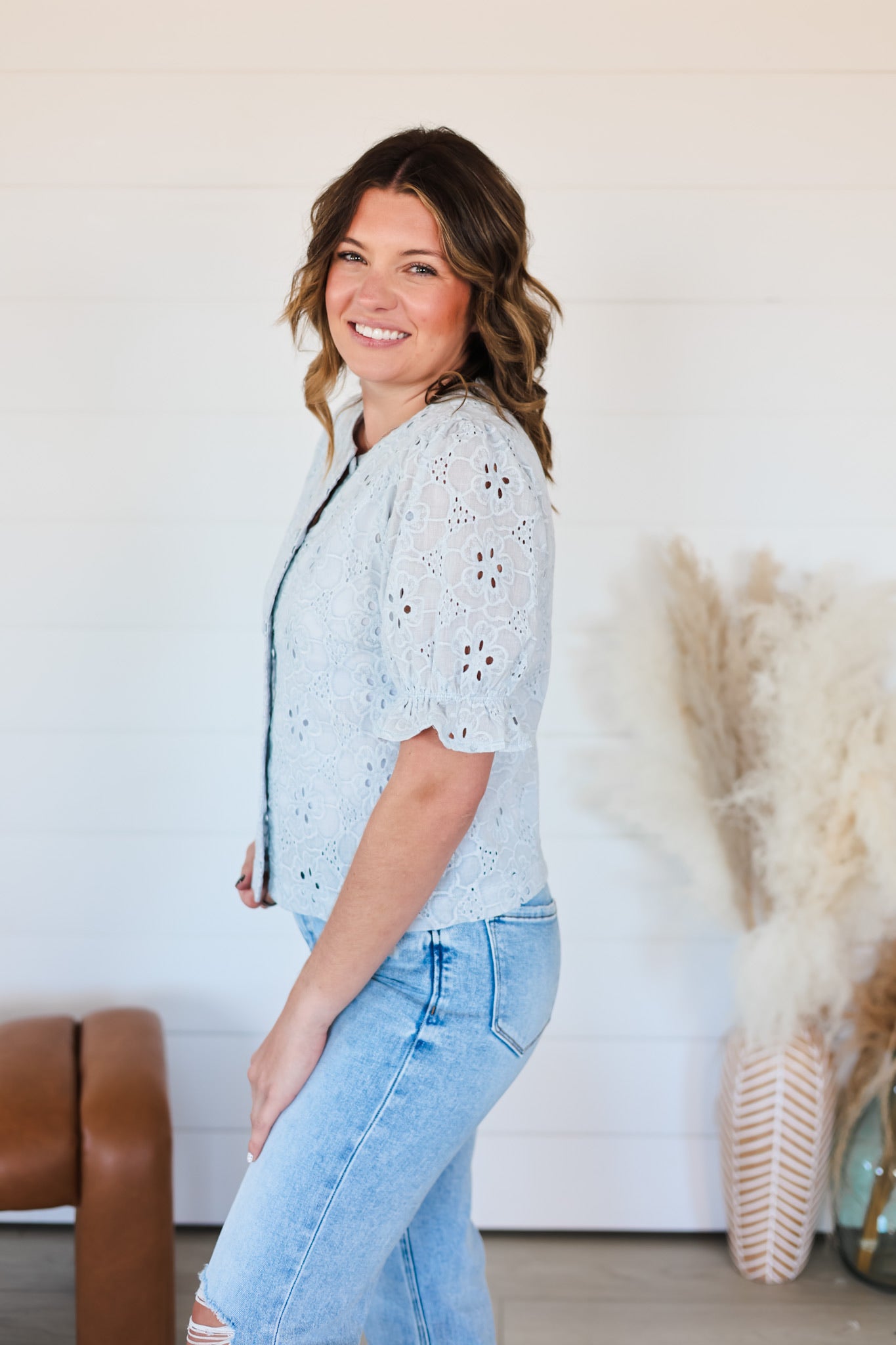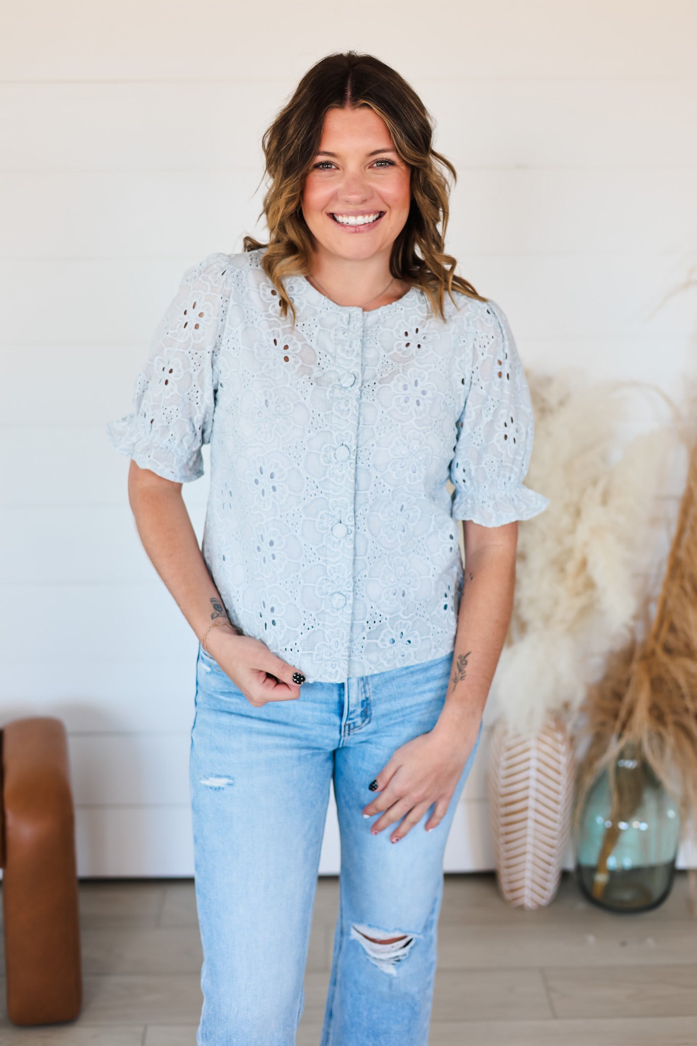 Embrace effortless charm with the Fresh Outlook Top, where delicate floral embroidery meets modern style. This button-down beauty features romantic puff sleeves that add a playful twist to your everyday wardrobe. The cropped silhouette pairs perfectly with high-waisted bottoms for a flattering, on-trend look. Whether you're dressing up for brunch or keeping it casual, this versatile piece brings a touch of whimsy to any outfit.