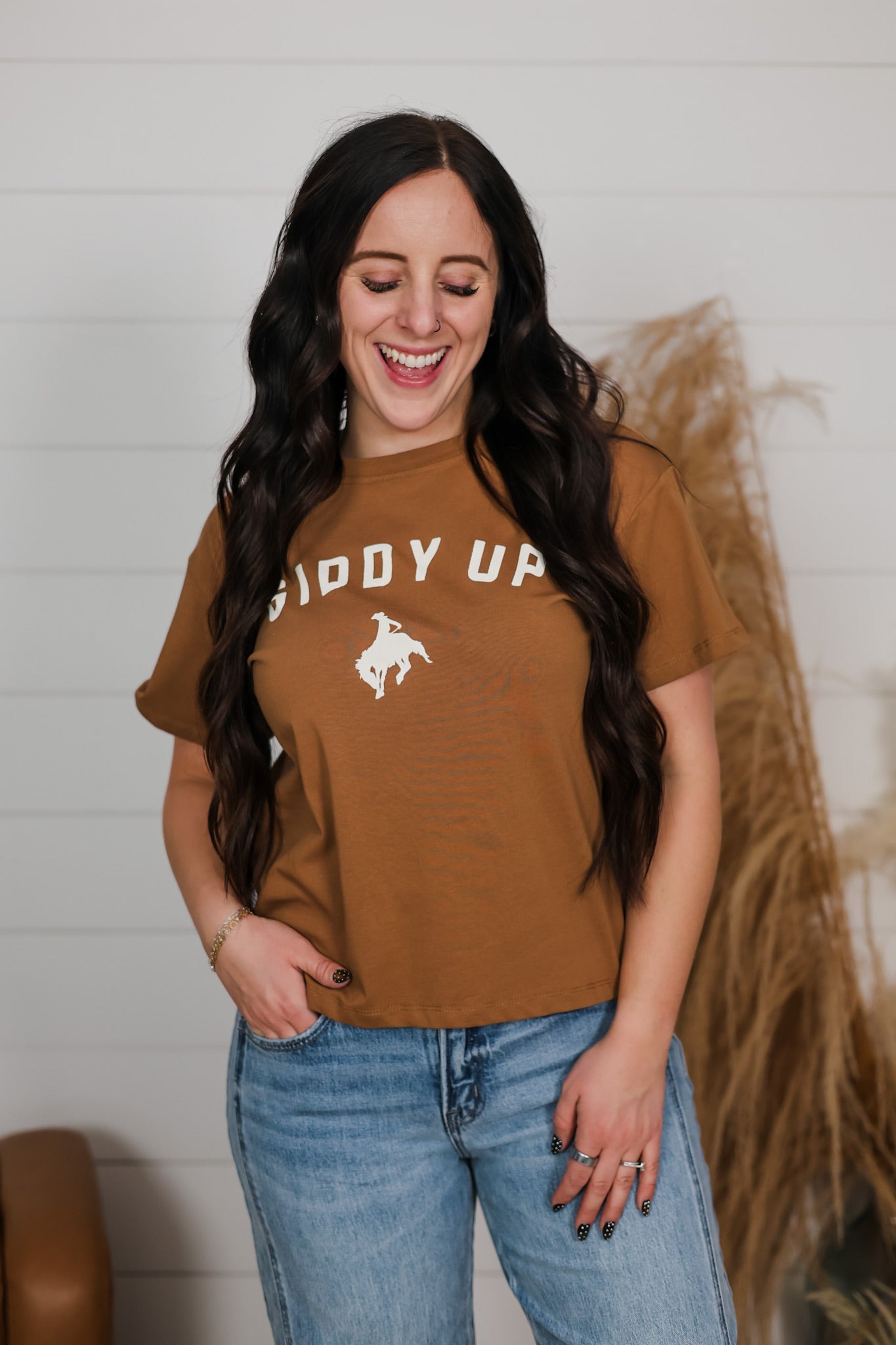 Saddle up in style with our GIDDY UP Top—a boxy fit tee that brings Western charm with a fun twist. Featuring lettering across the chest, this relaxed silhouette is perfect for casual days when you want to make a statement. The roomy cut ensures all-day comfort, while the playful design adds personality to any outfit. Whether you're channeling cowgirl energy or just love a good laugh, this top delivers attitude and ease in one wearable package.