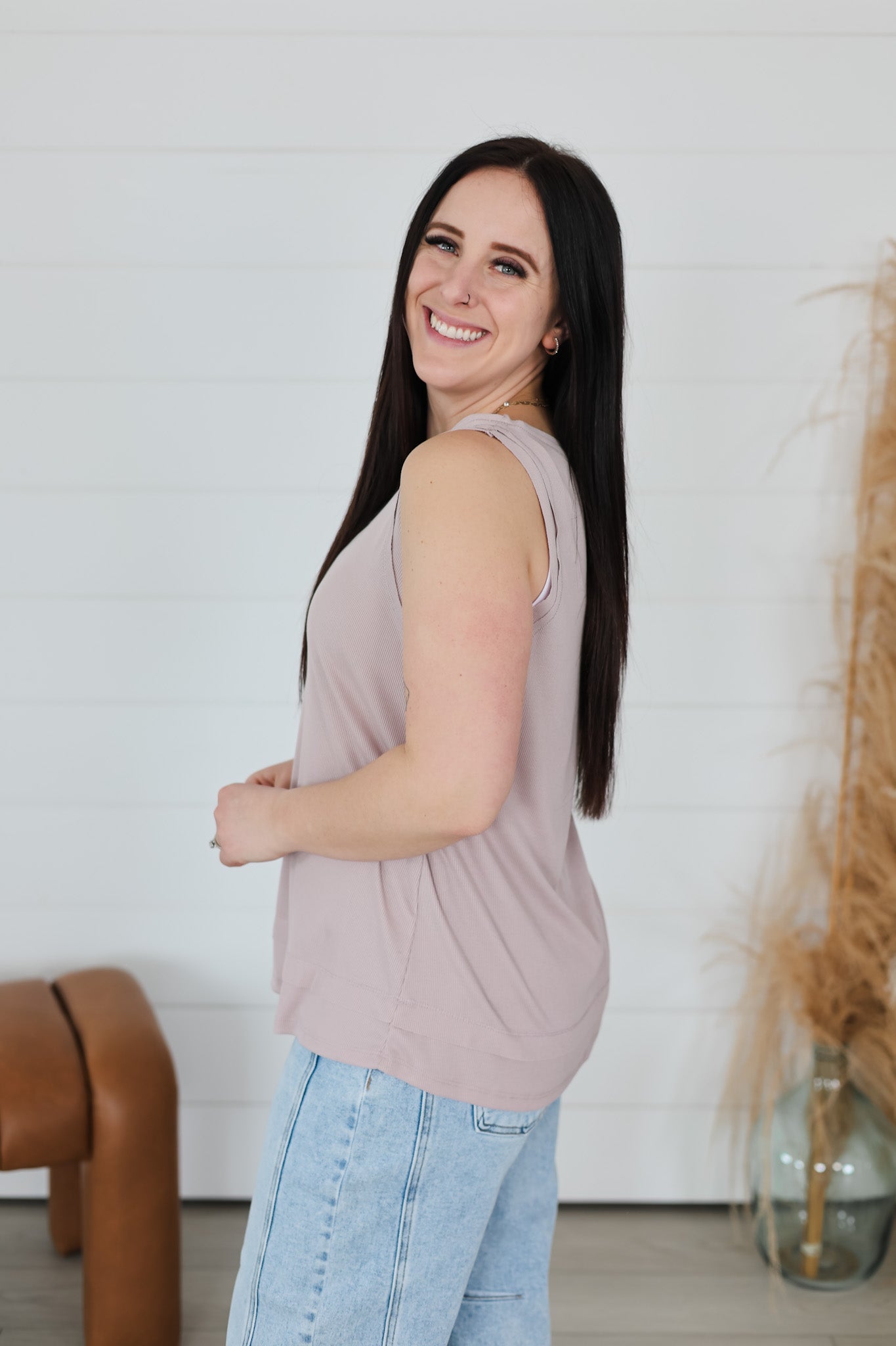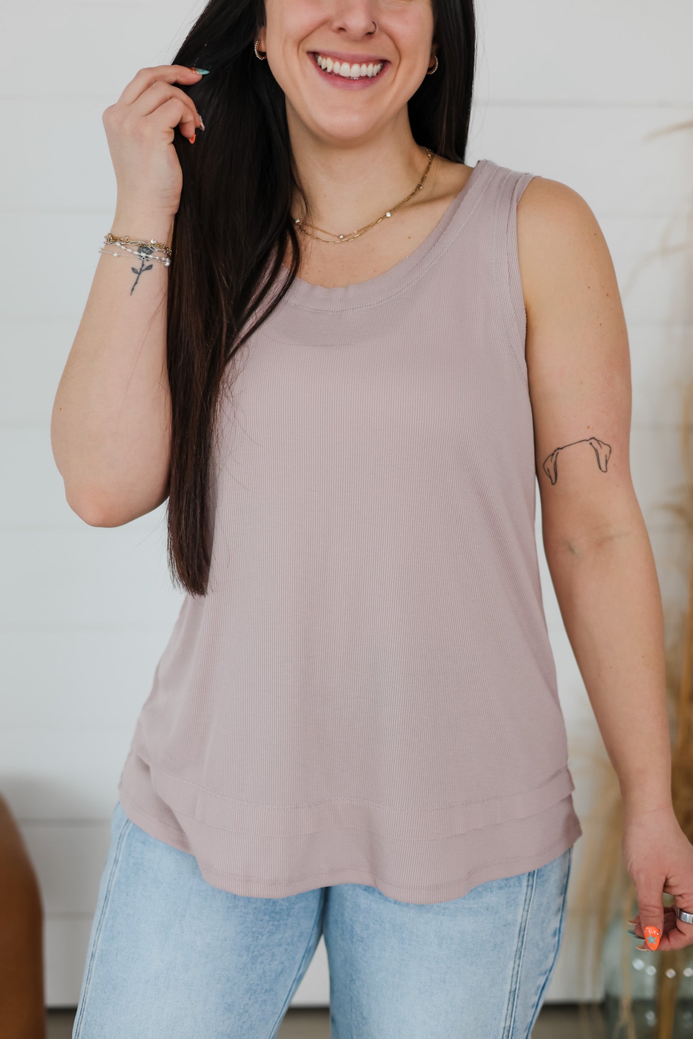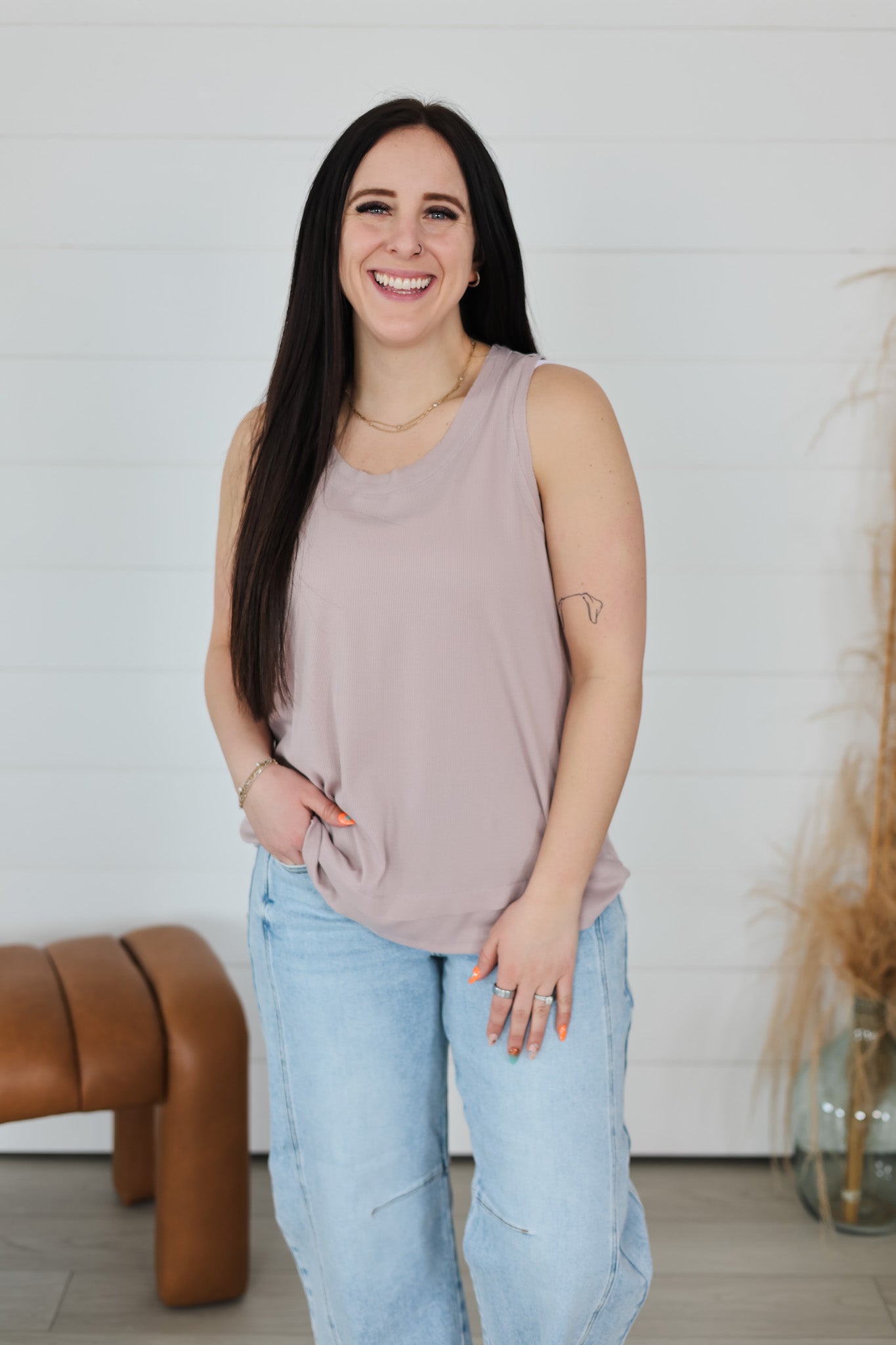 Baby ribbed tank top featuring a raw edge details for a subtle, edgy touch. The flattering fit on this top is so comfortable with a modern vibe to it! Perfect for layering or wearing on its own. Knit, stretchy.