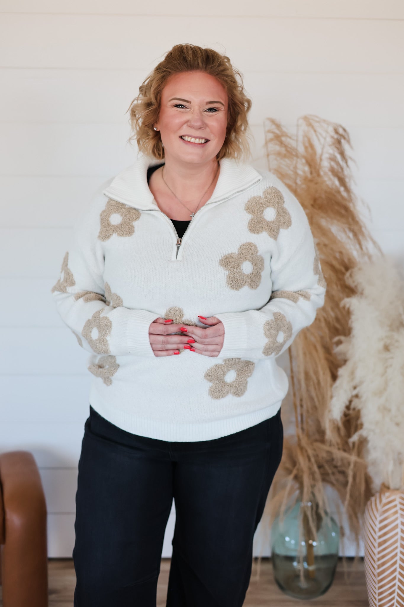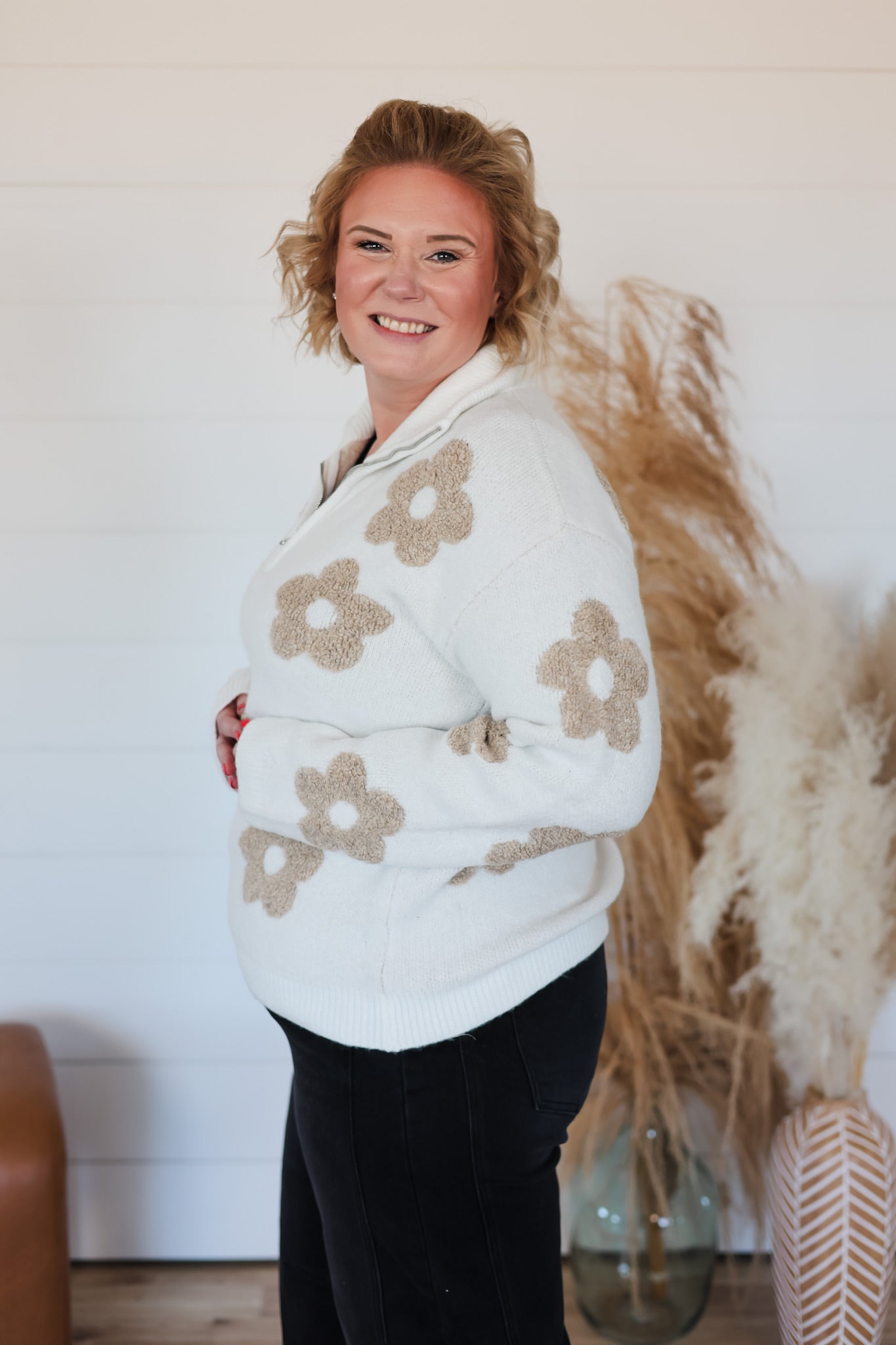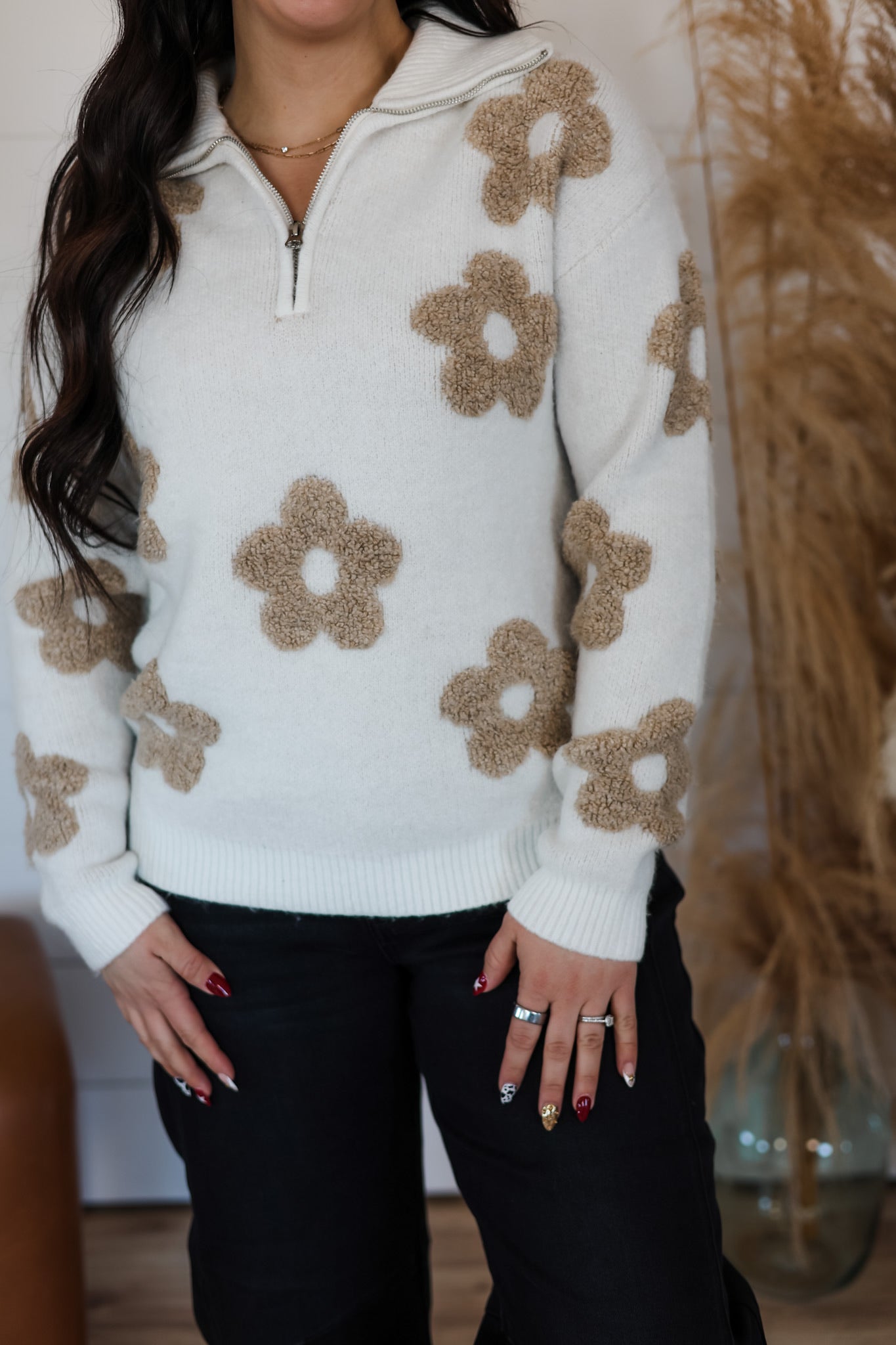 Wrap yourself in blooming style with this delightful floral jacquard half-zip sweater. Crafted from incredibly soft fabric that feels like a gentle hug, it's perfect for layering or wearing solo. The cheerful floral pattern brings instant joy to any outfit, while the half-zip neckline offers easy styling versatility. Whether you're cozying up indoors or stepping out for a casual adventure, this sweater combines comfort and charm in one irresistible package.