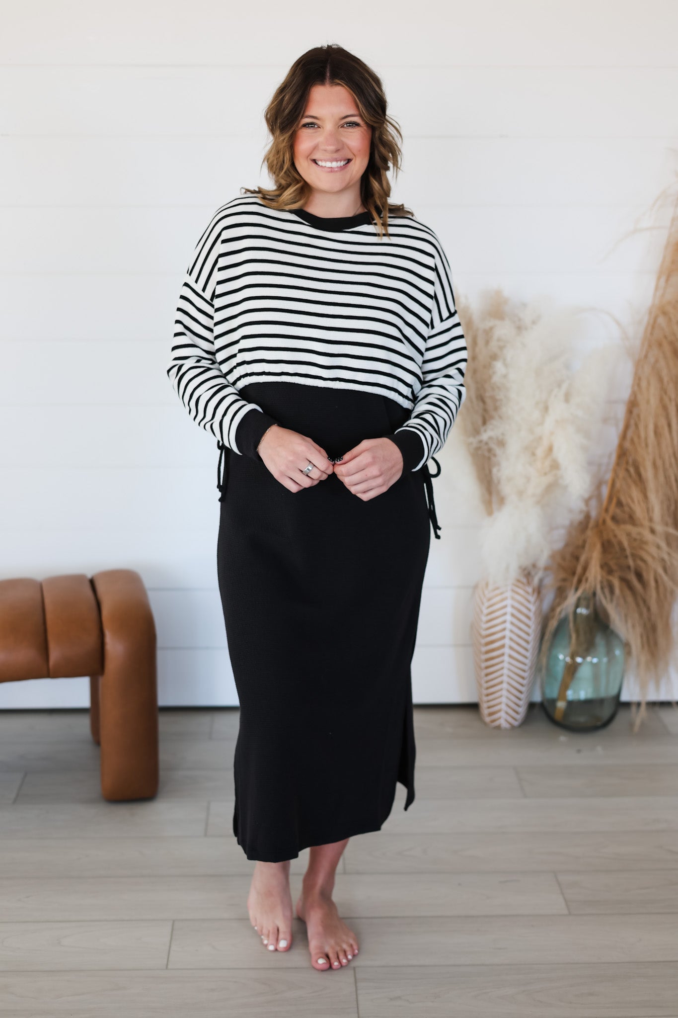 Wrap yourself in cozy comfort with the Happy Is You Dress, a delightful long-sleeve knit featuring soft, cloudy textures and charming stripes. The relaxed round neckline and flowing silhouette make it perfect for effortless days when you want to feel both snug and stylish. Whether you're lounging at home or stepping out for casual adventures, this versatile piece brings warmth and whimsy to your everyday wardrobe. A feel-good essential that celebrates comfort without compromising on charm.