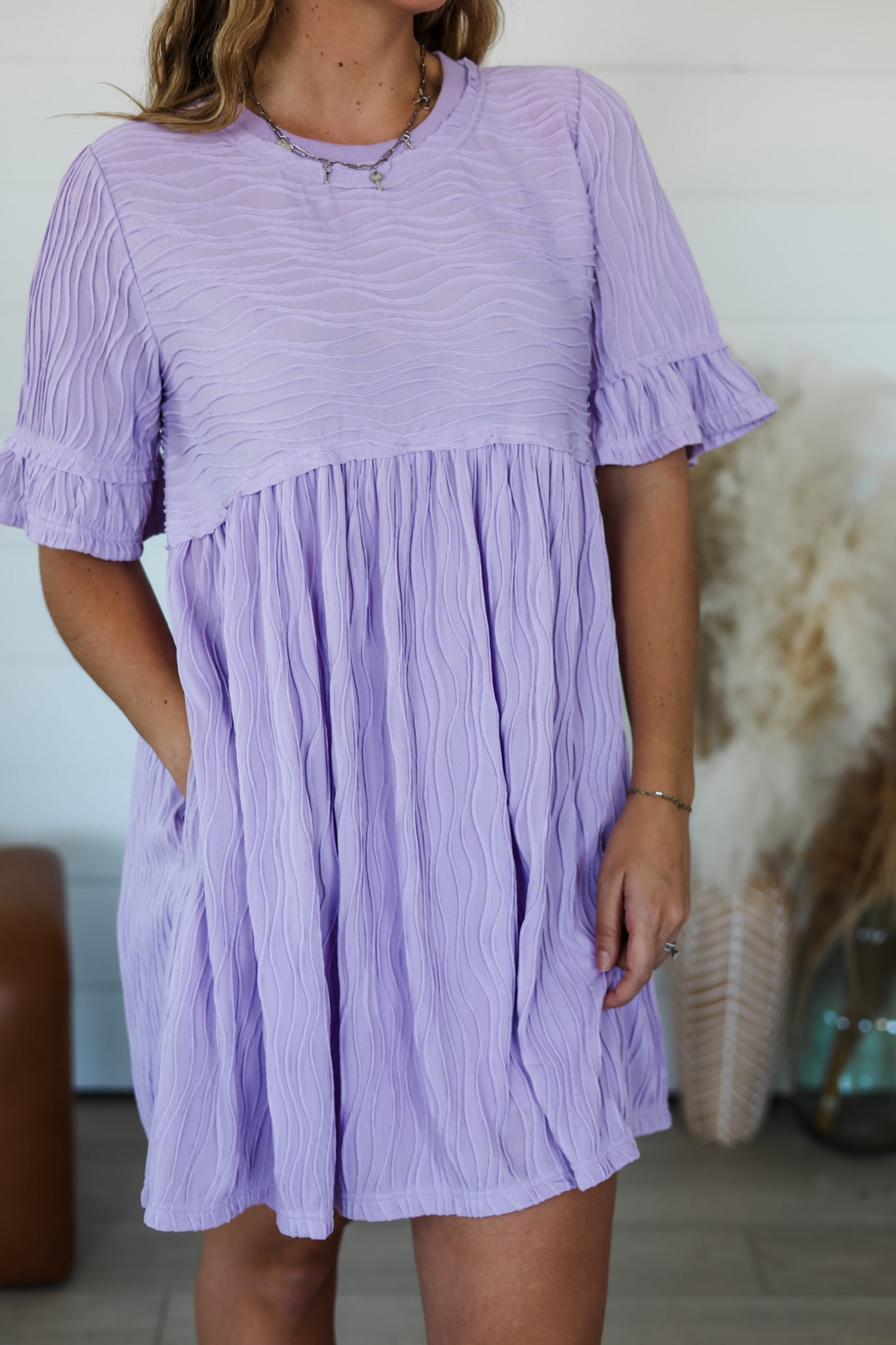 Flirty and fun, this babydoll dress features a wavy texture knit that catches the light beautifully. The round neckline and ruffled short sleeves add sweet, feminine charm, while the mini length keeps things breezy and carefree. Perfect for casual outings or dressing up your everyday look with a touch of whimsy.