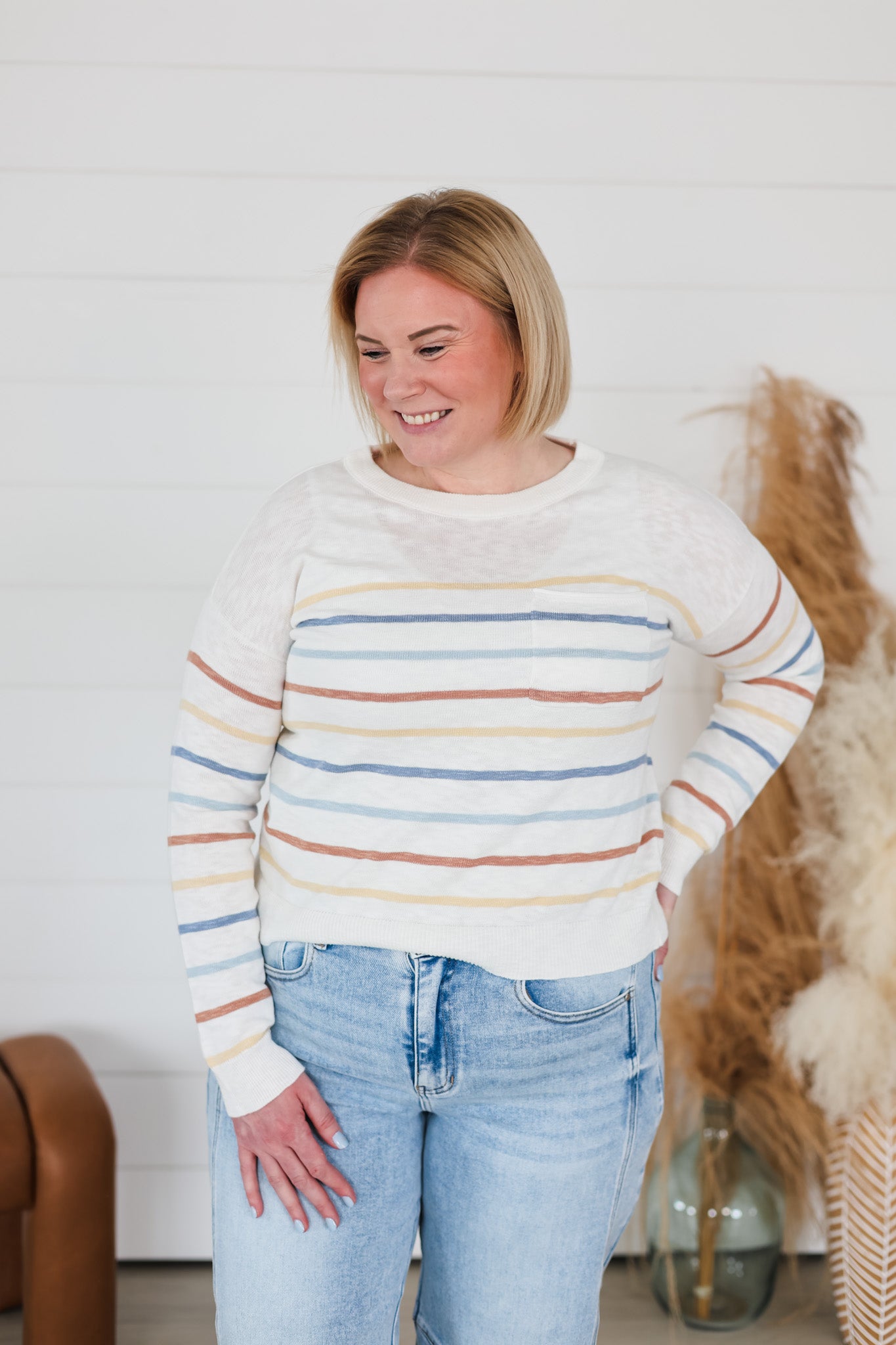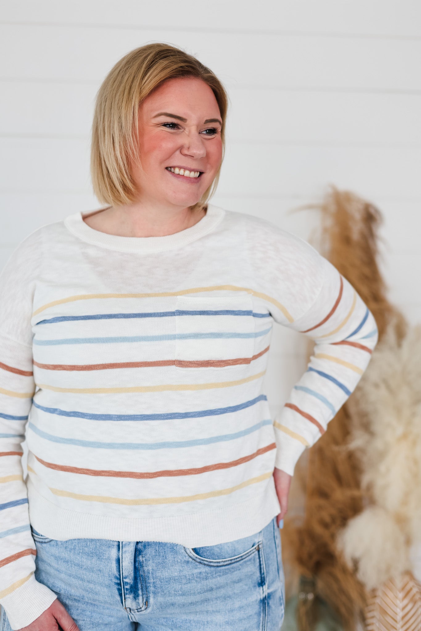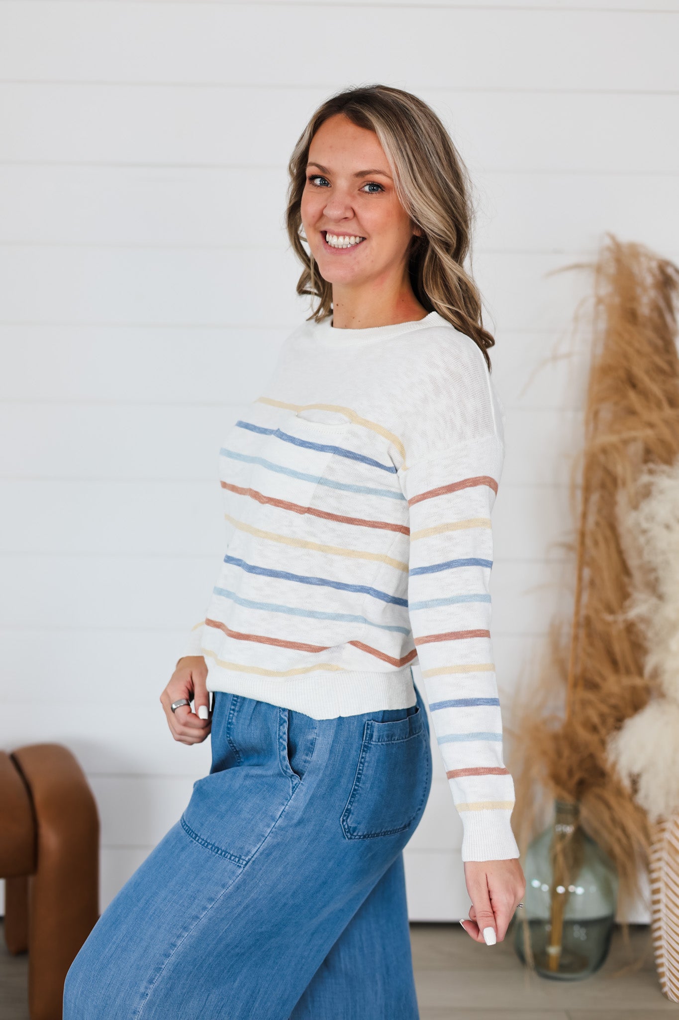 Layer up with effortless style in this striped slub sweater top. Soft, textured fabric drapes beautifully while the multi-color stripes add instant personality to any outfit. Perfect for casual days or dressing up with your favorite bottoms. The relaxed fit keeps things comfortable without sacrificing that put-together vibe. Whether you're running errands or meeting friends, this versatile piece is your go-to for looking good with zero fuss.