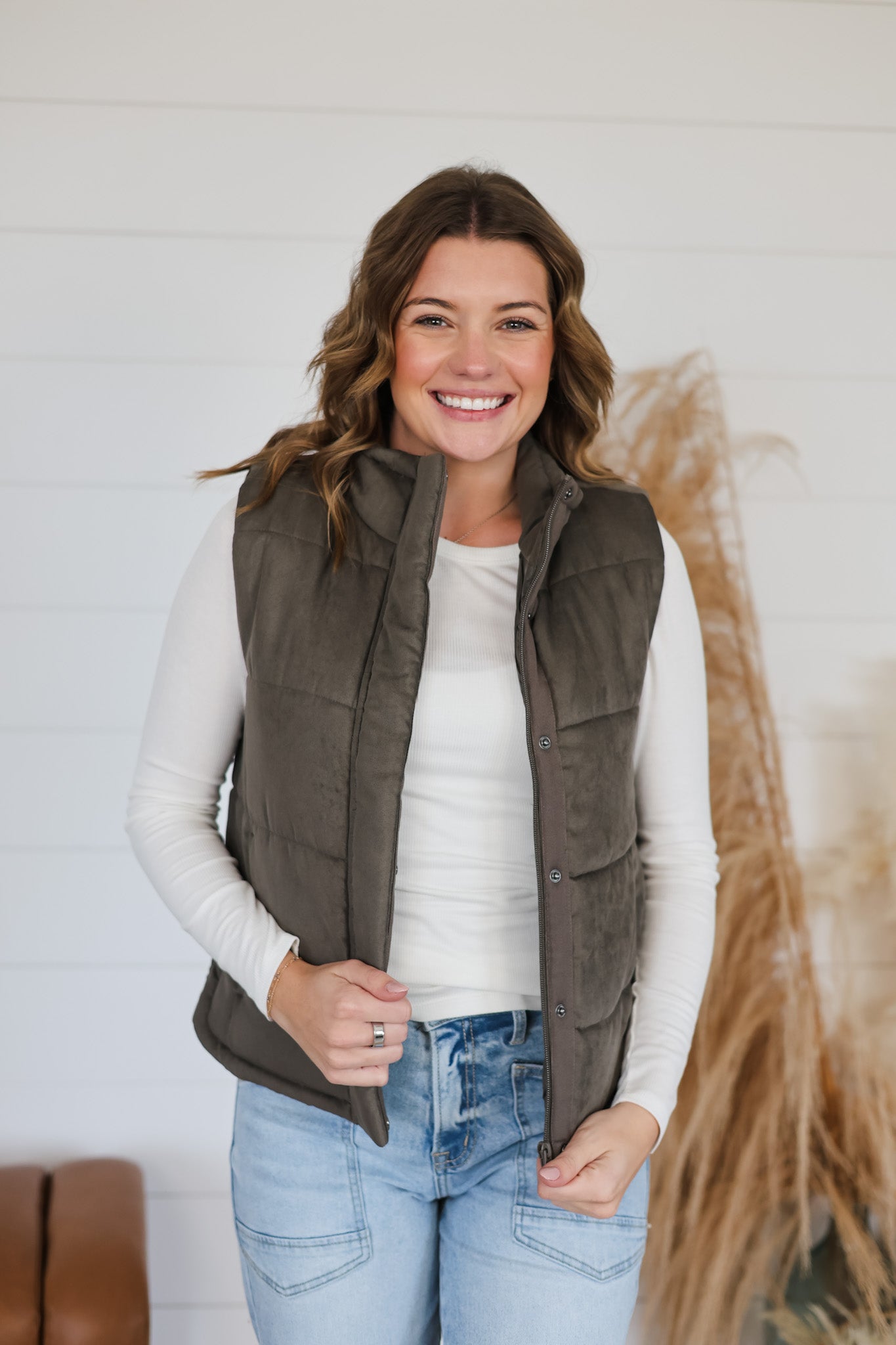 Stay cozy and stylish with the In My Heart Vest! This leather-look puffer vest features a high neck for extra warmth and a front zipper for easy wear. With handy pockets to keep your essentials close, it’s perfect for layering on chilly days while adding a fun, edgy twist to your outfit.