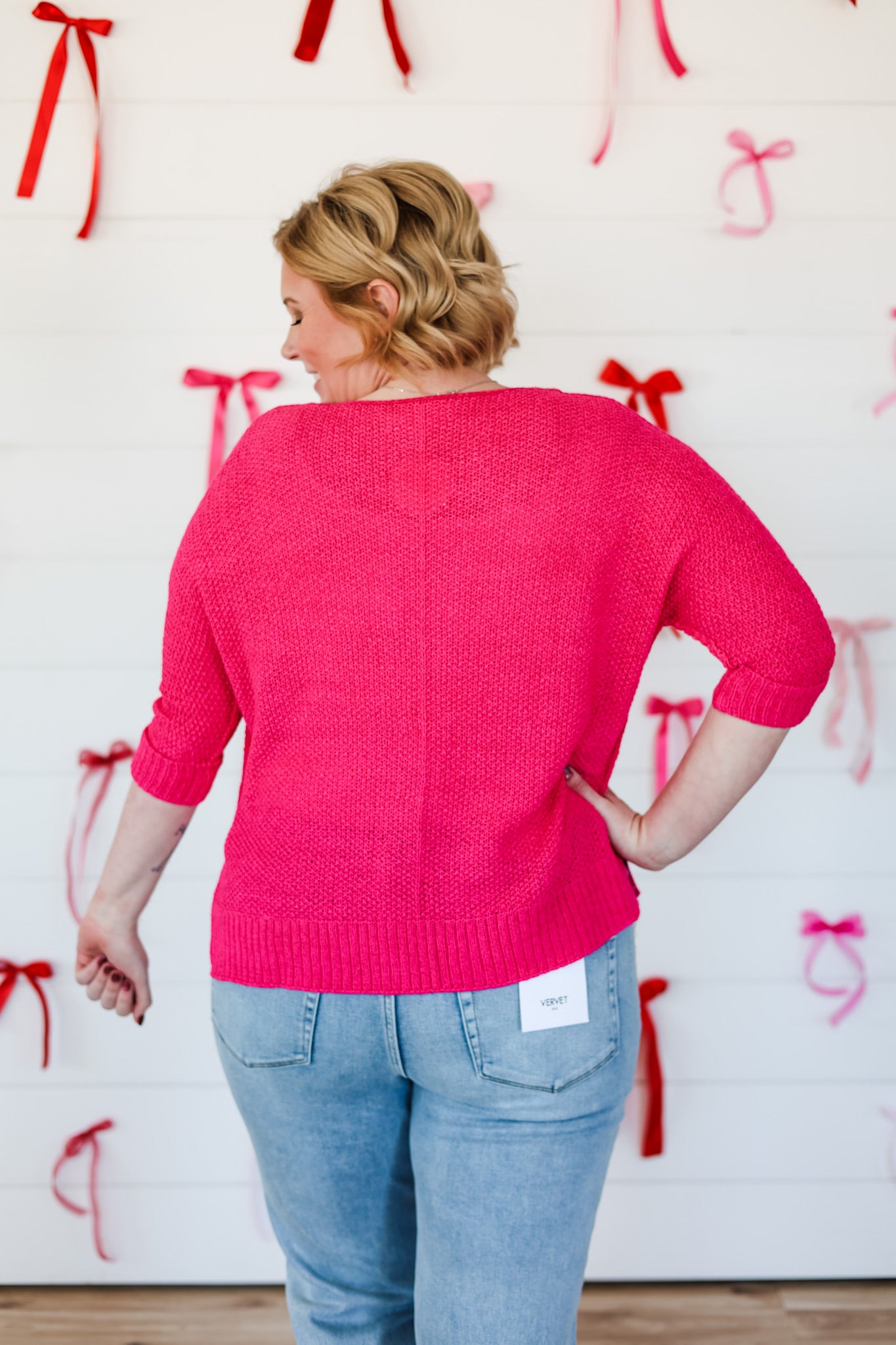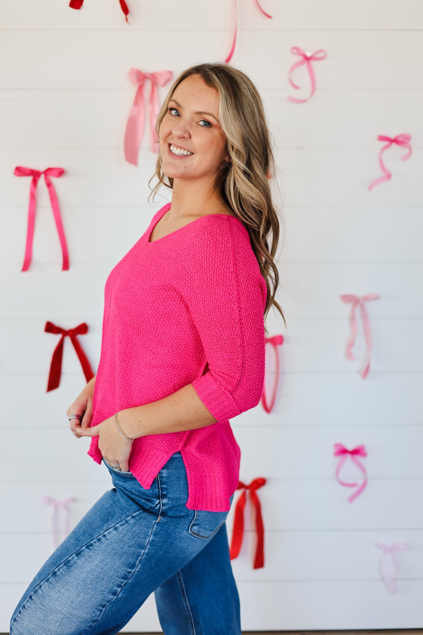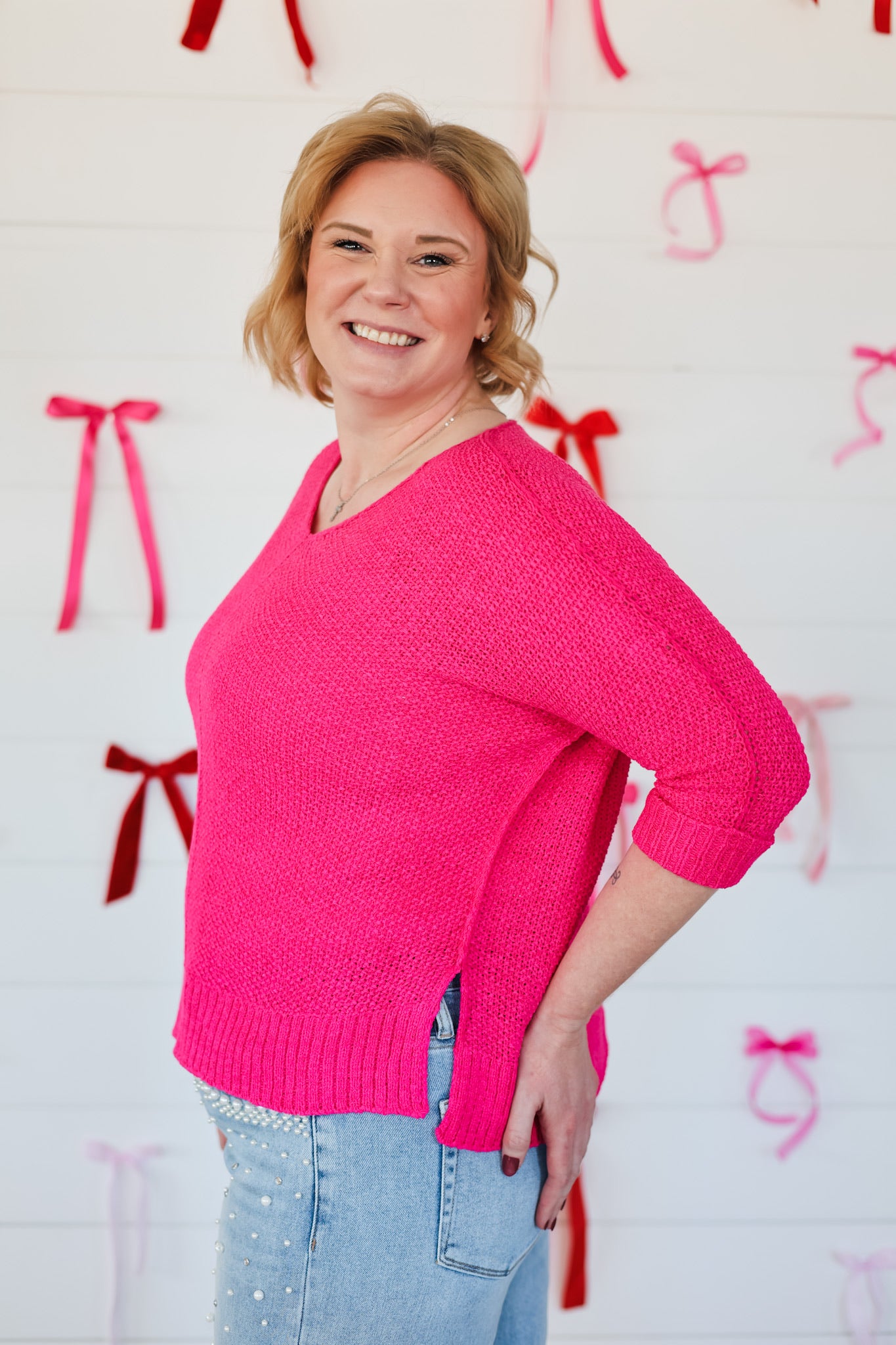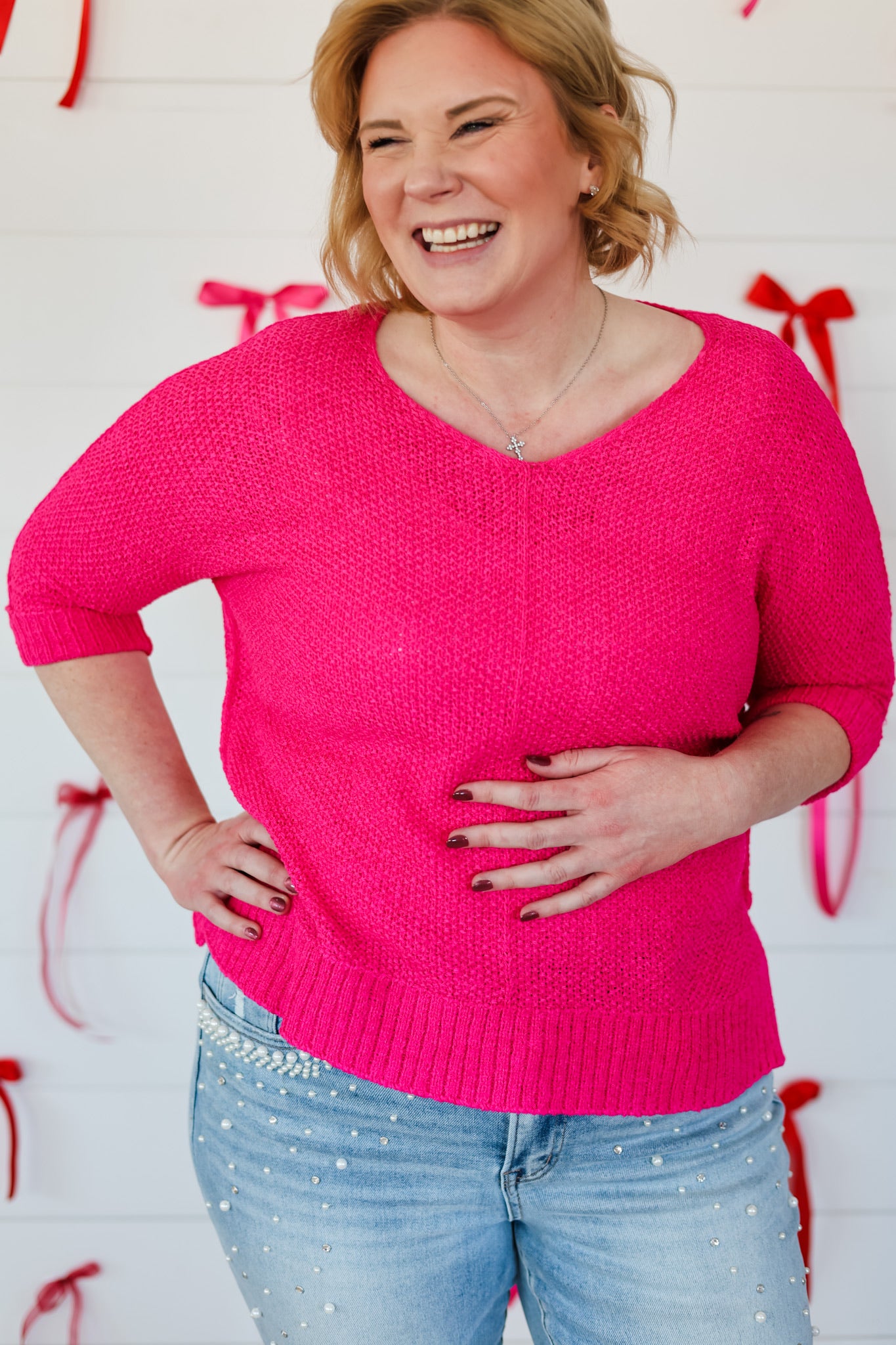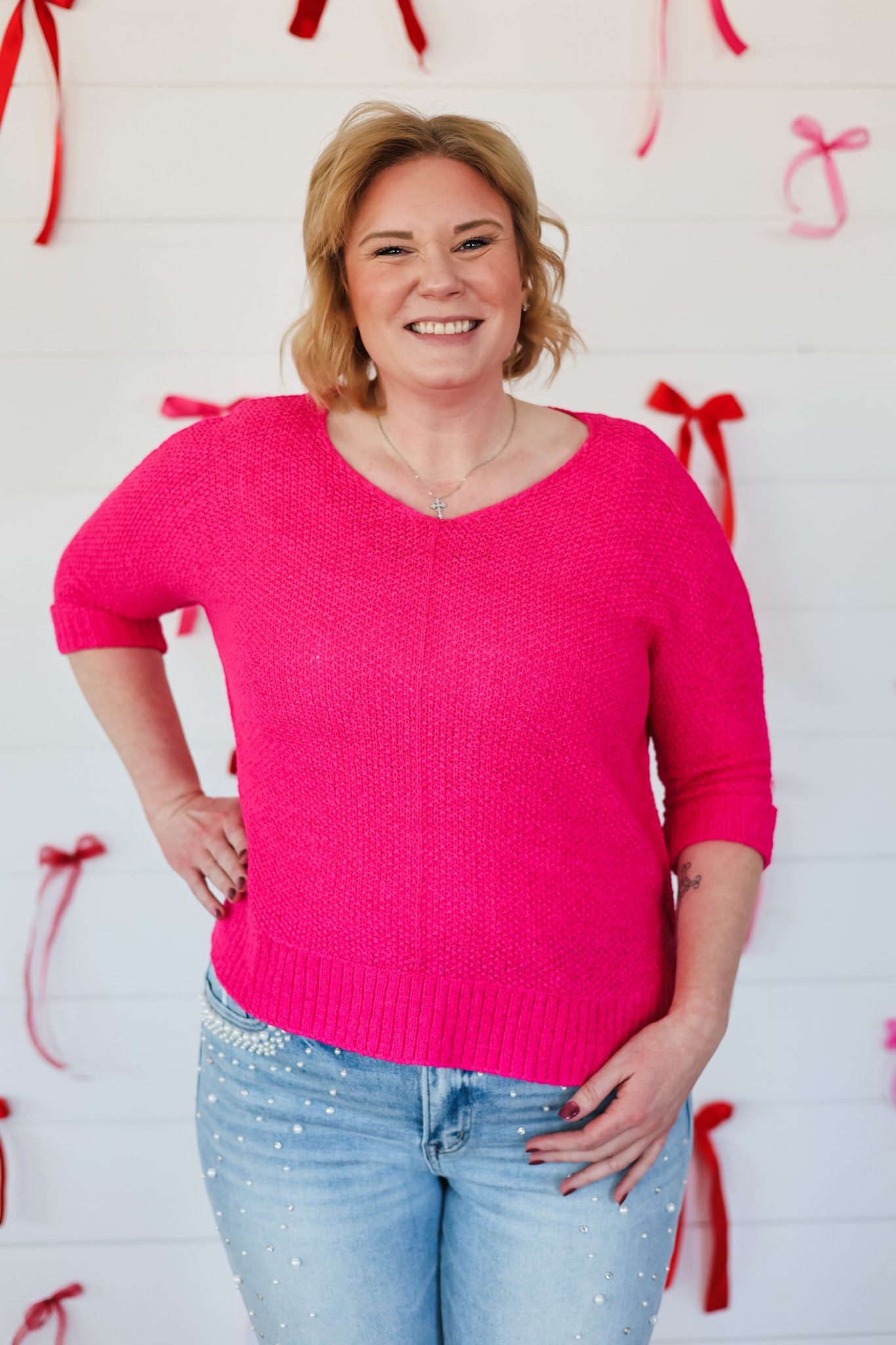 Wrap yourself in cozy charm with this oversized V-neck knit sweater that's equal parts comfort and style. The relaxed fit drapes beautifully while the three-quarter sleeves hit just right for effortless layering. Perfect for those days when you want to feel hugged by your wardrobe—because looking lovely should feel lovely too.