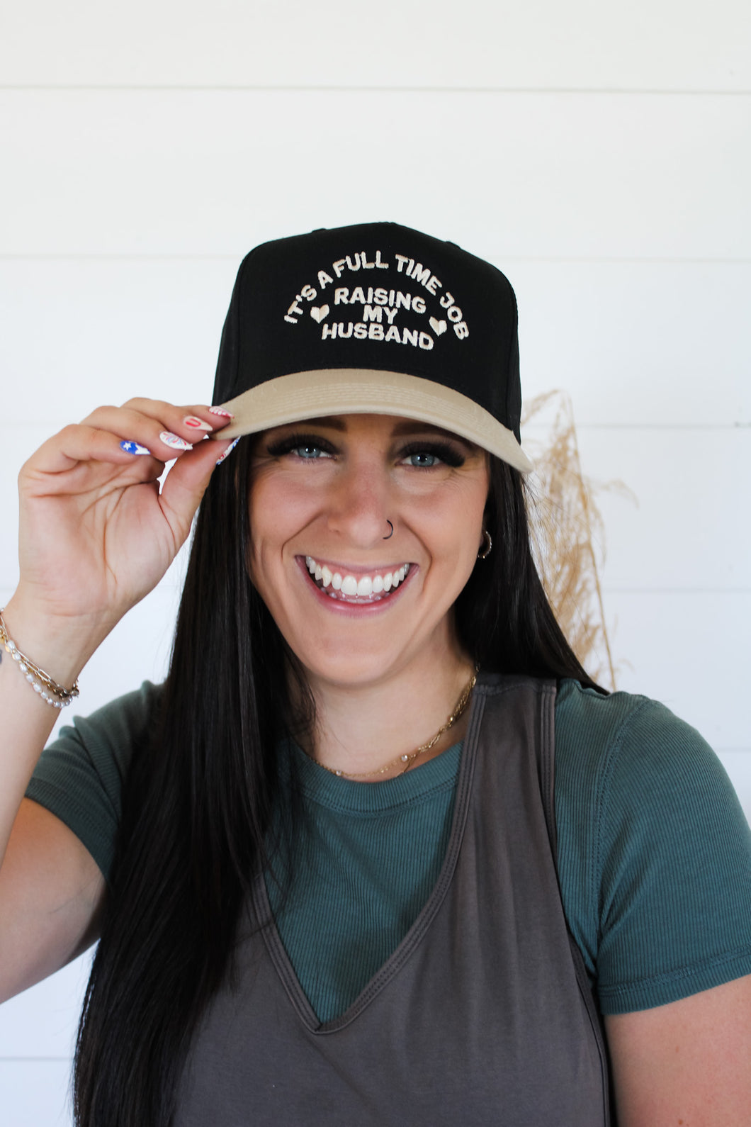 The "It's A Full Time Job Raising My Husband Embroidered Hat" is a playful, stylish statement piece. Featuring tan thread embroidery on a black/khaki hat, it's the perfect way to show off your sense of humor while staying comfortable.