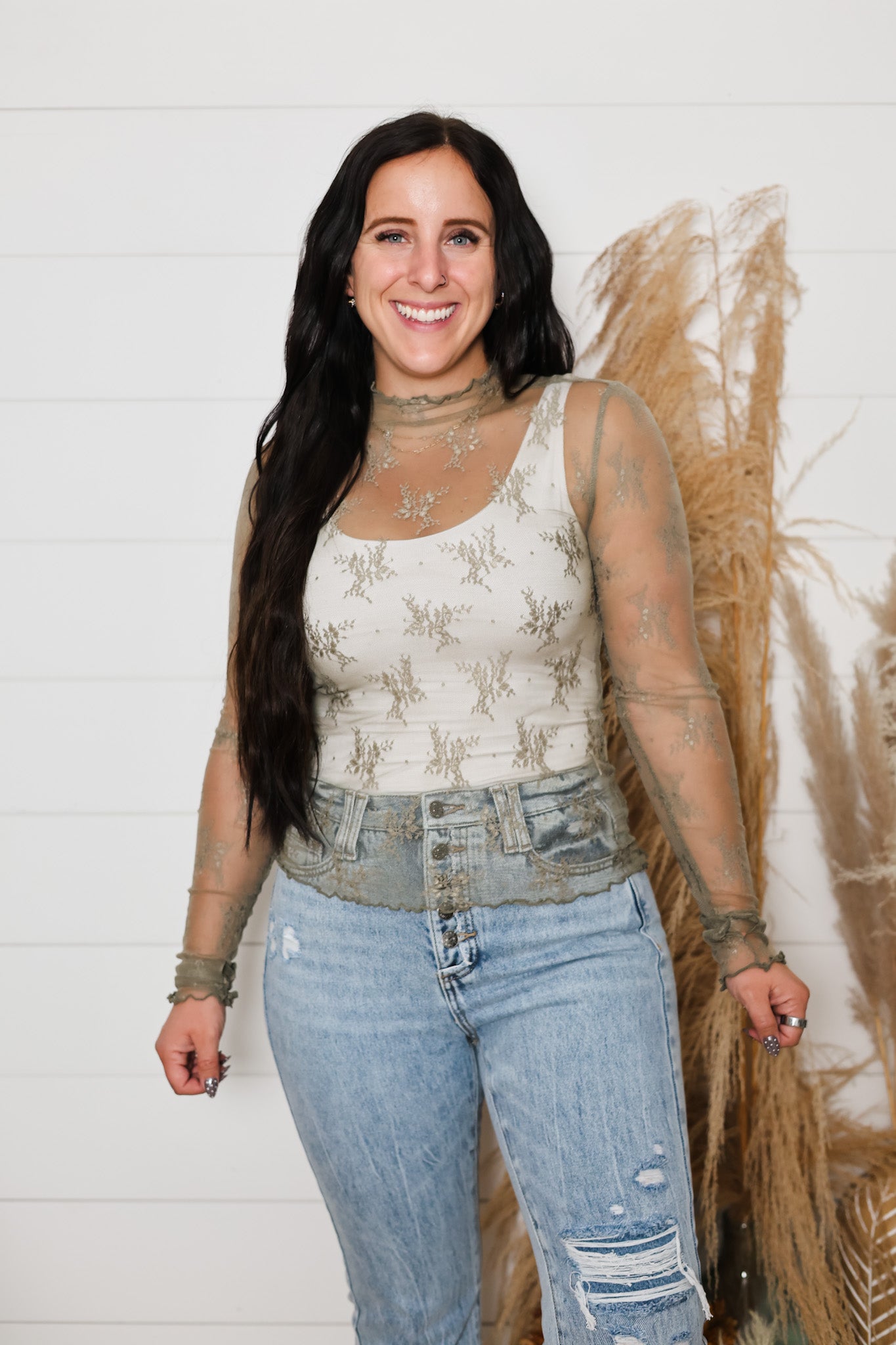 Introduce a little edge into your wardrobe with our Live Out Loud top. This mock neck lace long sleeve with thumb holes is perfect for making a statement while keeping you cozy. Stand out from the crowd and show off your unique style with this top!