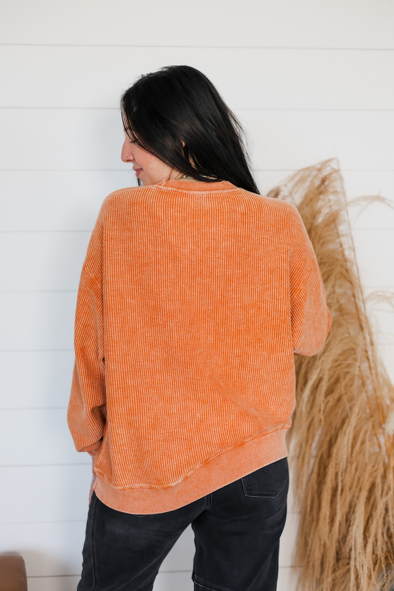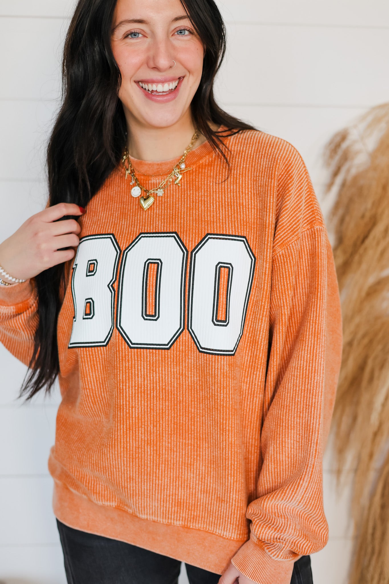 Get ready to BOO it up with our Corded Crew Top! This oversized top features bold BOO letters on the front, perfect for all your Halloween activities. With a comfortable and trendy corded crew design, you'll be ready to celebrate in style. Spooktacular!