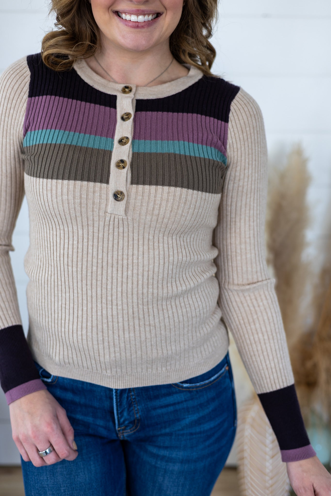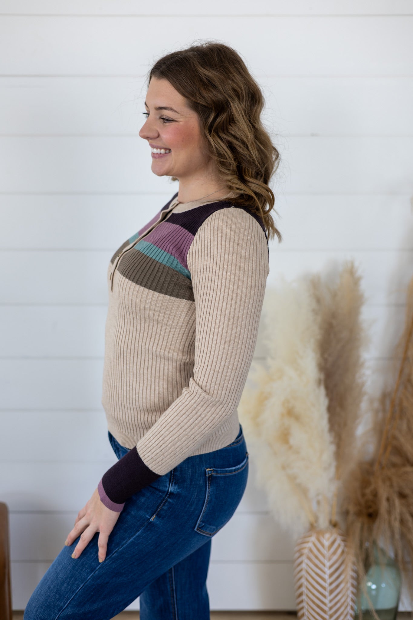 Playful meets polished with this color block rib henley sweater top. Featuring bold contrasting panels and a classic henley neckline, it's the perfect layering piece that transitions seamlessly from casual coffee runs to weekend hangouts. The ribbed knit fabric offers a flattering fit while keeping things cozy and comfortable. Mix and match the color blocks with your favorite basics for endless styling possibilities.