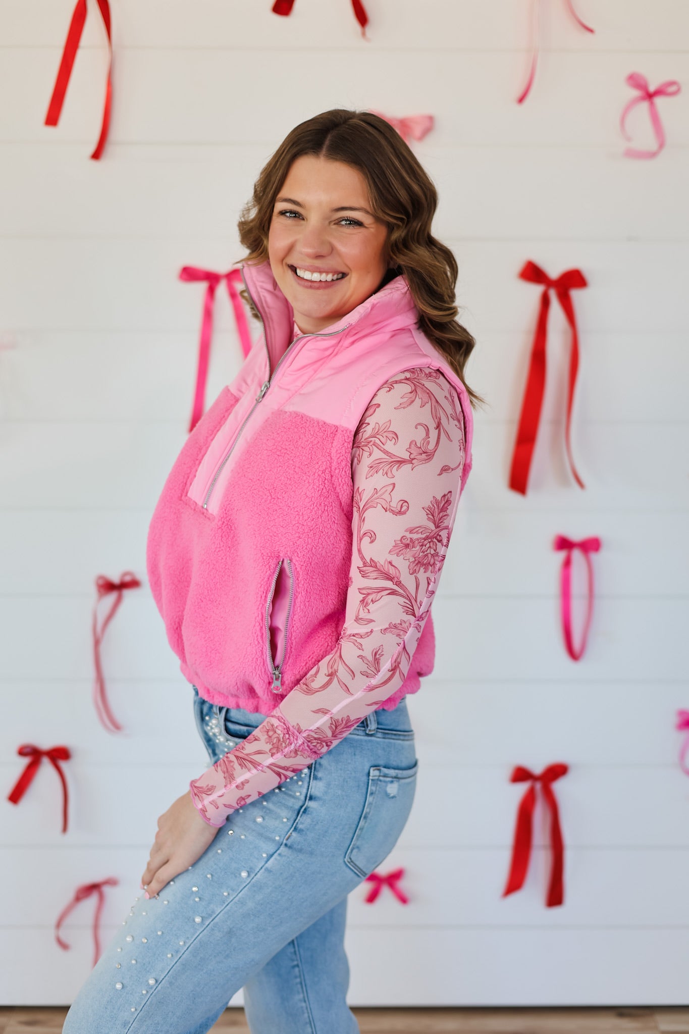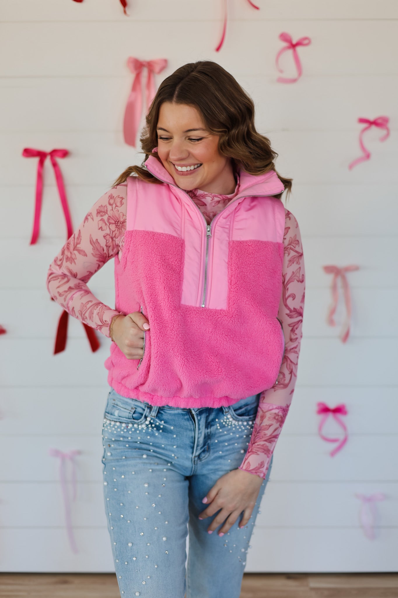 Layer up with the Out On Top Vest, your new go-to for effortless style and cozy comfort. This sherpa puffer pullover features a fun zipper detail that adds personality to any outfit, while practical pockets keep your essentials within reach. The elastic bottom ensures a flattering fit that moves with you, whether you're running errands or hanging out with friends. Perfect for those in-between weather days when you want warmth without the bulk!