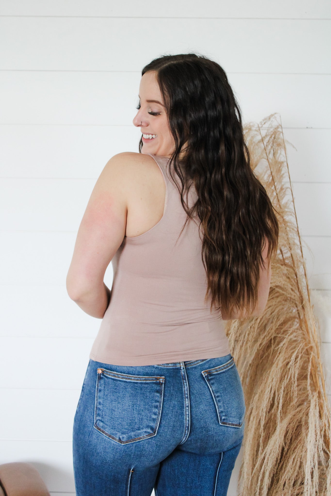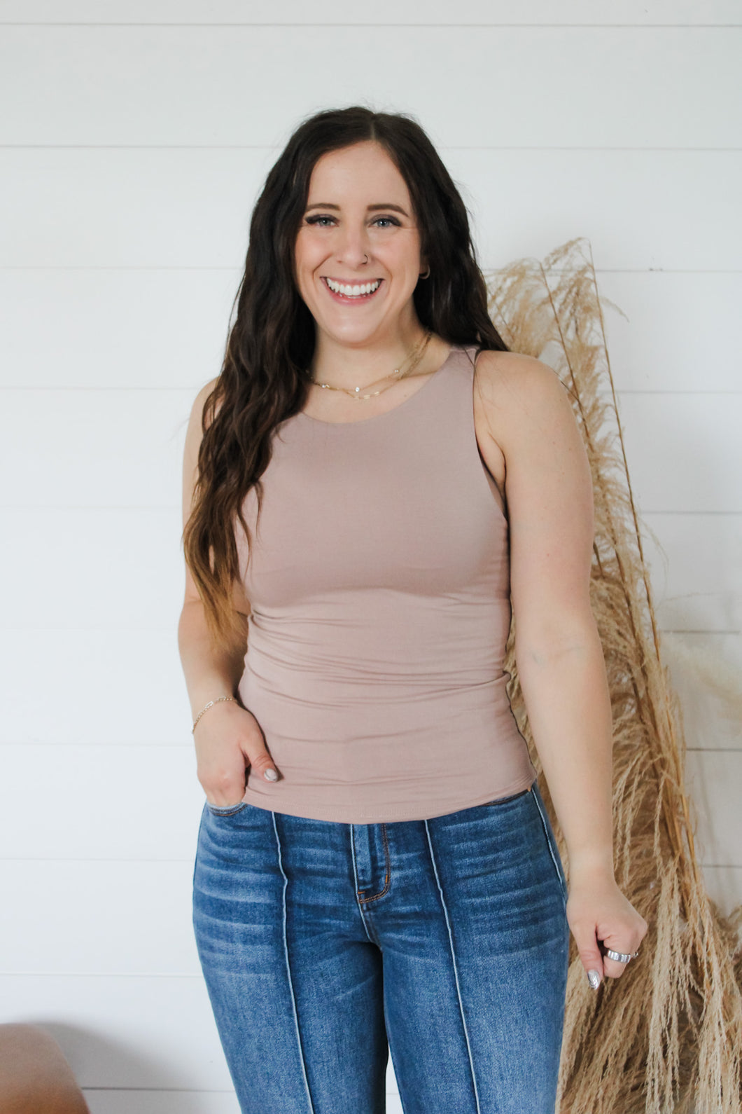 Experience effortless style with our Over Again Tank. This basic double-lined full-length boat neck design offers both coverage and comfort. The super soft knit fabric feels like a gentle hug against your skin, making it the playful piece you'll reach for again and again. Perfect for layering or wearing solo on sunny days!