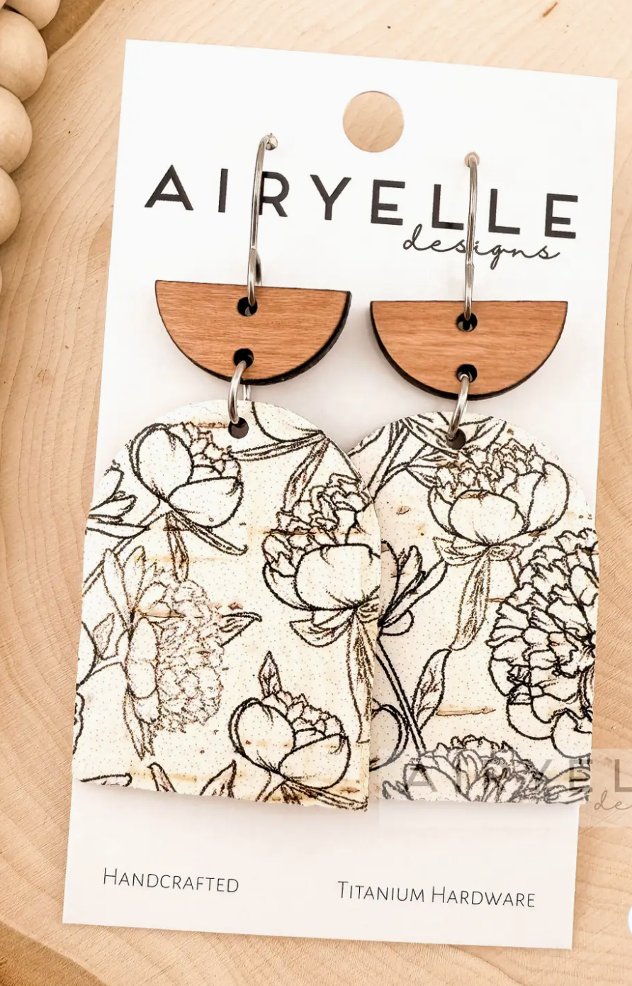 Materials: These stunning, elegant earrings are made from cherry stained wood and printed cork backed with 100% cowhide leather.