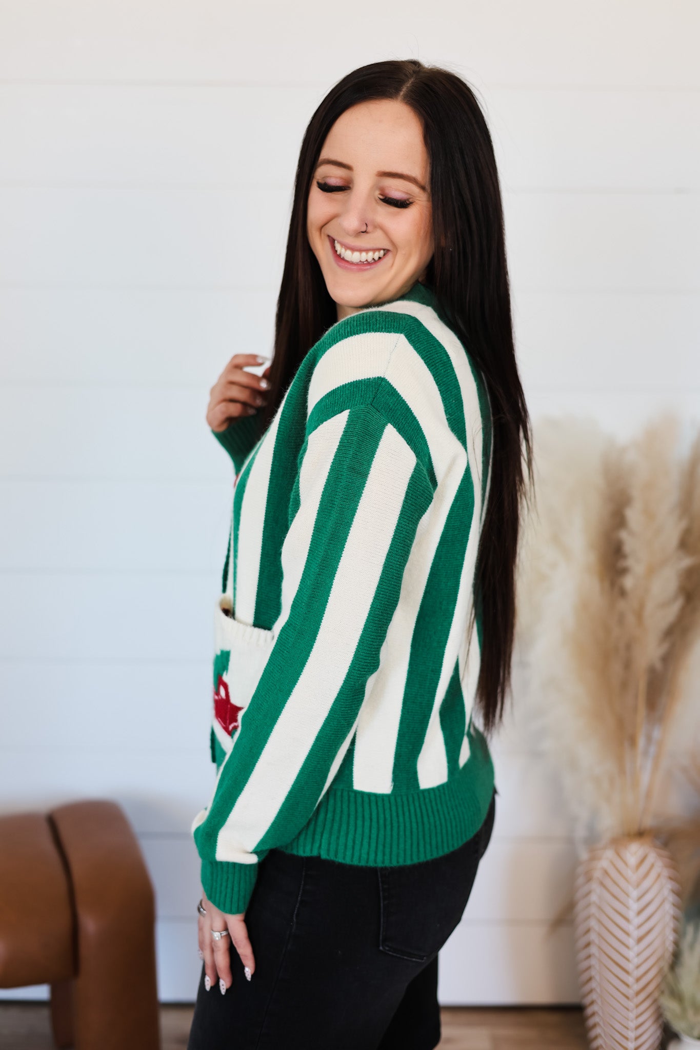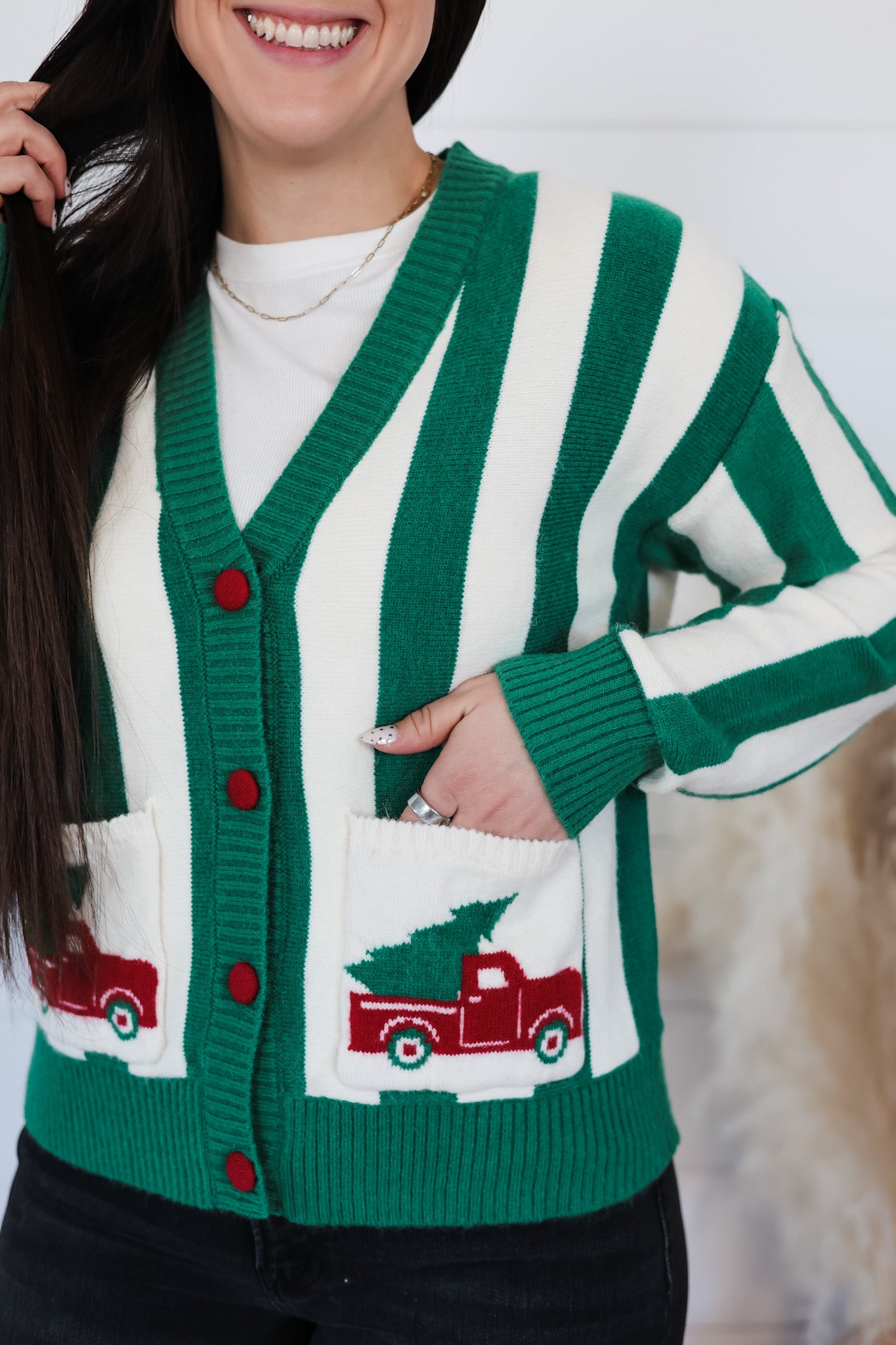 Wrap yourself in holiday cheer with this delightful cardigan featuring a charming Christmas truck print and cheerful pocket stripes. Perfect for festive gatherings, cozy nights in, or spreading seasonal joy wherever you go. The playful design captures the magic of the holidays while the comfortable fit keeps you feeling merry and bright all season long. A wardrobe essential that brings smiles and warmth to your celebrations.
