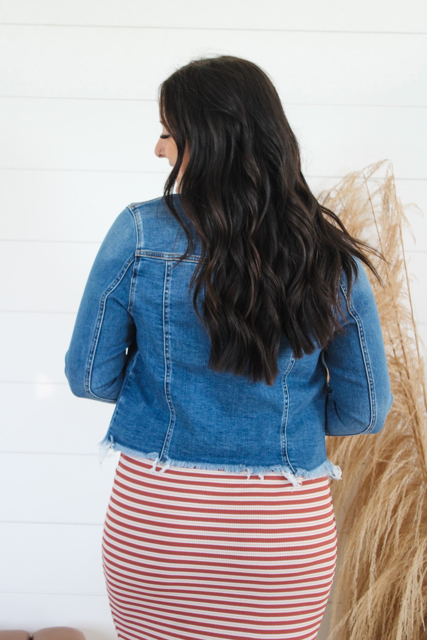 Get ready to turn heads with the Perfect Match Denim Jacket! Featuring a trendy irregular fray hem, this jacket adds a playful edge to your look. Its stretchy fabric ensures comfort and freedom of movement, making it your go-to for casual days or nights out. Embrace effortless style with a jacket that’s as fun as you are!