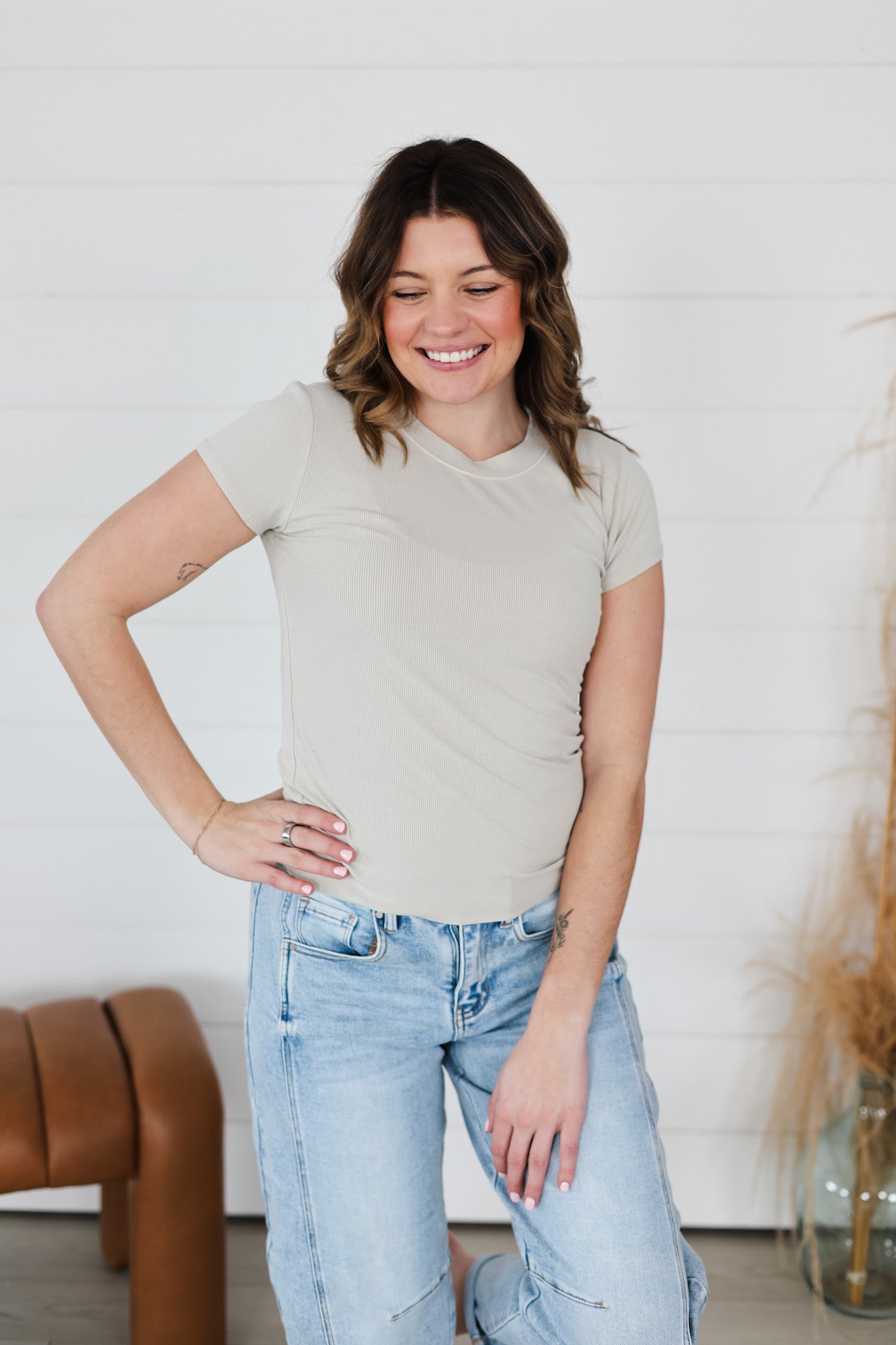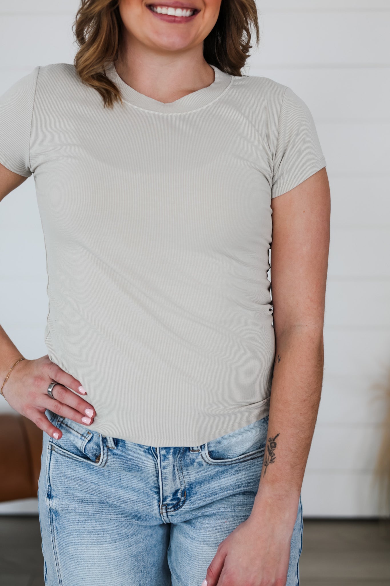 The Picture Perfect Top is your new go-to layering essential! Crafted from ultra-soft ribbed fabric that feels like a gentle hug, this tee is designed for maximum comfort without compromising on style. Whether you're pairing it under your favorite jacket or wearing it solo, its versatile design works with everything in your closet. Slip it on and discover why comfort this good deserves to be your everyday uniform.