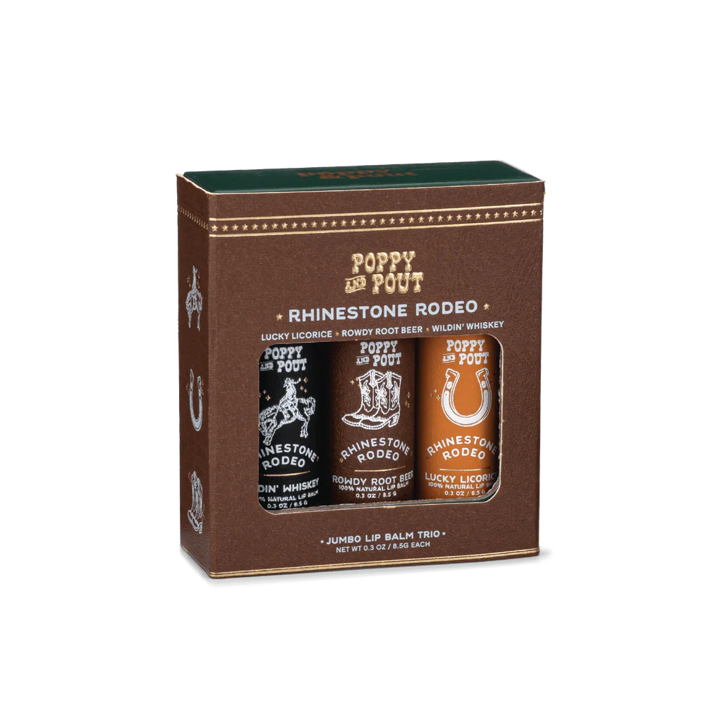 Saddle up for the smoothest lips in the West. This cowboy inspired lip balm trio features three flavors that will have you hootin' and hollerin': Wildin' Whiskey, Lucky Licorice, and Rowdy Root Beer.