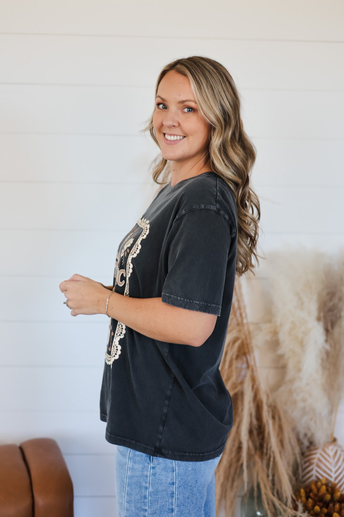 Get cozy in the Raised On Country Music Top, an oversized acid wash t-shirt designed for all-day comfort. Its roomy fit and vintage-inspired wash make it perfect for lounging or showing off your country vibes with a fun, effortless style.