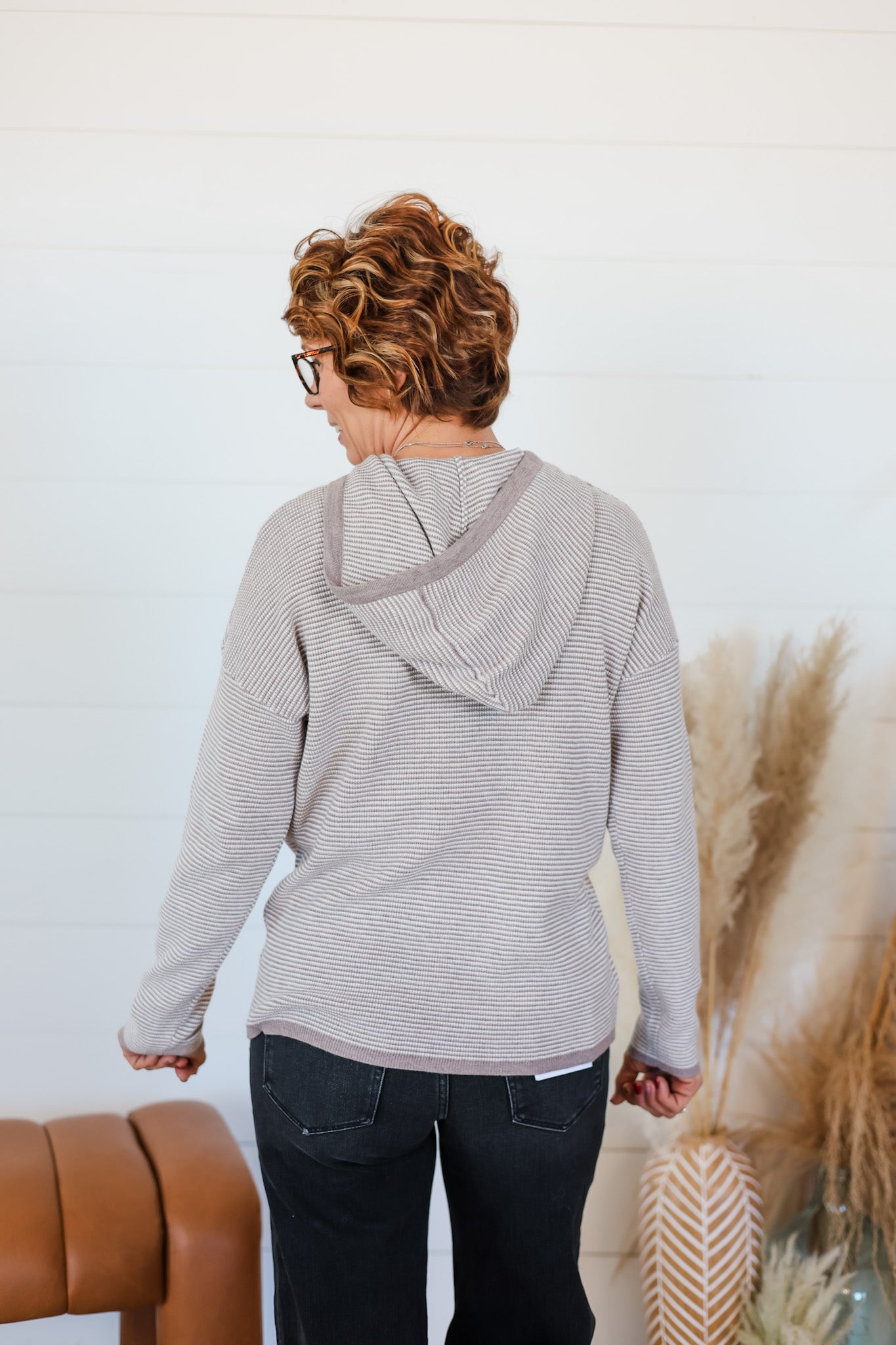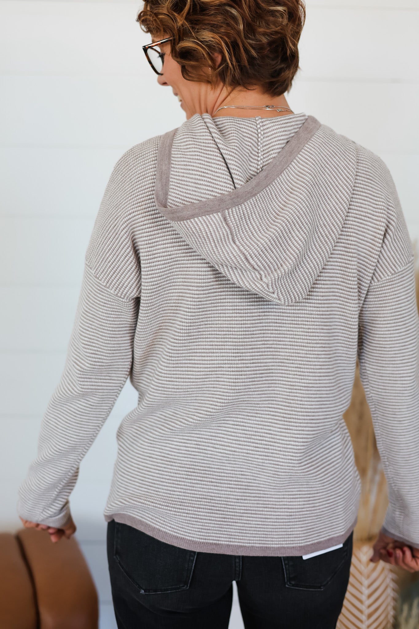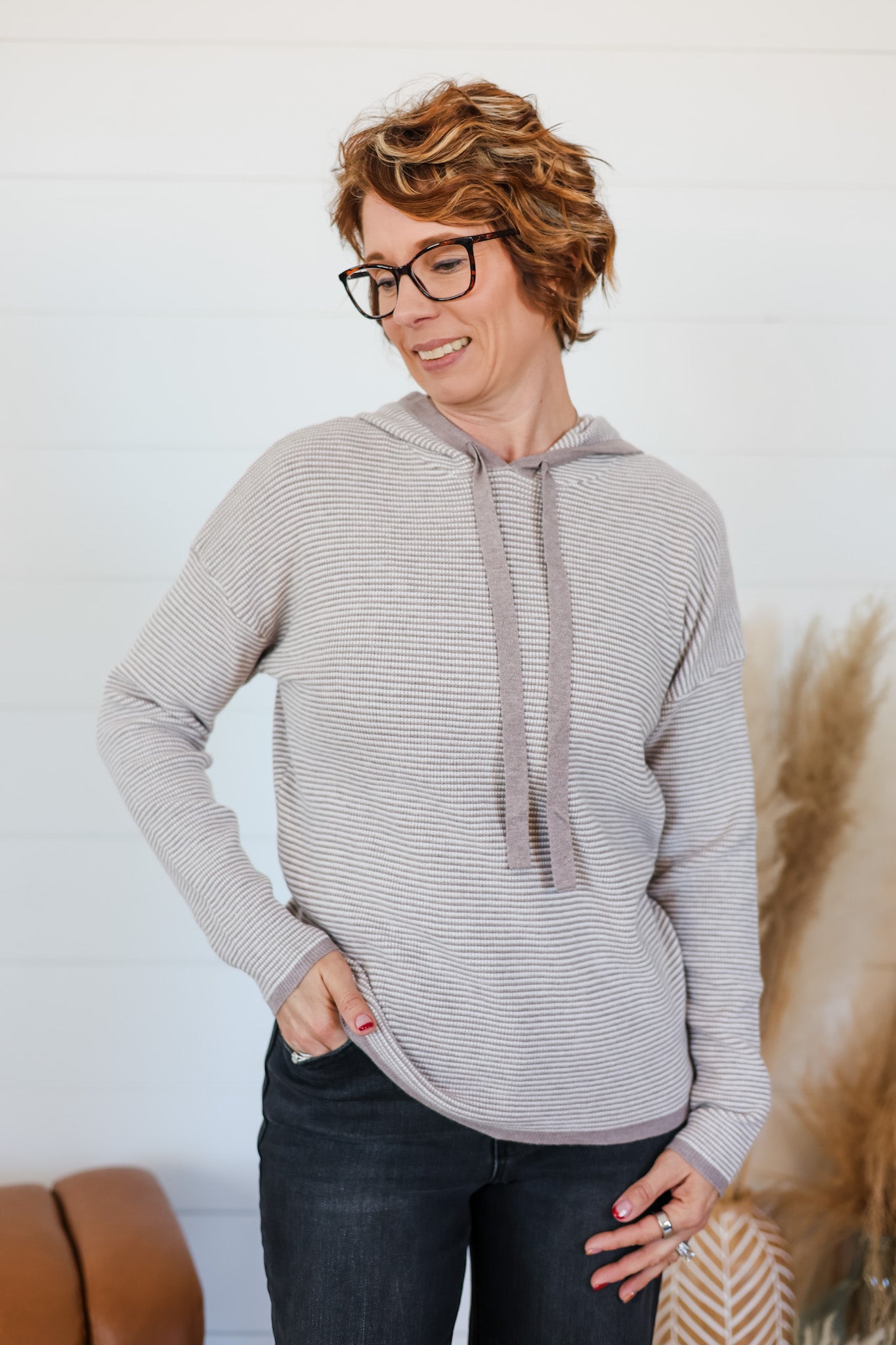 Wrap yourself in cozy comfort with this playful pullover hoodie sweater featuring a distinctive waffle texture that adds visual interest and tactile appeal. The striped design is elevated with contrasting color trim that frames the neckline and cuffs, creating a fun, modern look. Perfect for layering on chilly days or wearing solo for effortless style, this piece brings together texture and color in a way that makes you want to smile. Whether you're lounging at home or heading out for casual adventures, this hoodie delivers warmth and personality in one delightful package.