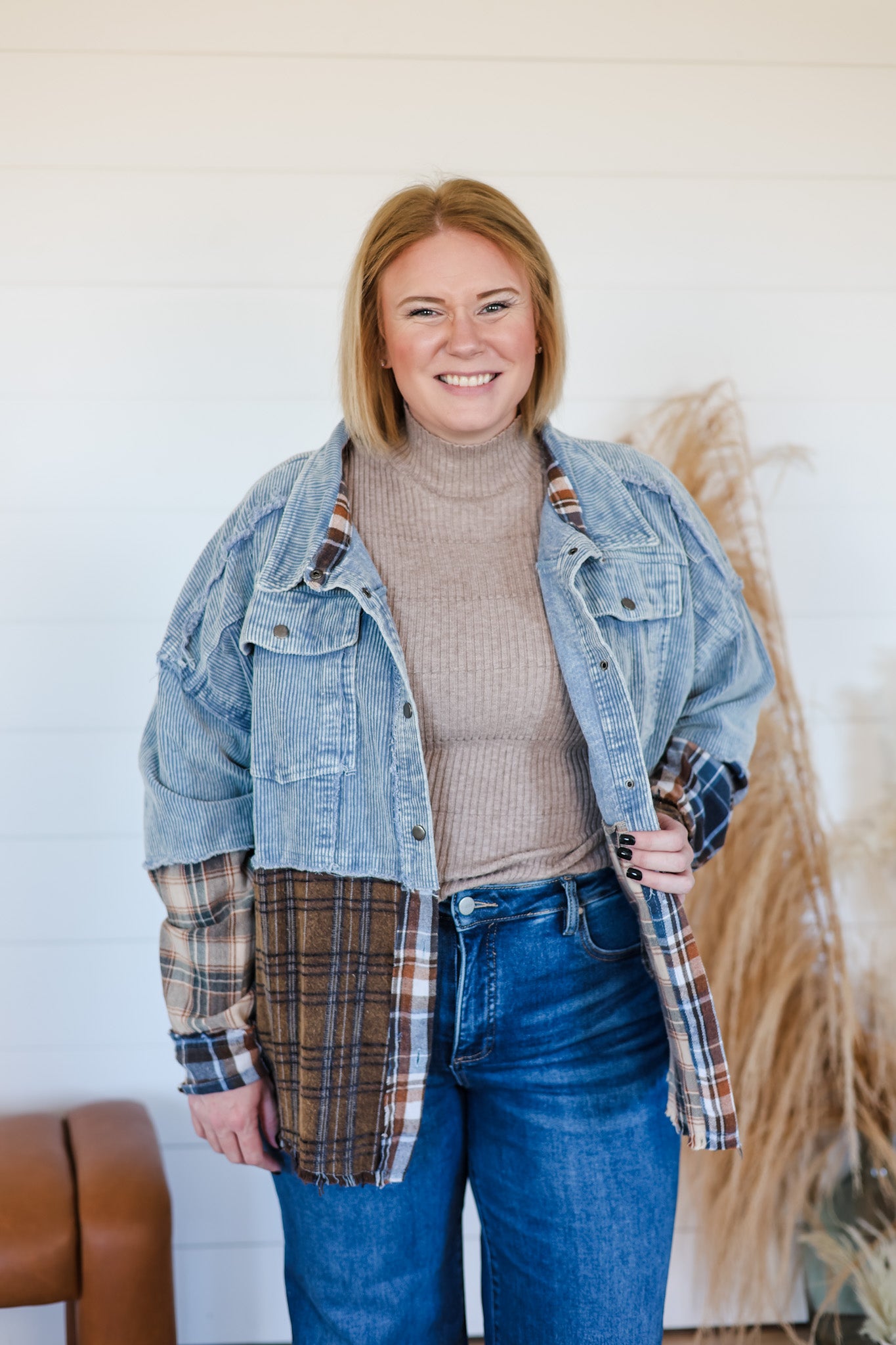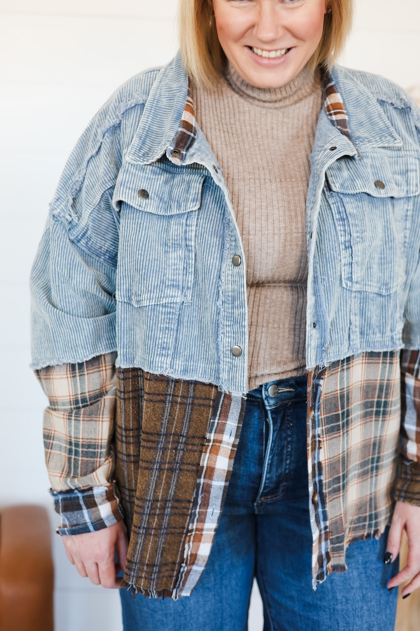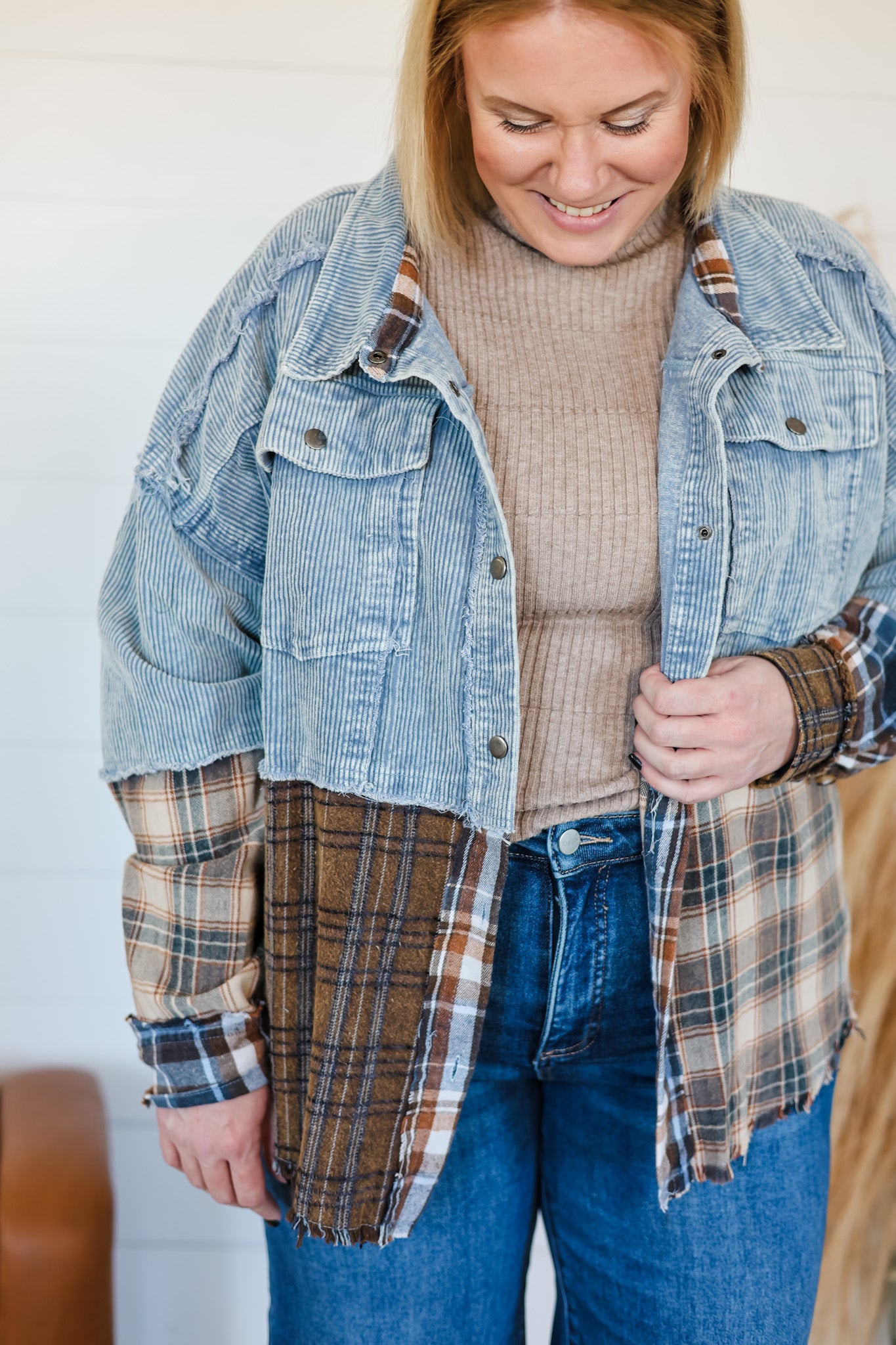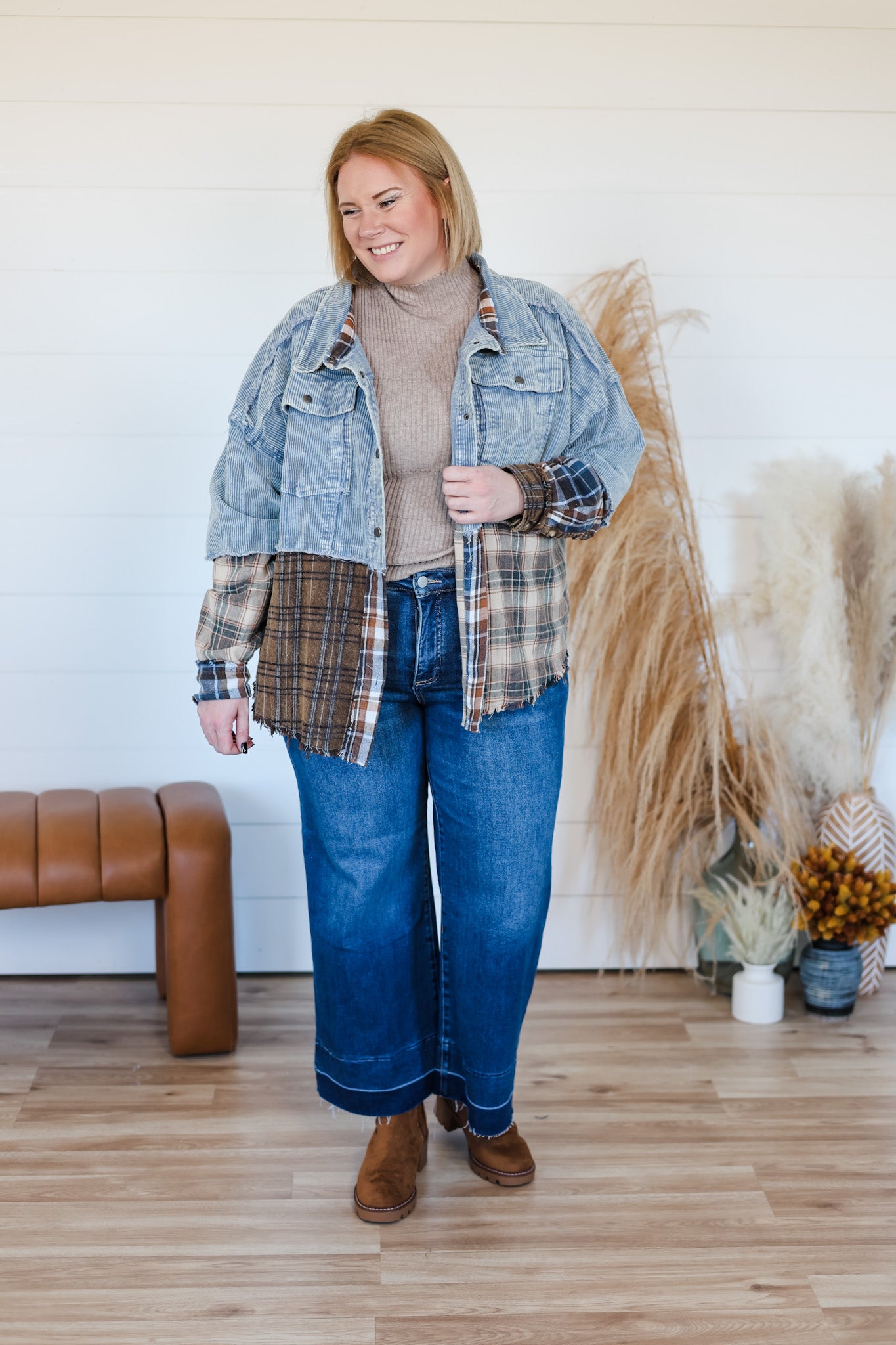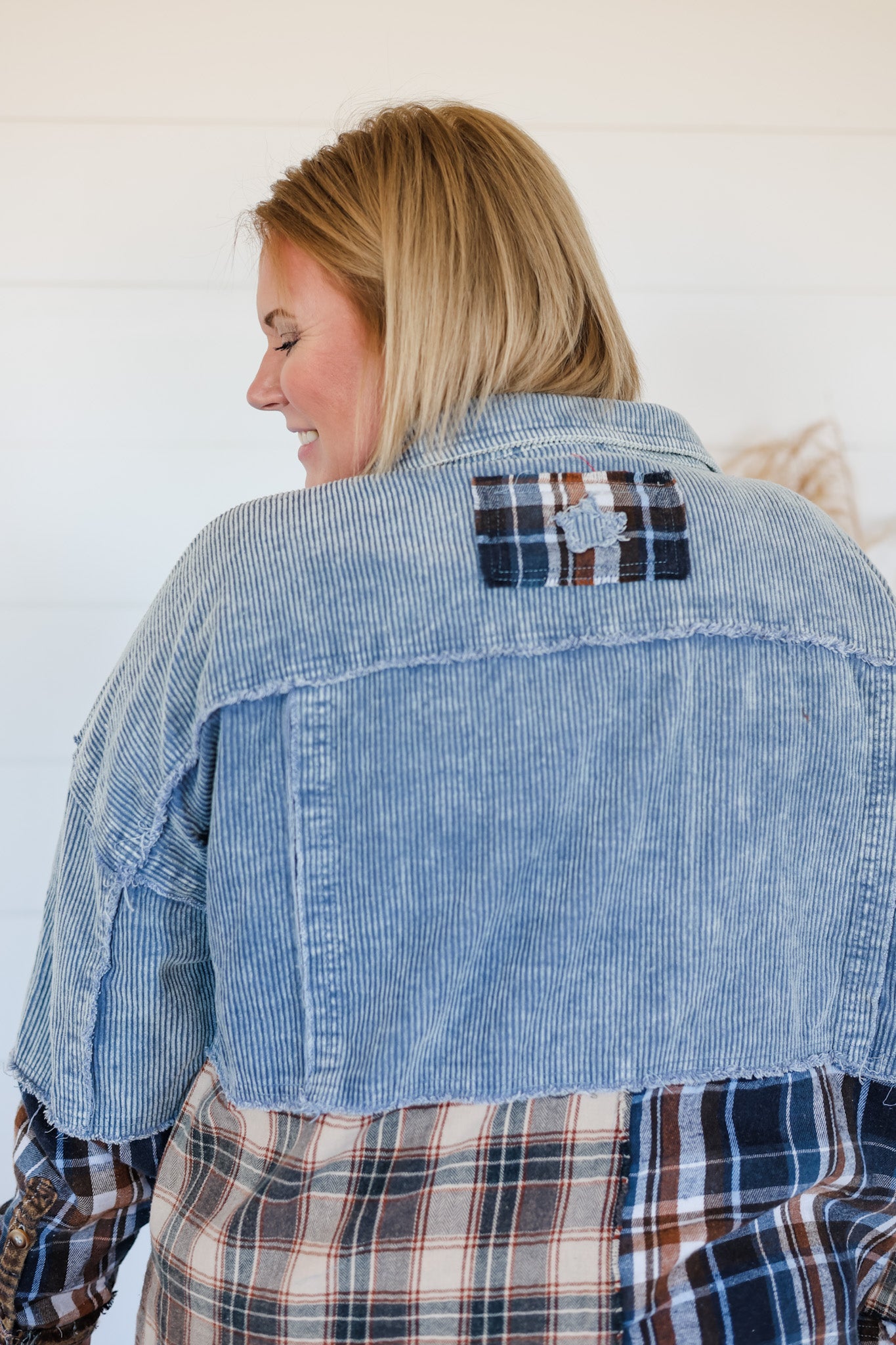 Meet the See It Through Top—a playful take on classic style with washed denim plaid and bold color blocking. Its stretchy fabric keeps you comfy all day, while the oversized fit lets you embrace cozy, laid-back vibes with a twist. Perfect for layering or rocking solo, this jacket adds a fun, fresh edge to any outfit.