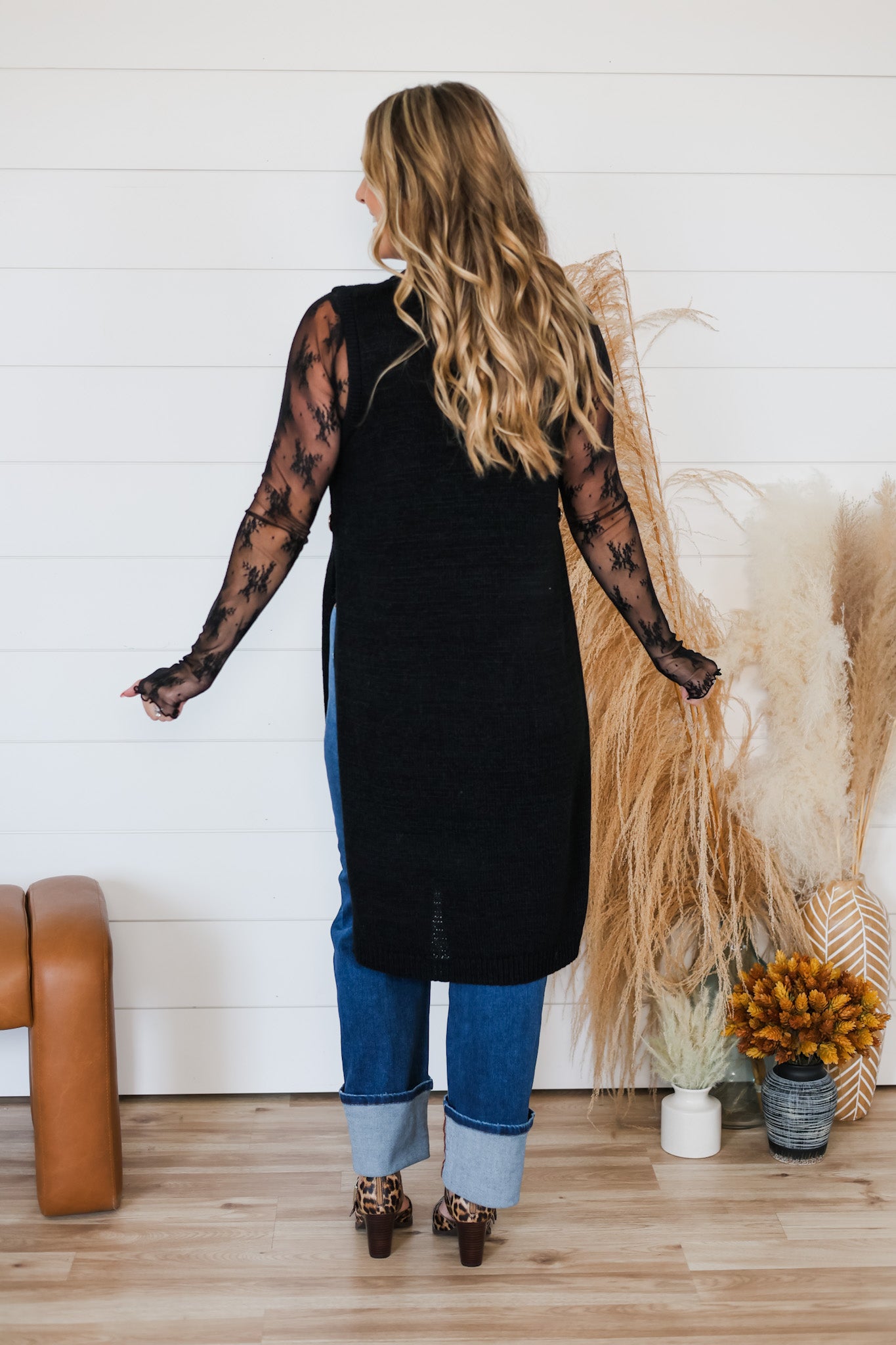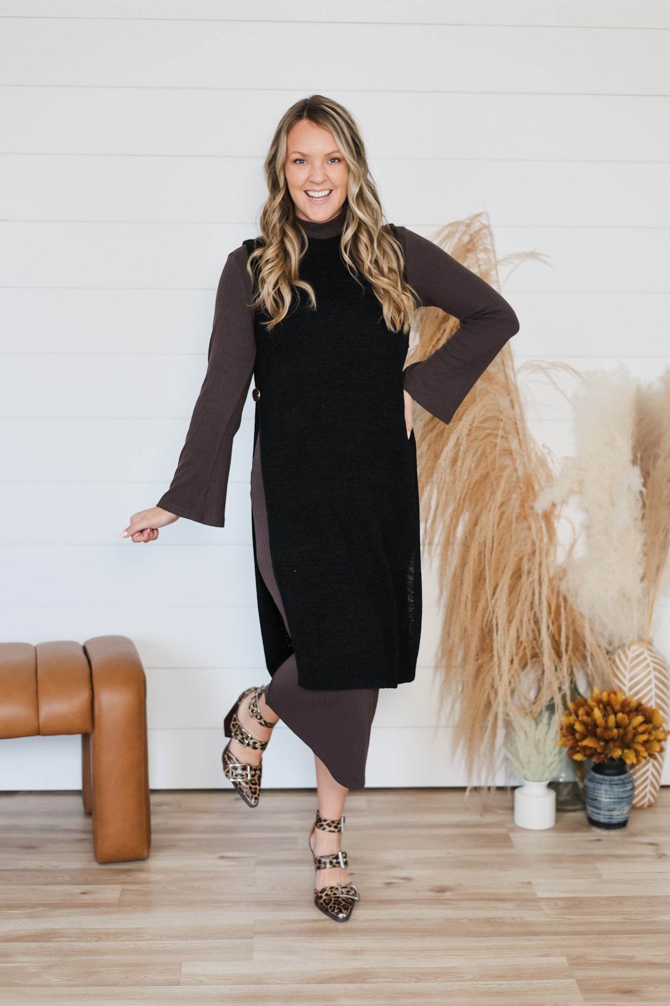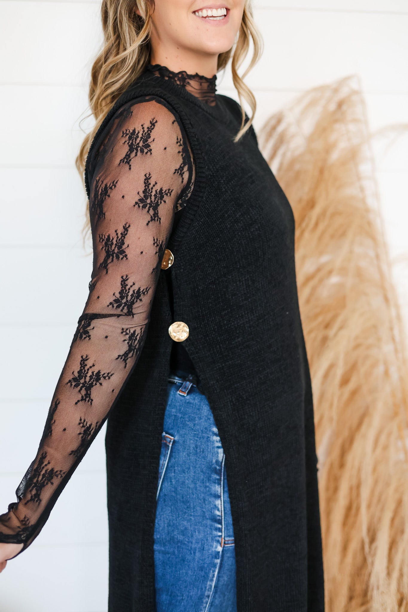Slip into cozy charm with this side button sleeveless open longline sweater. Its playful design layers perfectly over your favorite tops, adding a fun twist to your outfit while keeping you comfy. The longline cut creates a flattering silhouette, and the side buttons offer a little extra flair you can button up or leave open for an easygoing look. Perfect for those days when you want to mix comfort with style effortlessly.