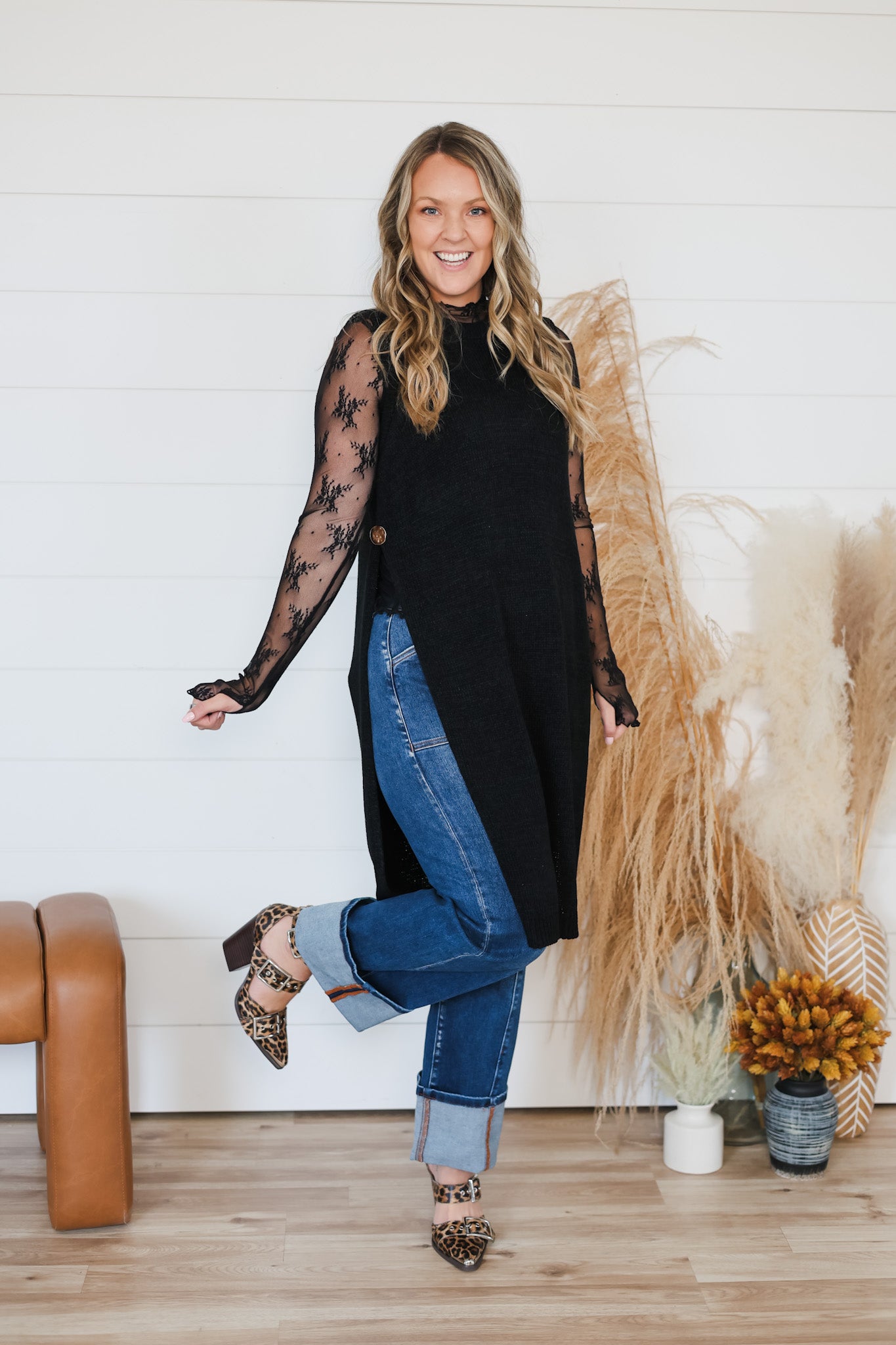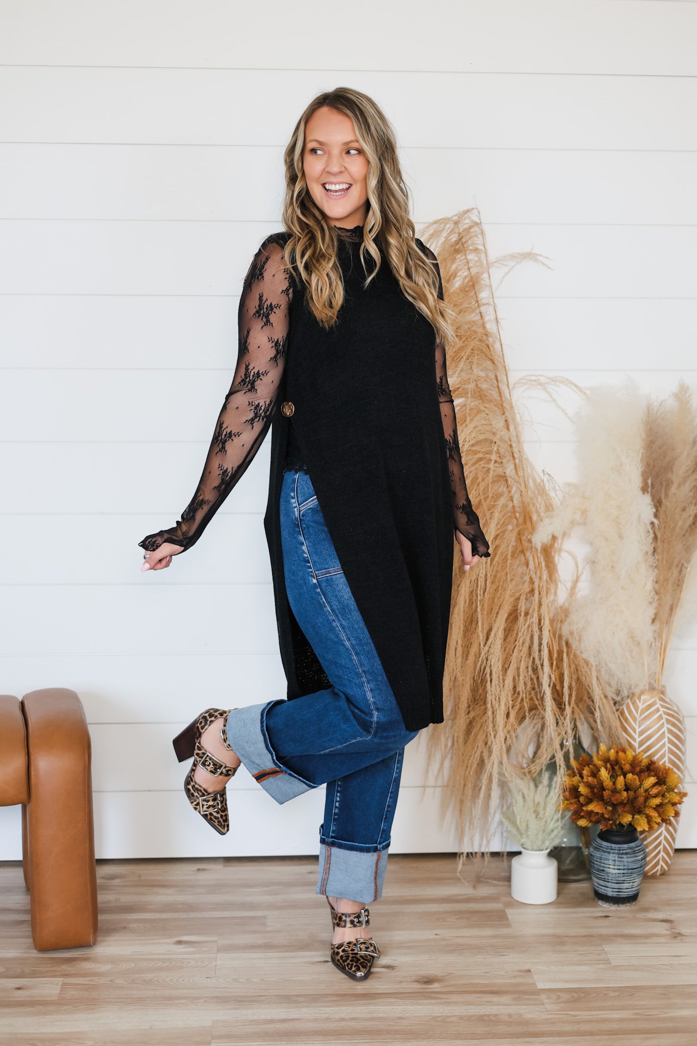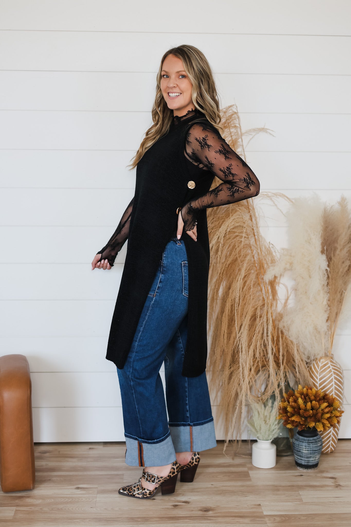 Slip into cozy charm with this side button sleeveless open longline sweater. Its playful design layers perfectly over your favorite tops, adding a fun twist to your outfit while keeping you comfy. The longline cut creates a flattering silhouette, and the side buttons offer a little extra flair you can button up or leave open for an easygoing look. Perfect for those days when you want to mix comfort with style effortlessly.