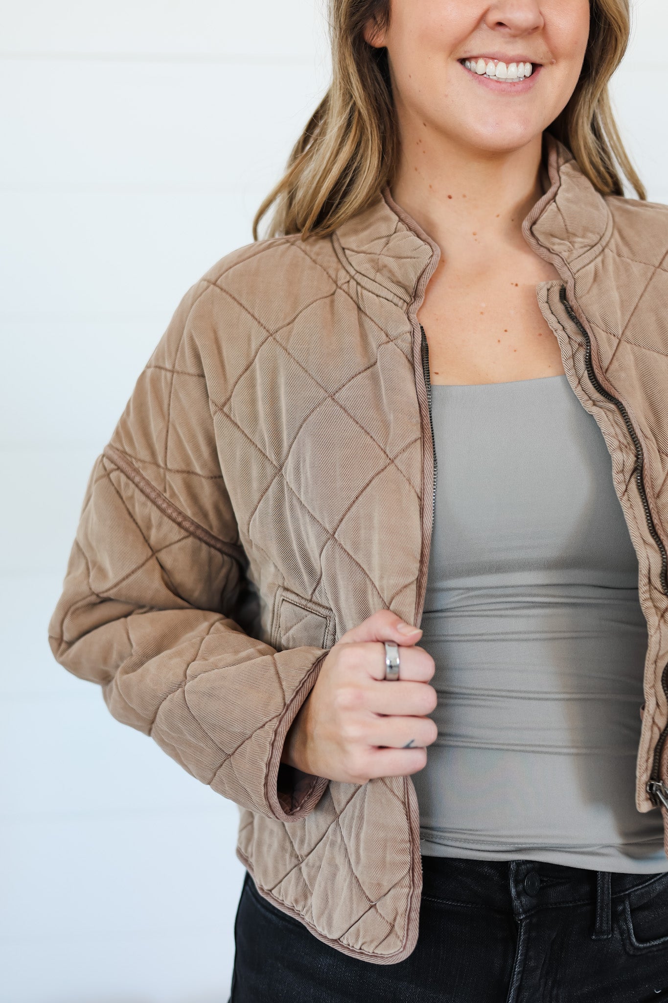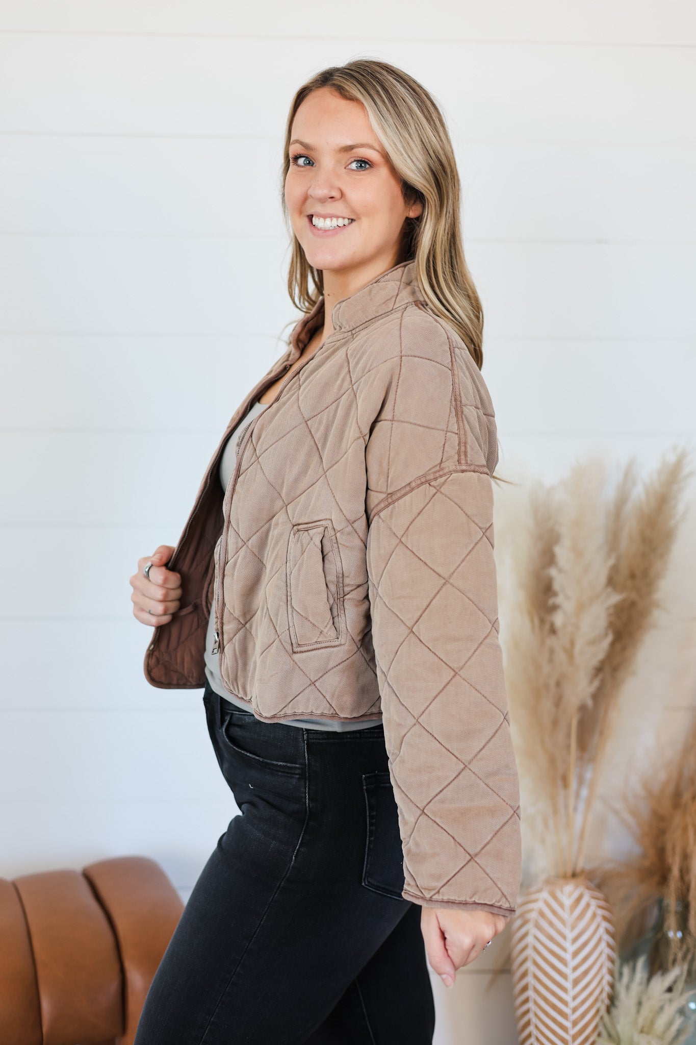 Stay cozy in style with the Seek Me Out Jacket—a cropped quilted puffer that's ready for anything. Featuring a relaxed drop shoulder silhouette and long sleeves, this jacket layers effortlessly over your favorite pieces. Zip up the front, stash your essentials in the side pockets, and embrace that perfectly oversized vibe. Whether you're running errands or catching up with friends, this playful puffer keeps you warm without the bulk.