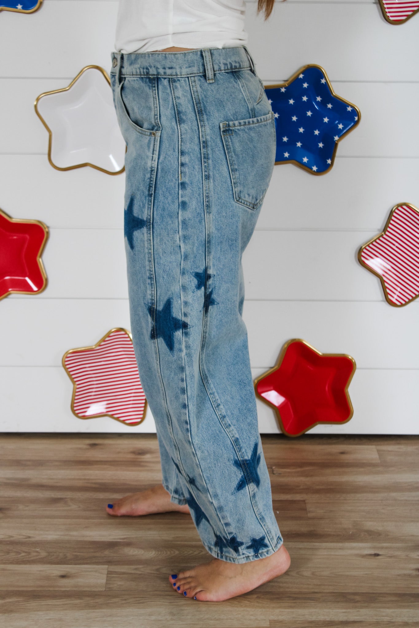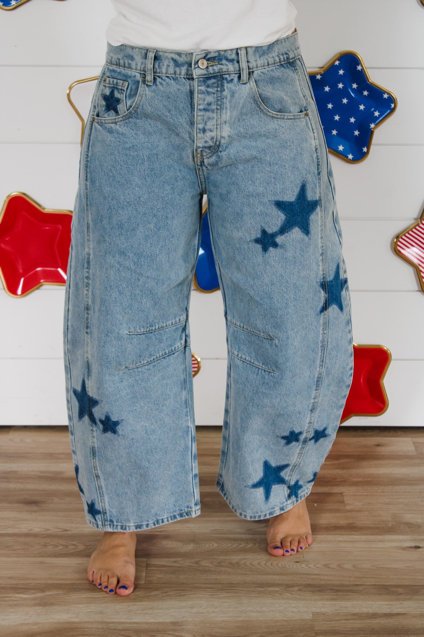 Add a touch of celestial charm to your wardrobe with our Stars In Our Eyes Denim. This mineral-washed barrel denim features subtle star details that sparkle with every step, blending comfort and style effortlessly. Perfect for those who love a playful twist on classic denim.