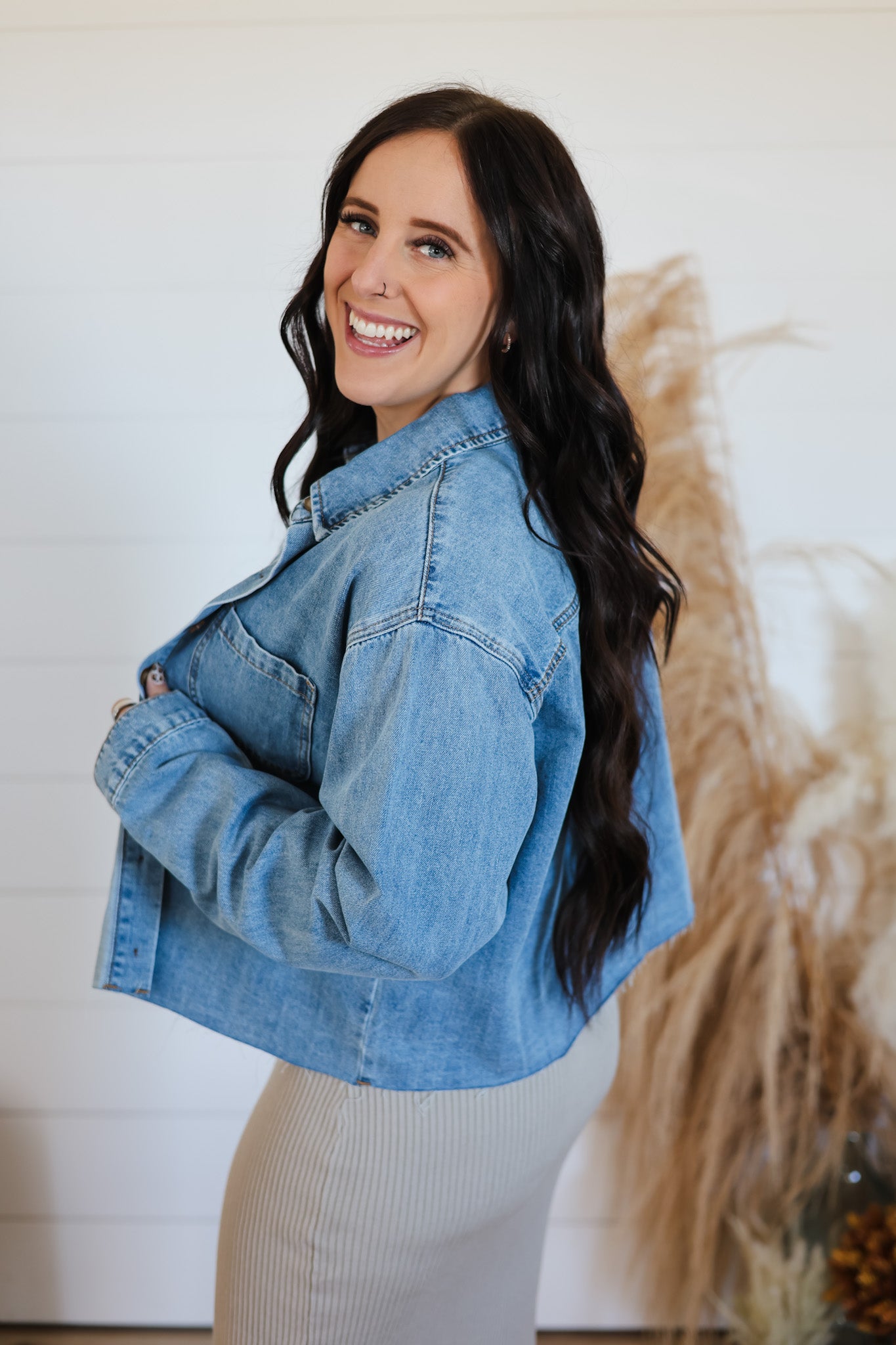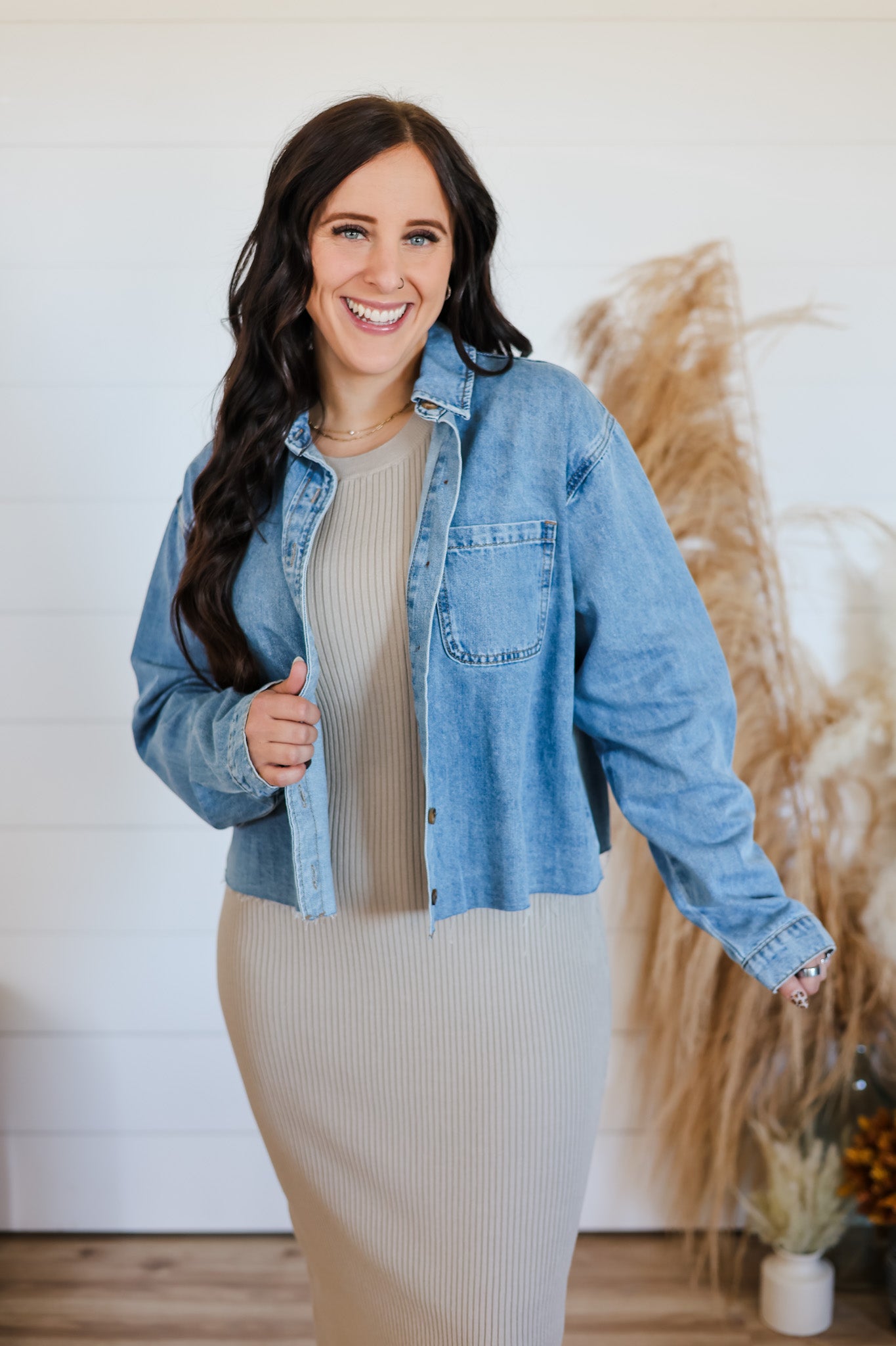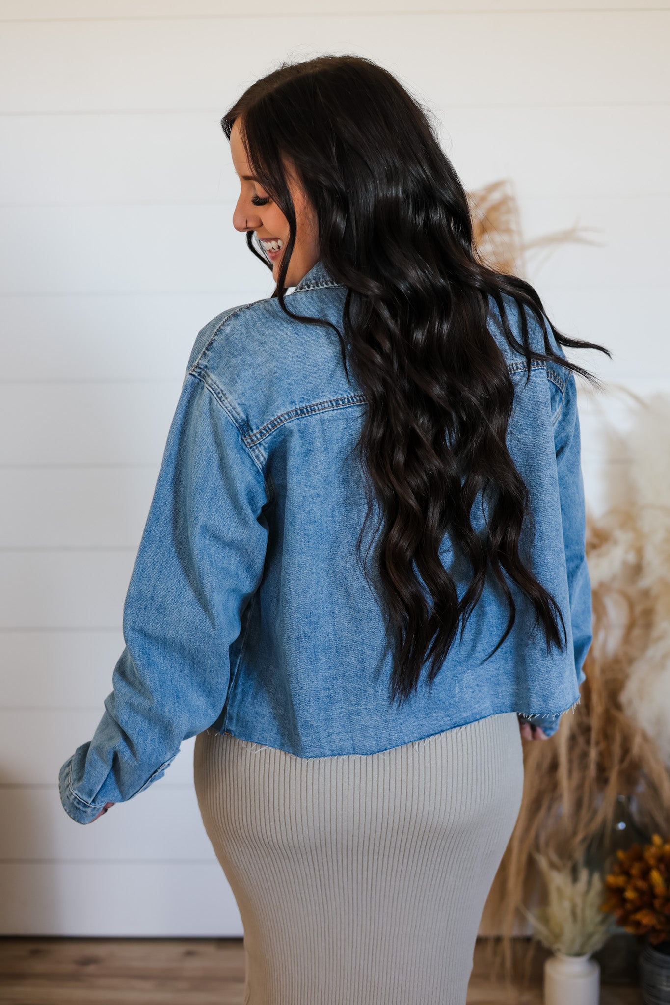The Stay This Happy Top is a playful twist on the classic denim shirt, featuring cool raw edges that add a carefree, undone vibe. Its button-up front comes with fully functional buttons, making it easy to style and perfect for layering. Whether you're dressing up or down, this top keeps your look effortlessly fun and fresh.