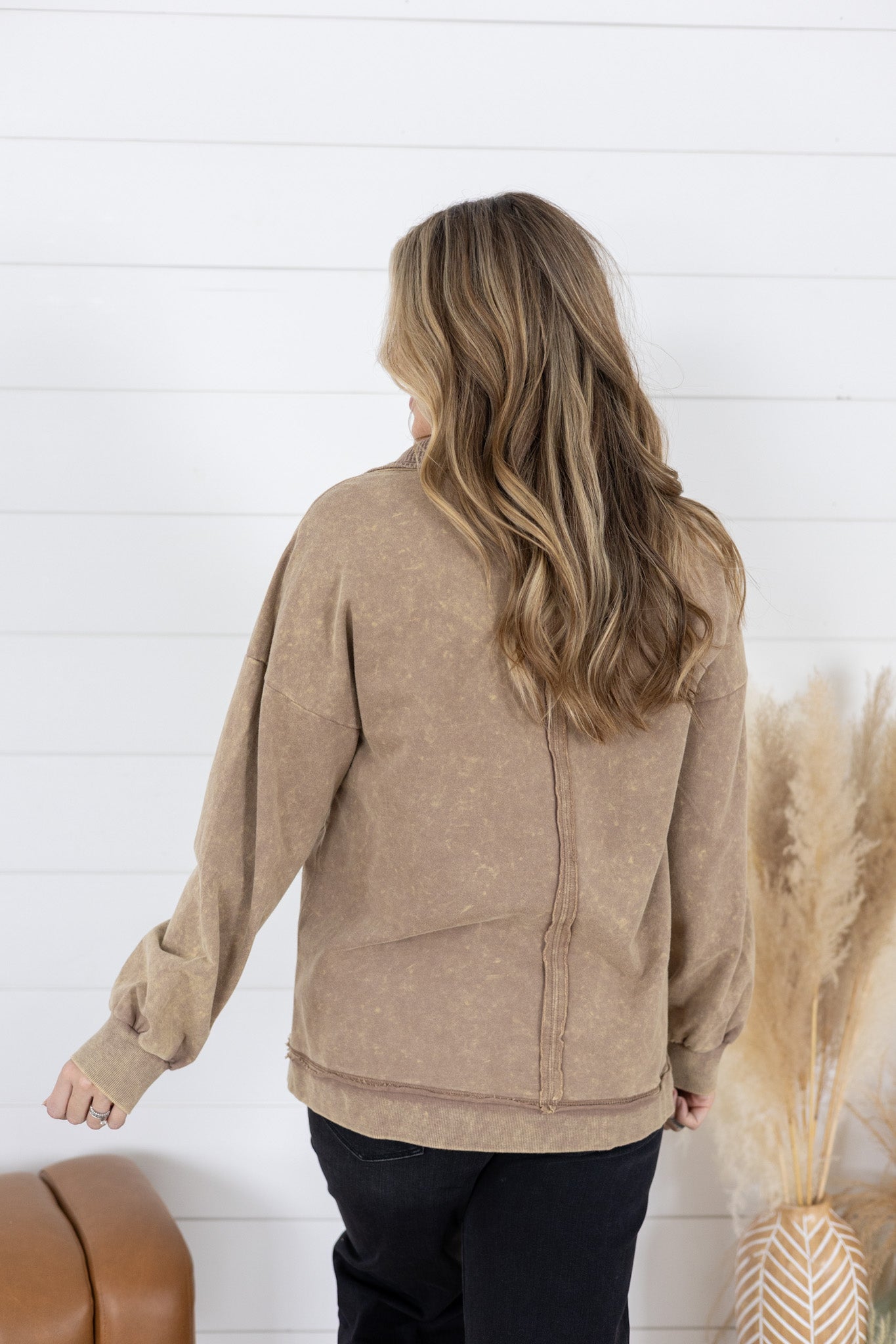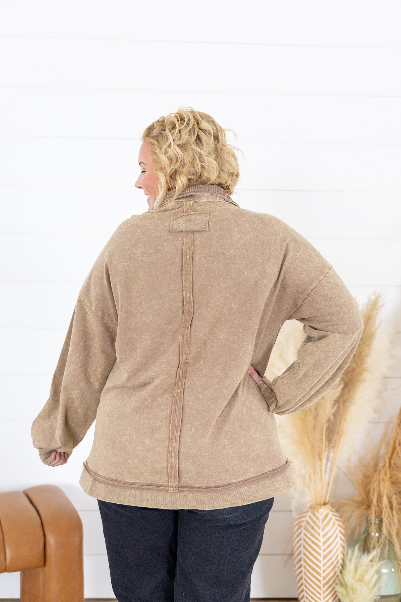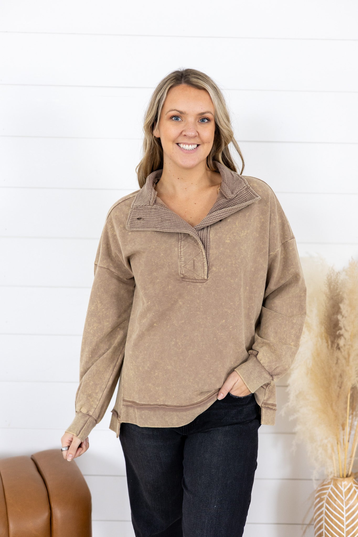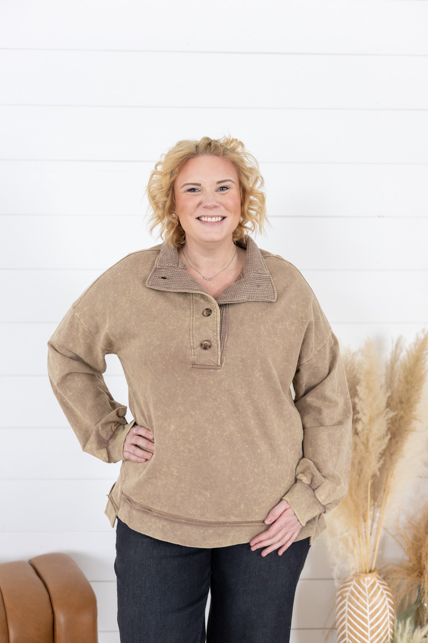 Slip into effortless comfort with the Take Care Top, your new go-to for cozy-chic vibes. This oversized beauty features a mock neck and half button-down front for easy layering, paired with relaxed drop shoulders and long sleeves in soft French terry knit. The mineral wash gives it that perfectly lived-in look, making it ideal for casual days when you want to feel put-together without trying too hard. Throw it on with your favorite jeans and you're ready to take on the world—or at least your coffee run.