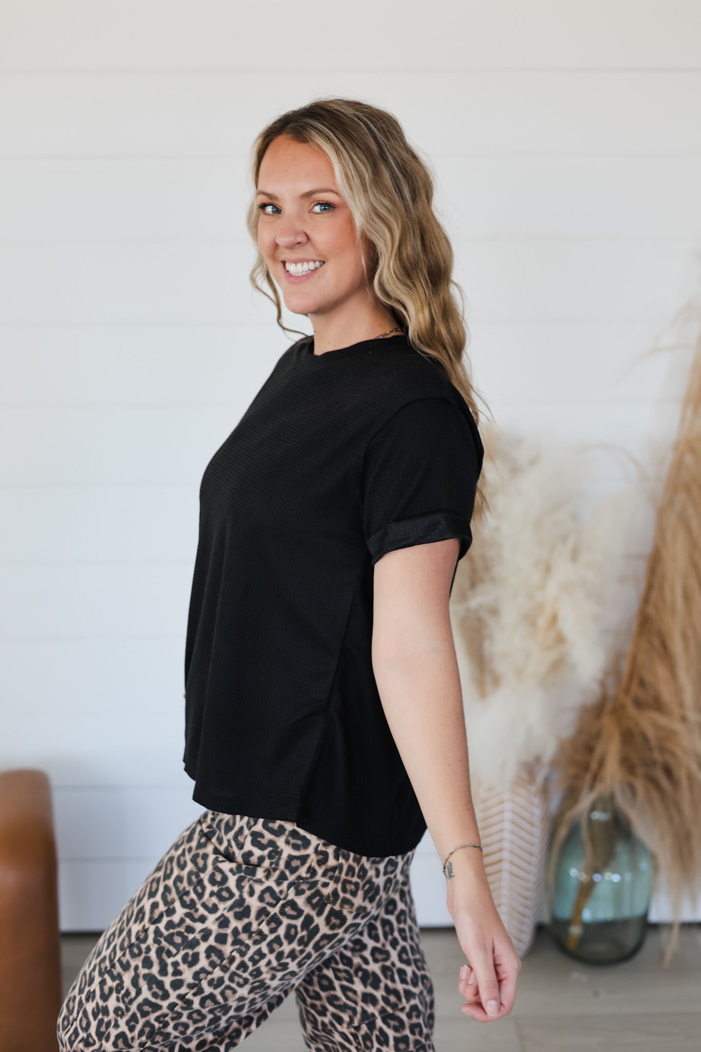 Effortlessly cool and undeniably comfy, the Turn It Into Top is your new go-to for laid-back style. This loose-fit waffle knit tee features a relaxed silhouette that works with everything in your closet—dress it up with tailored trousers or keep it casual with your favorite jeans. The textured waffle knit adds visual interest while the short sleeves make it perfect for layering or wearing solo. Whether you're running errands or grabbing coffee with friends, this top delivers that "I woke up like this" vibe without any effort required.