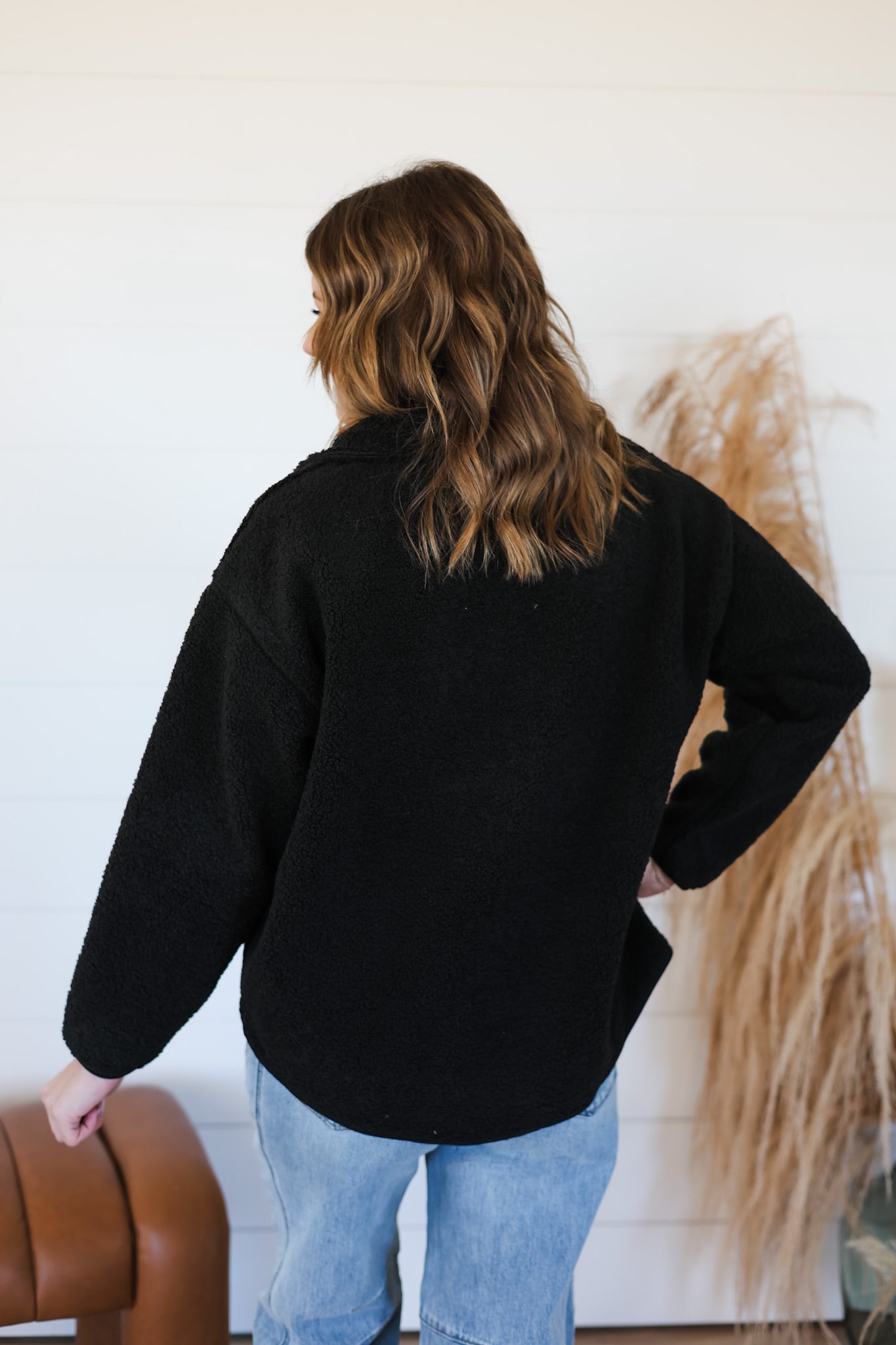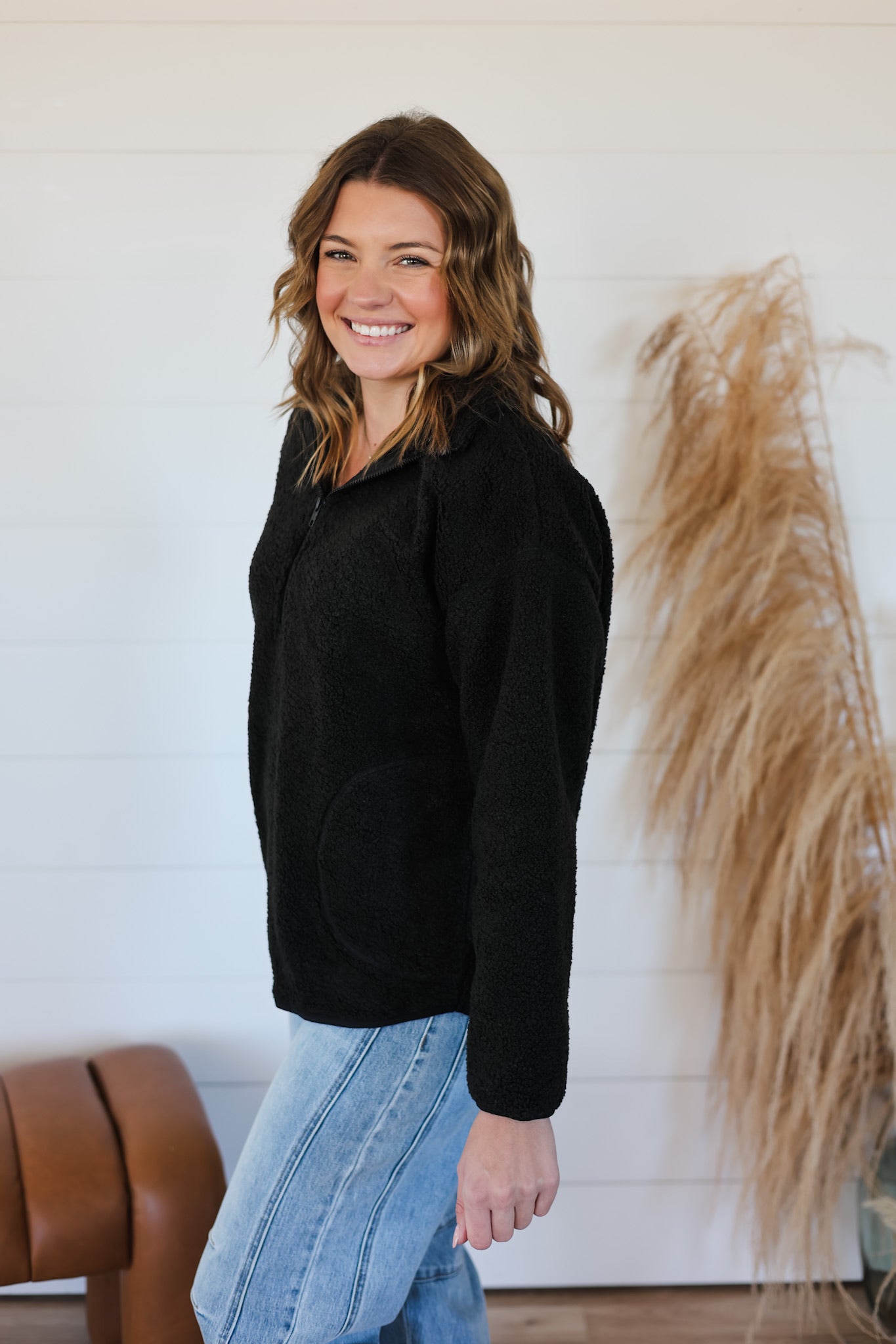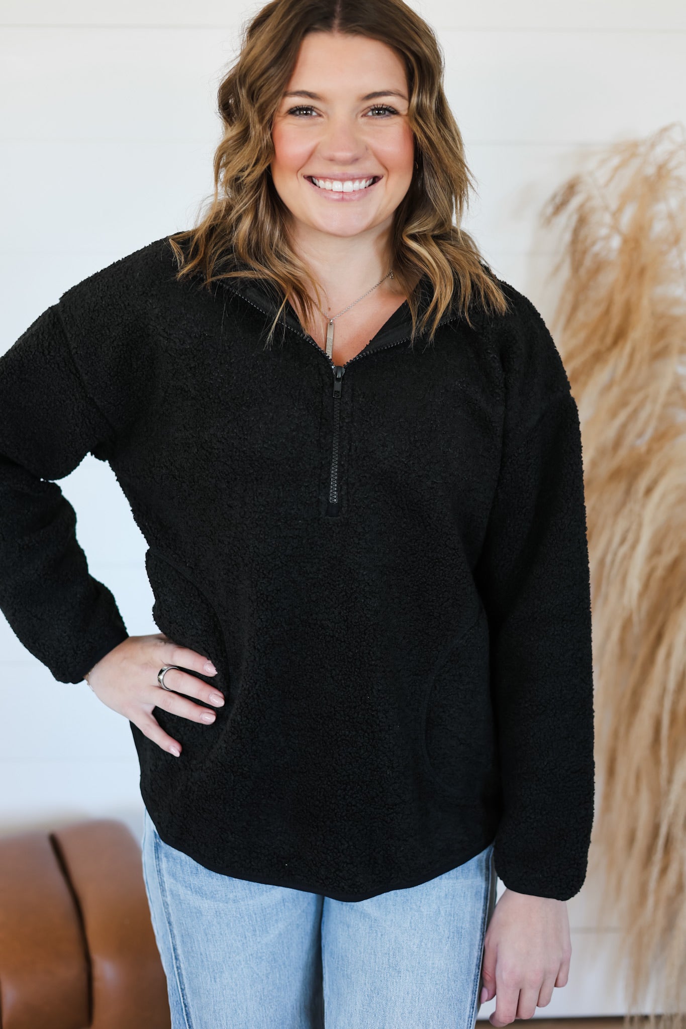 As an industry expert, the Waiting For You Top is the perfect addition to your wardrobe. This oversized sherpa half zip pullover provides ultimate comfort, while the stretchy fabric ensures a flattering fit. Complete with side pockets for convenience, this top is a must-have for any fashion-forward individual.